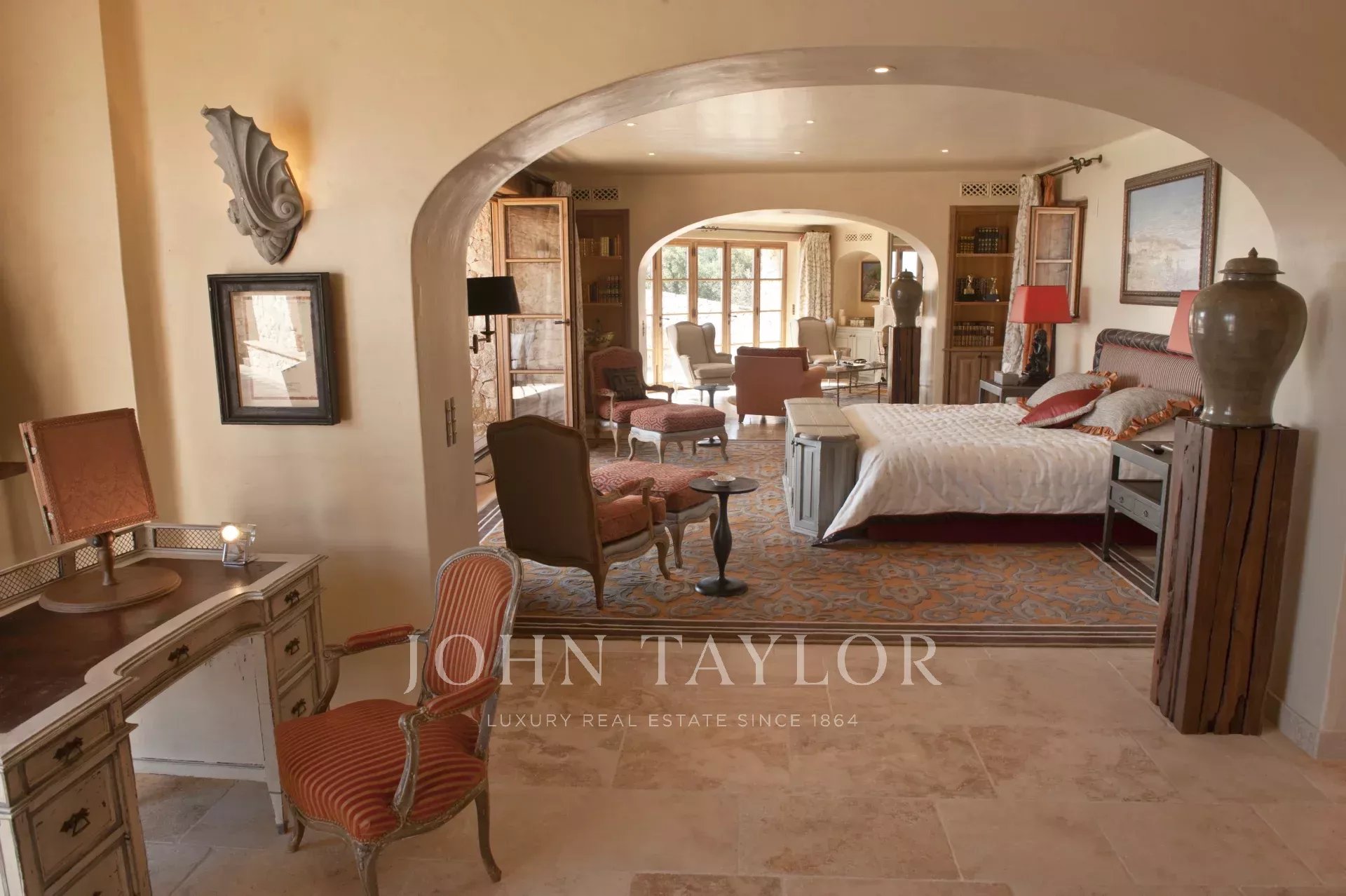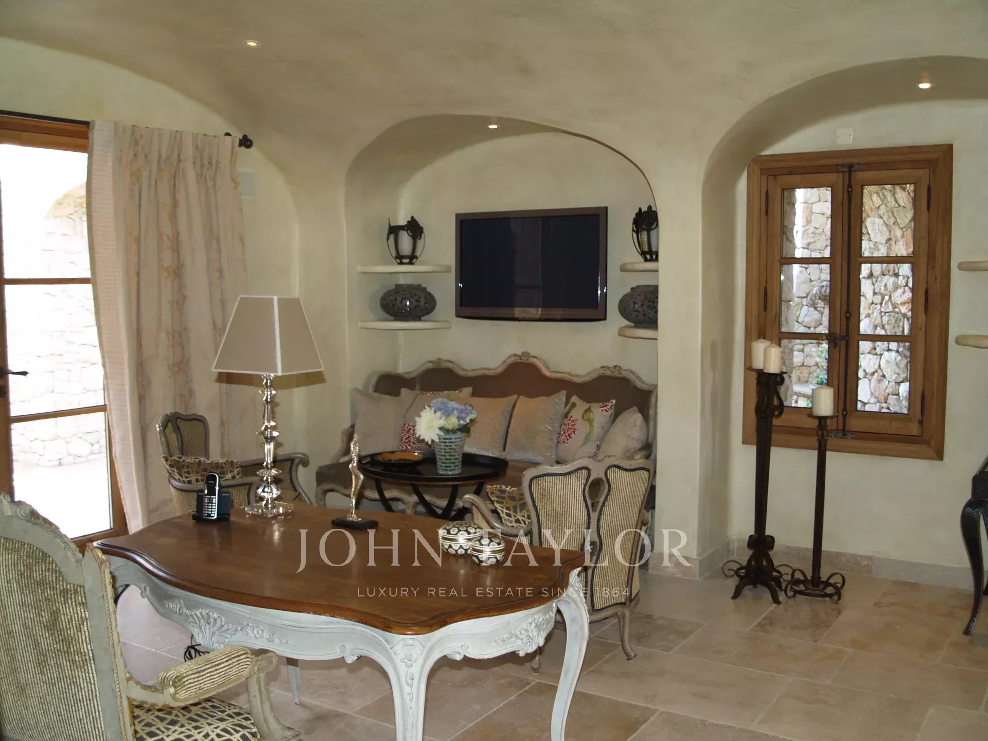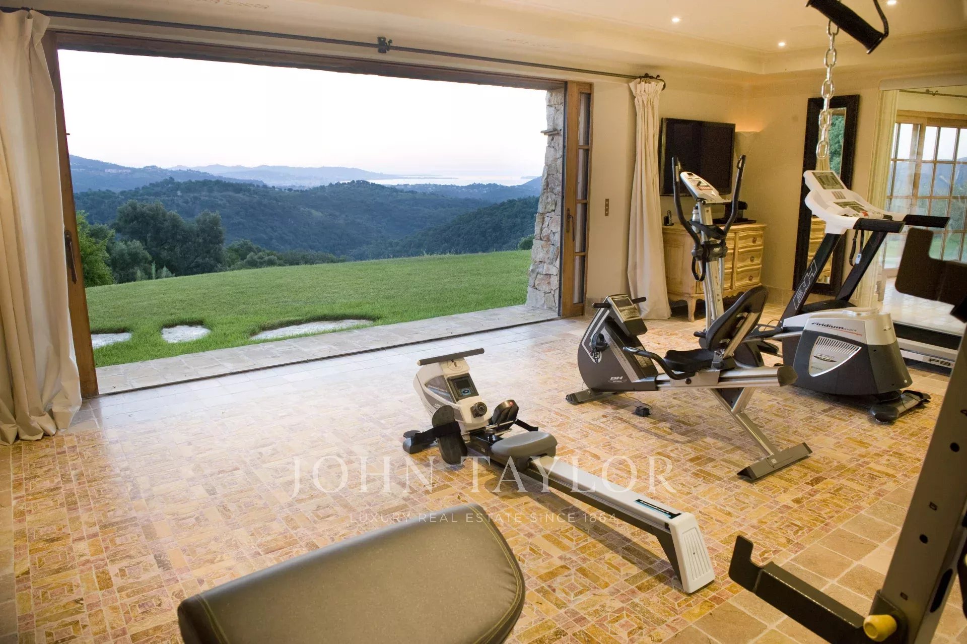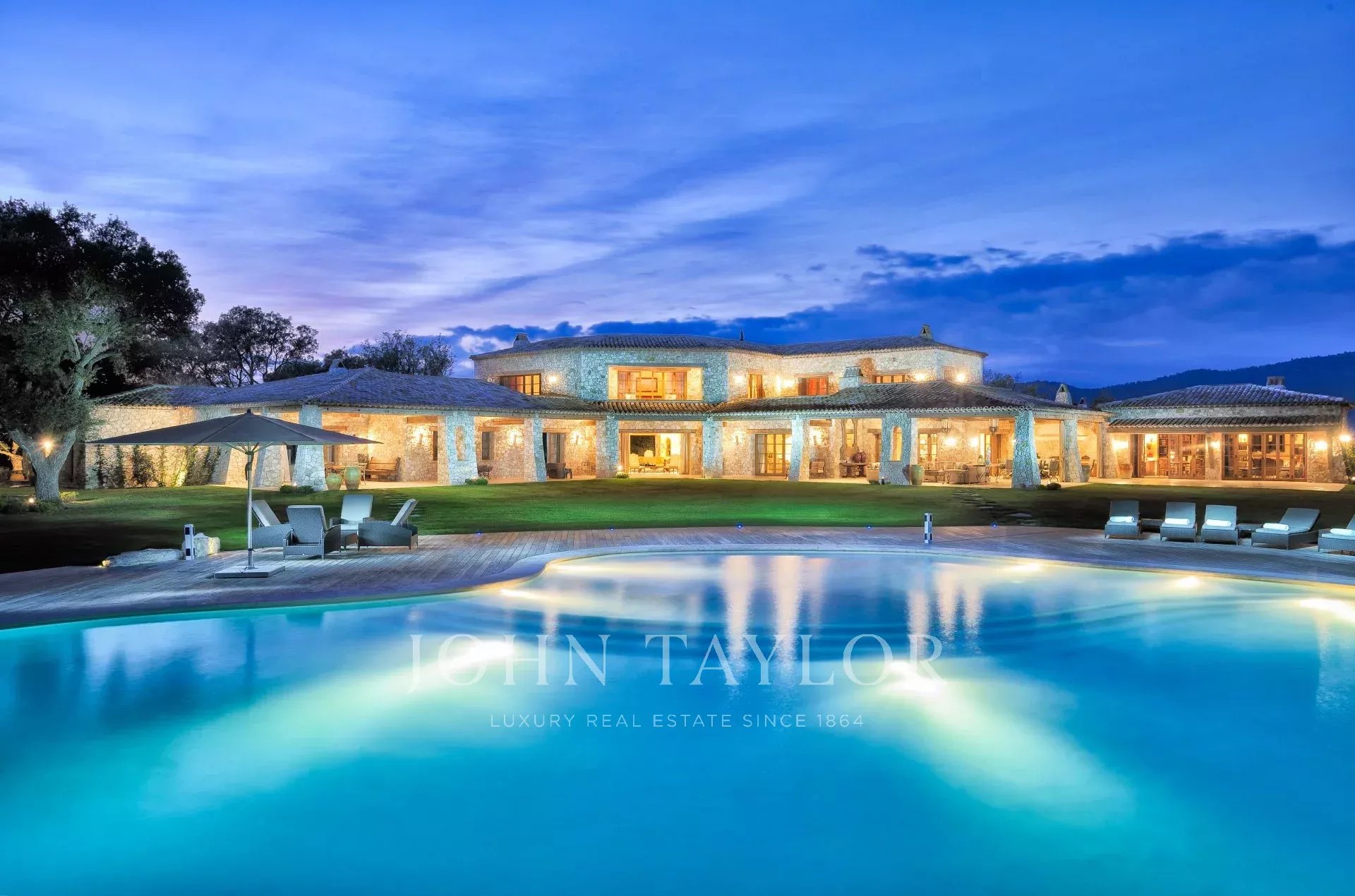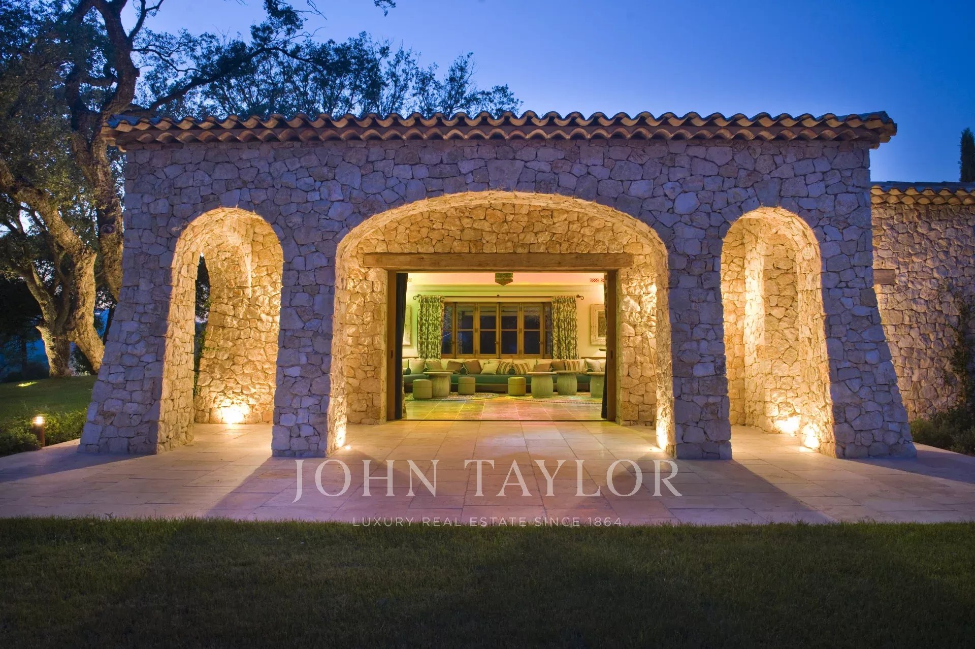 This unique and exceptional property is at only 20 minutes from Croisette in Cannes and 10 minutes from Cannes Mandelieu Airport. Private estate of 30 hectares laids out with care of hundred years old olive trees, lavender fields, lawns, tennis court, footpath or jogging (4 km) and heliport. Spectacular view overlooking the Bay of Cannes, Les Iles de Lerins and the Esterel Mountains.