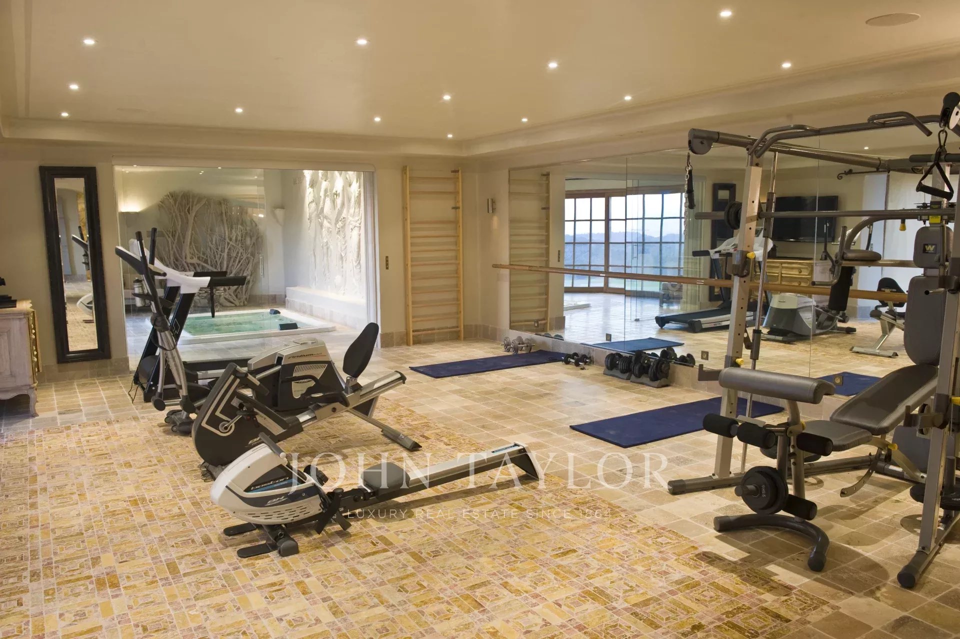Fitness room, sauna, hammam, large spa, shower, toilet, TV with a magnificent view on the Bay of Cannes