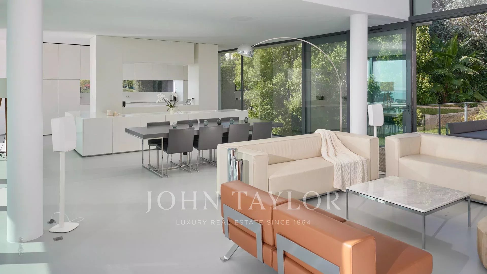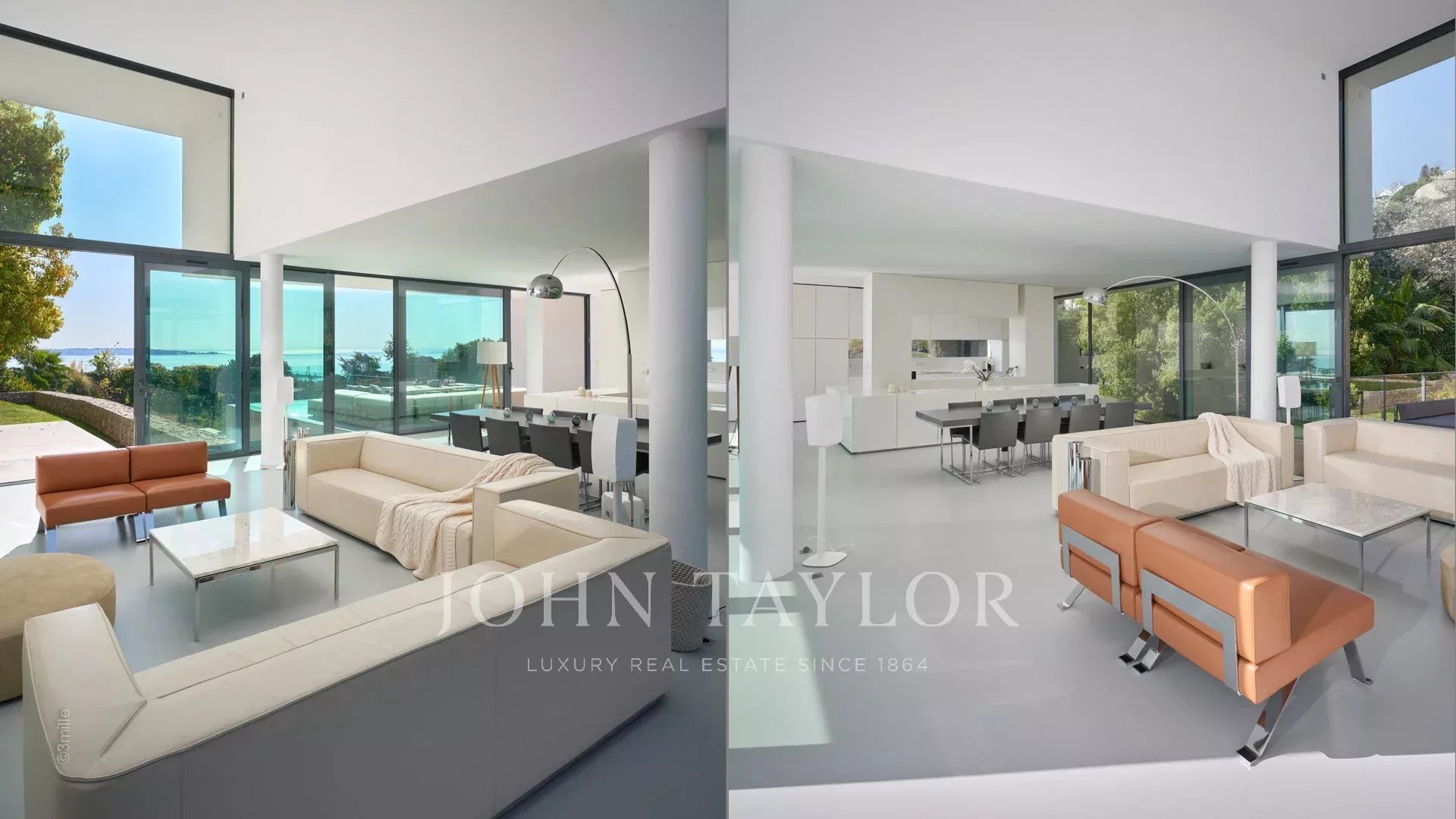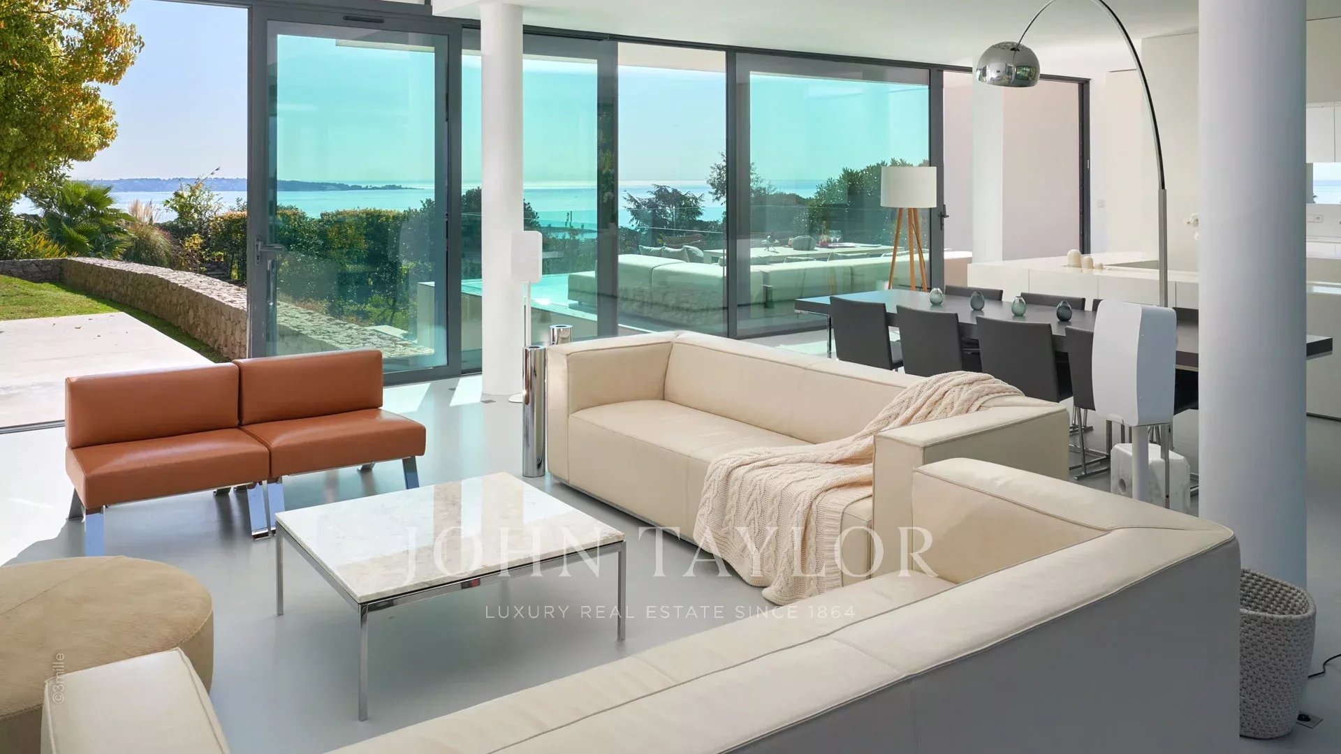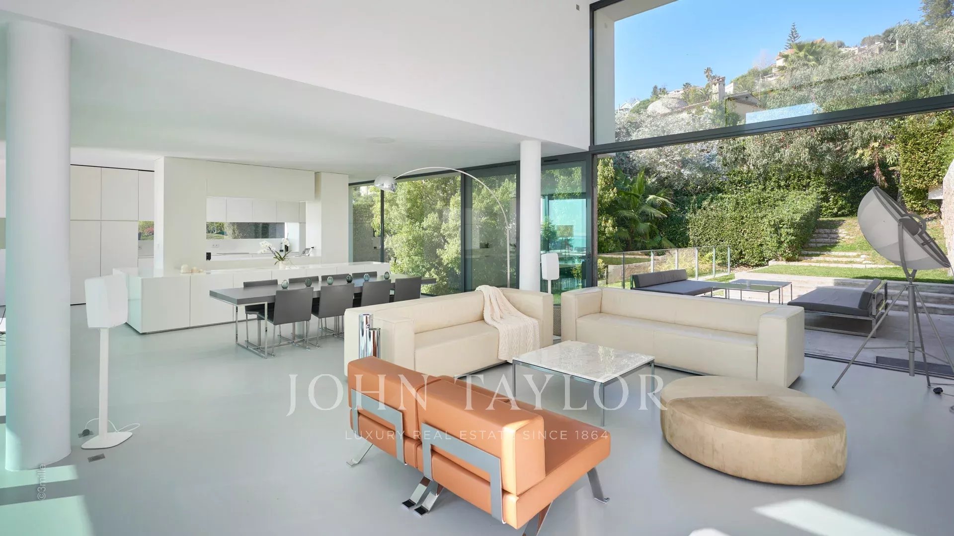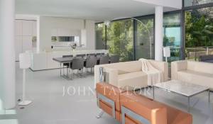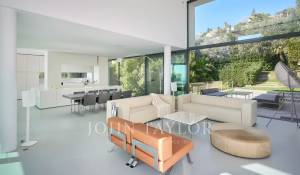 Large reception room opening onto the terrace enjoying views over the sea, the pool and the garden and comprising lounge, dining area and open kitchen