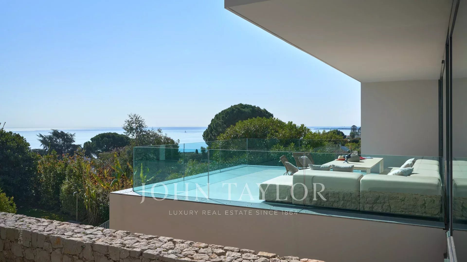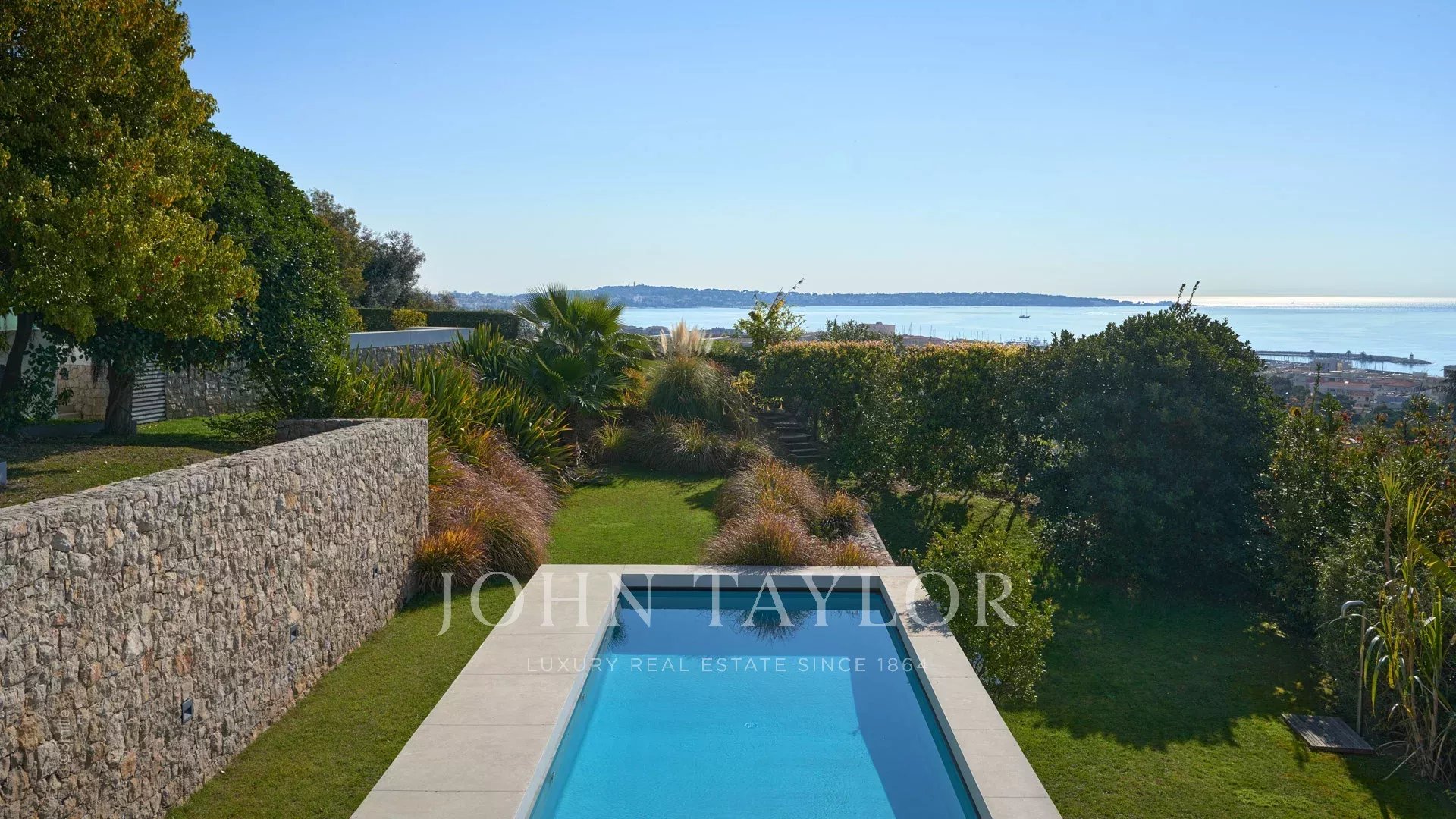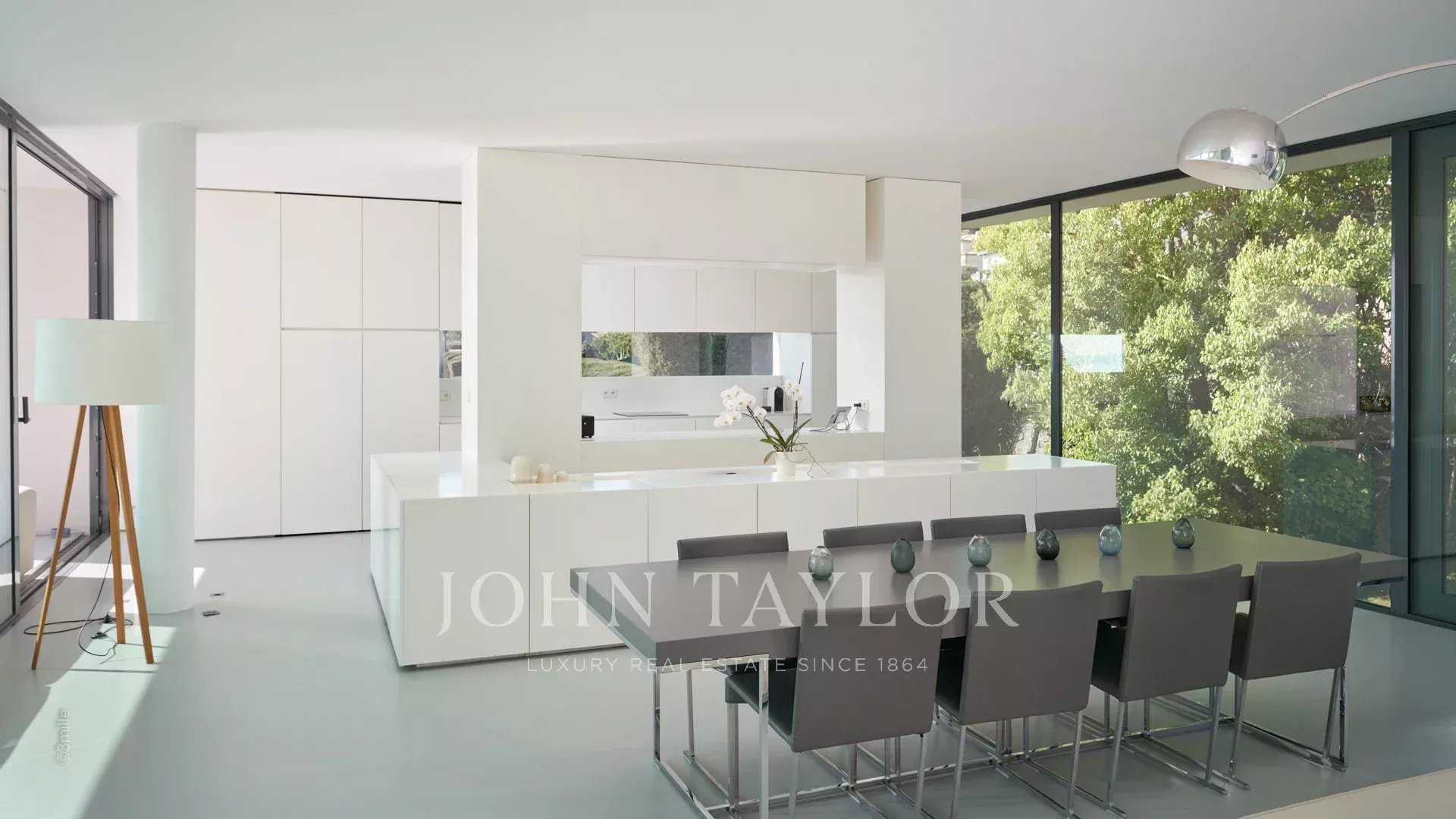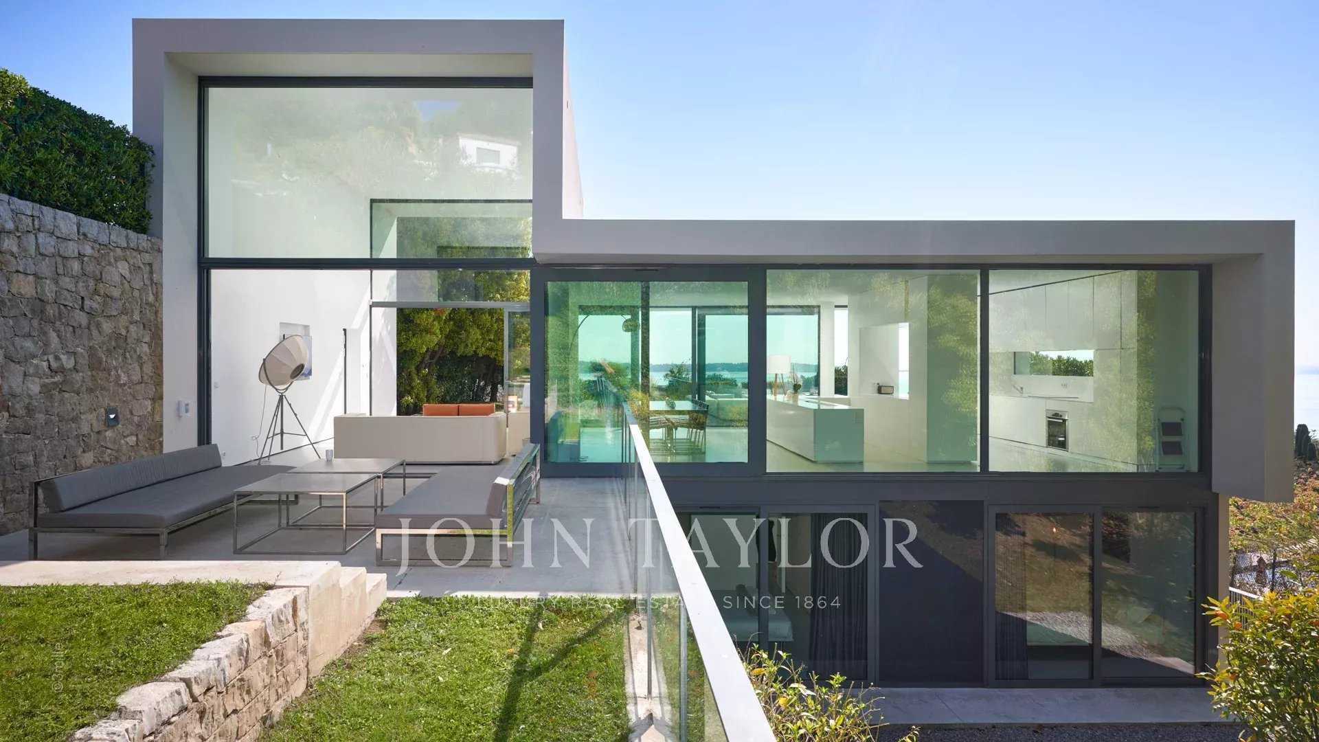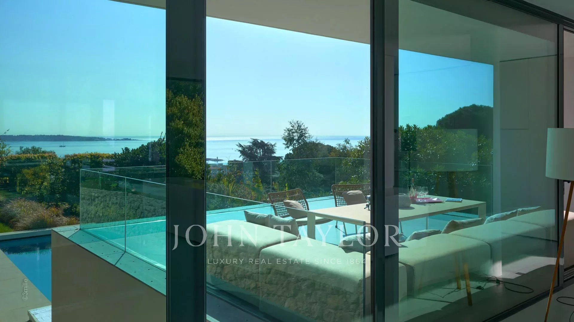 Large reception room opening onto the terrace enjoying views over the sea, the pool and the garden and comprising lounge, dining area and open kitchen