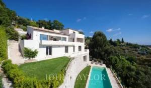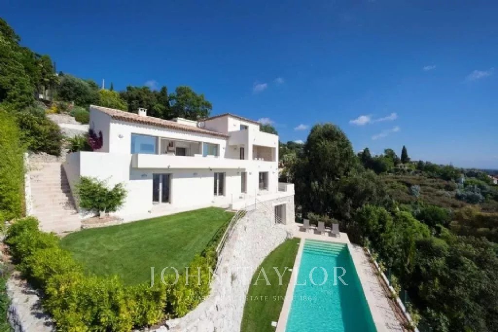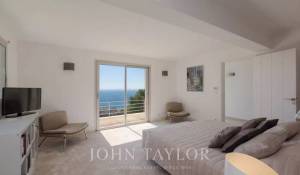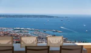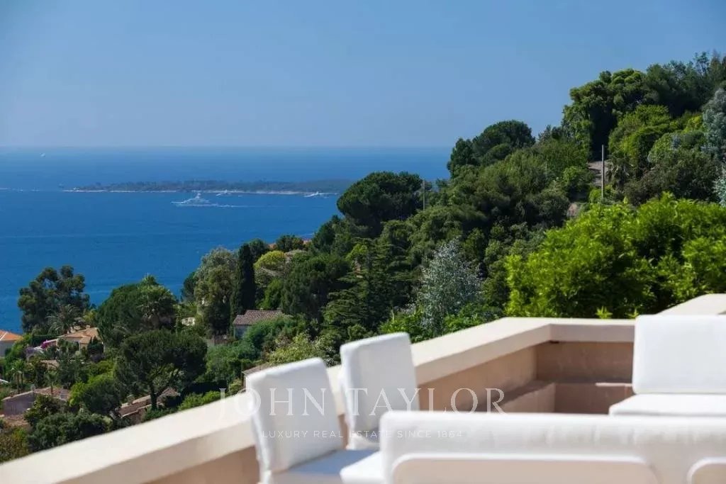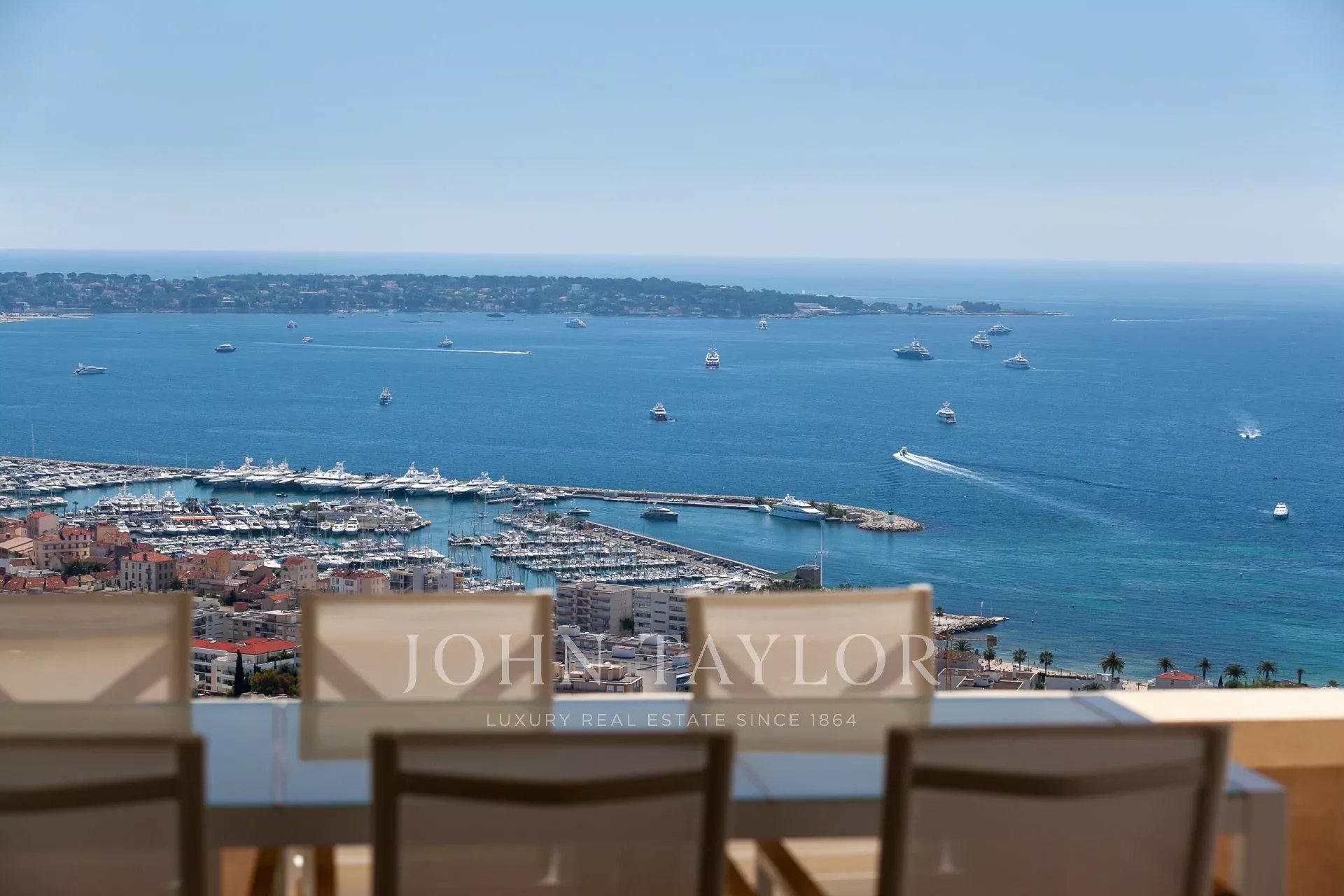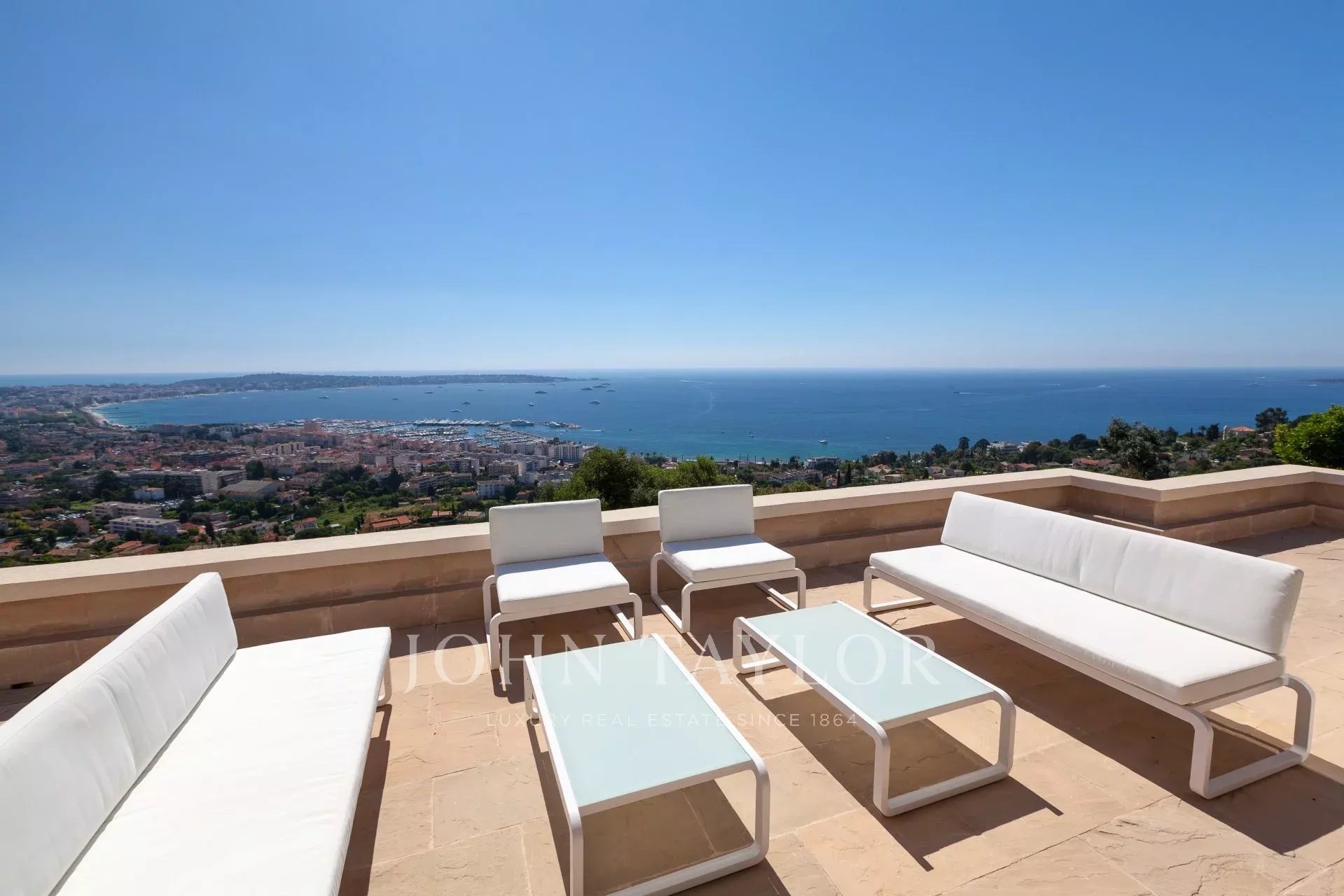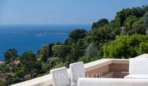 Overlooking the whole bay to the Cap d'Antibes, facing South East, superb contemporary style villa entirely and luxuriously renovated, standing in grounds of about 2 000 sq.m.