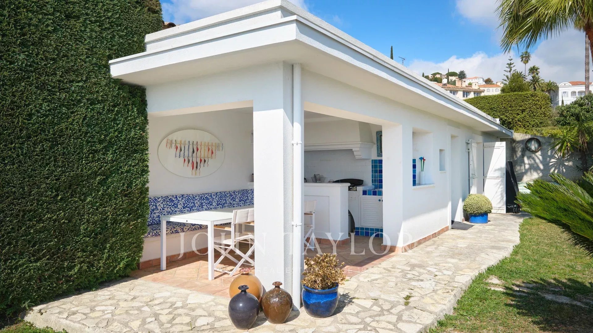 On the heights of Golfe-Juan and 800 m from the beaches, in the heart of a garden of 1,000 sq.m, modern villa of about 180 sq.m living area enjoying beautiful sea views.
