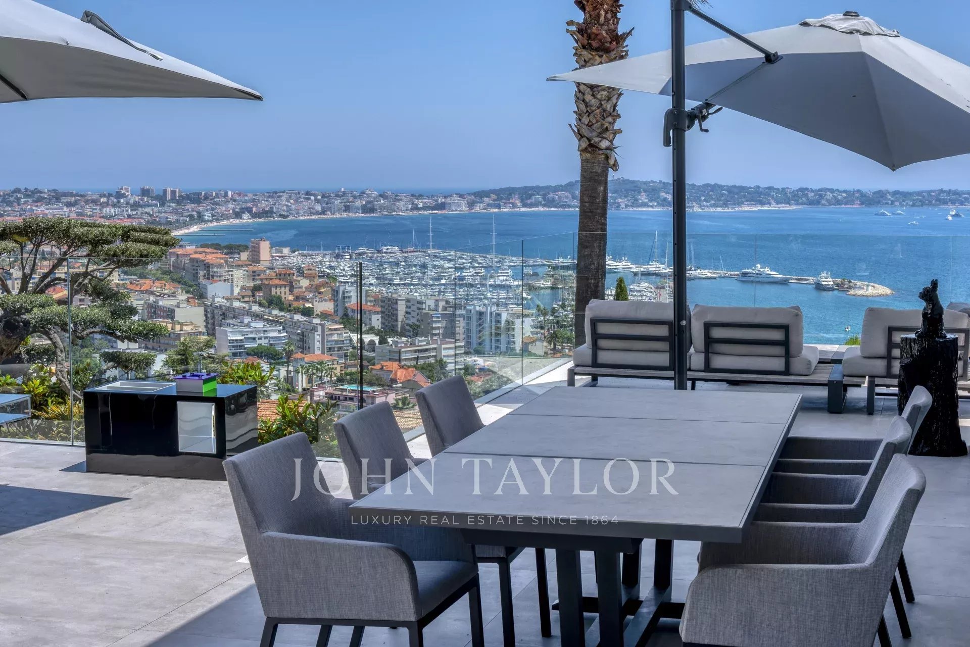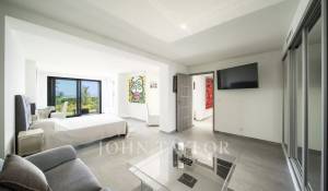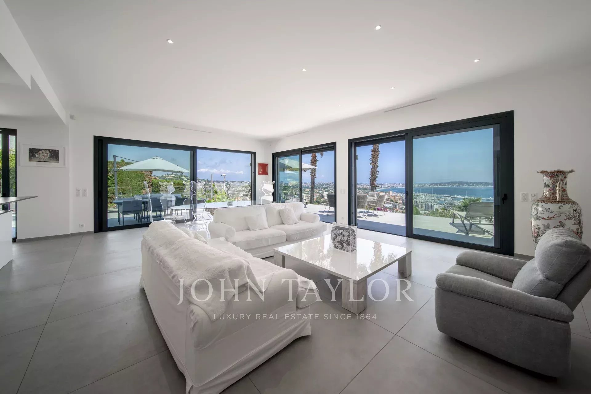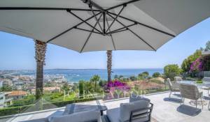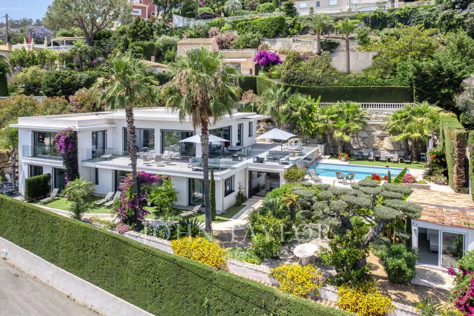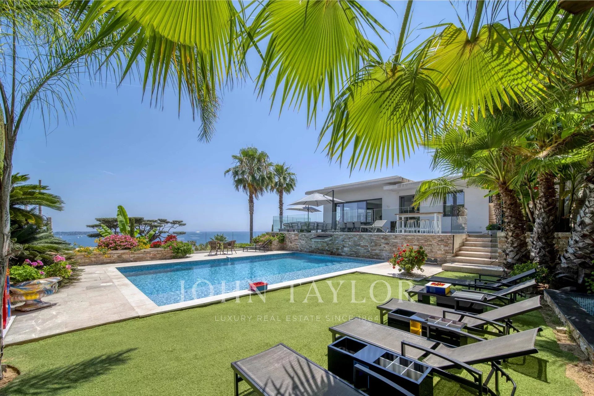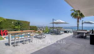 Overlooking the hills of Golfe Juan, just minutes from Cannes, this contemporary villa offers a stunning vacation setting with spectacular views of the Mediterranean and the legendary Cap d’Antibes.
