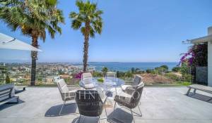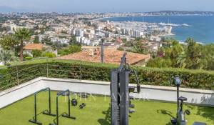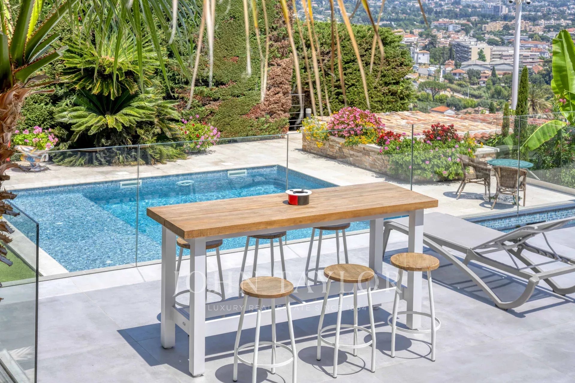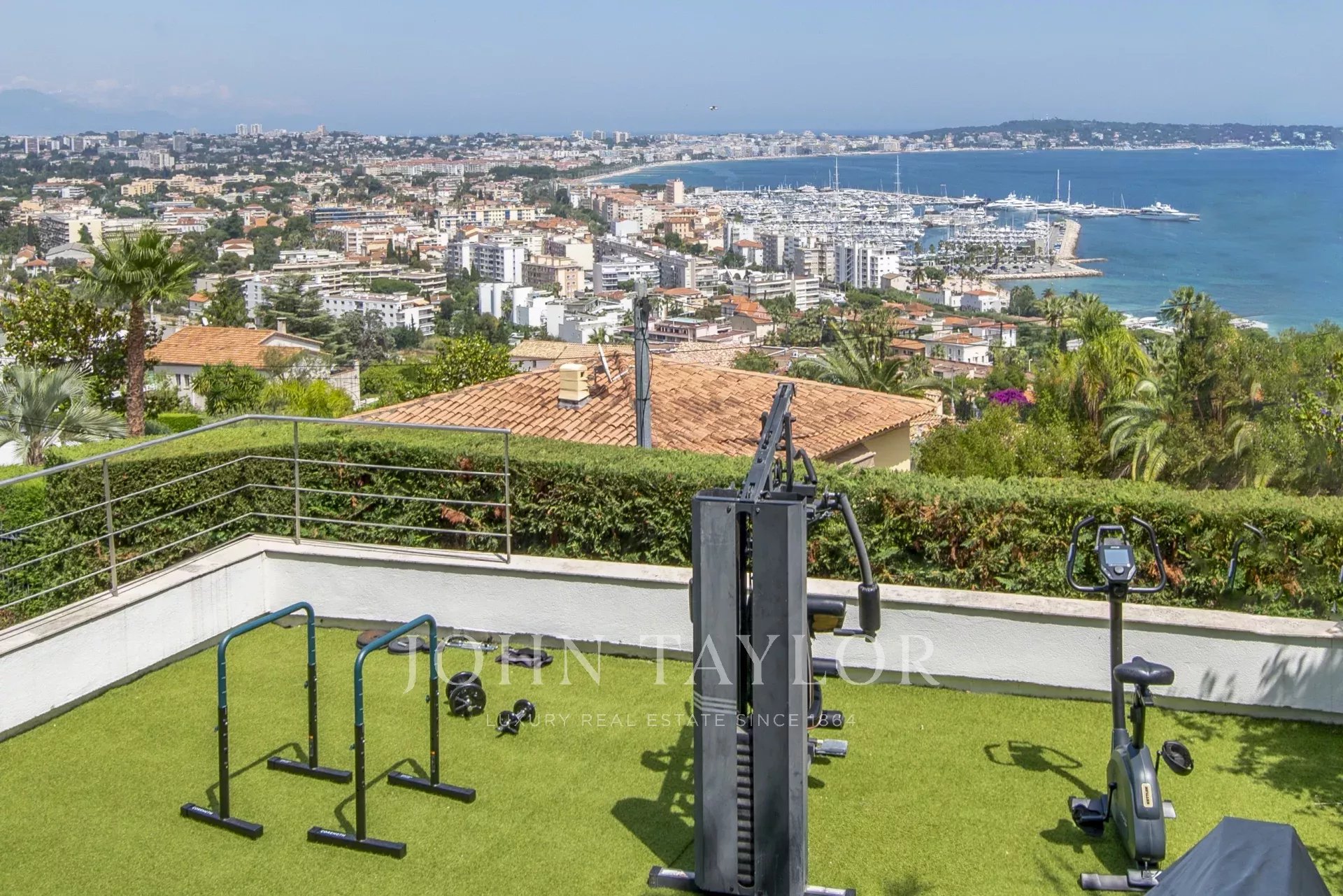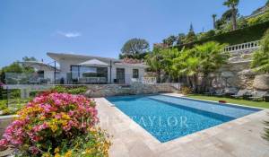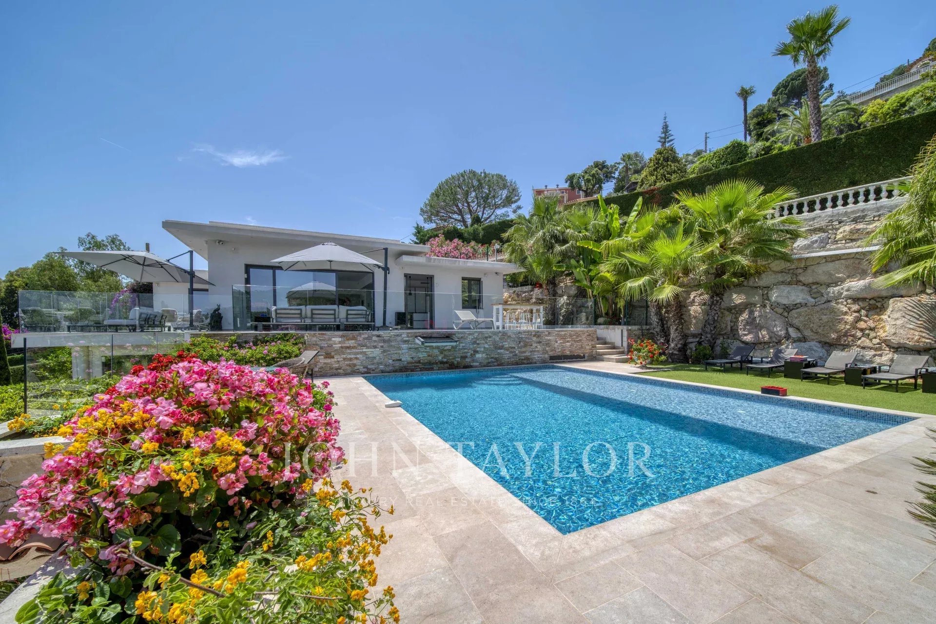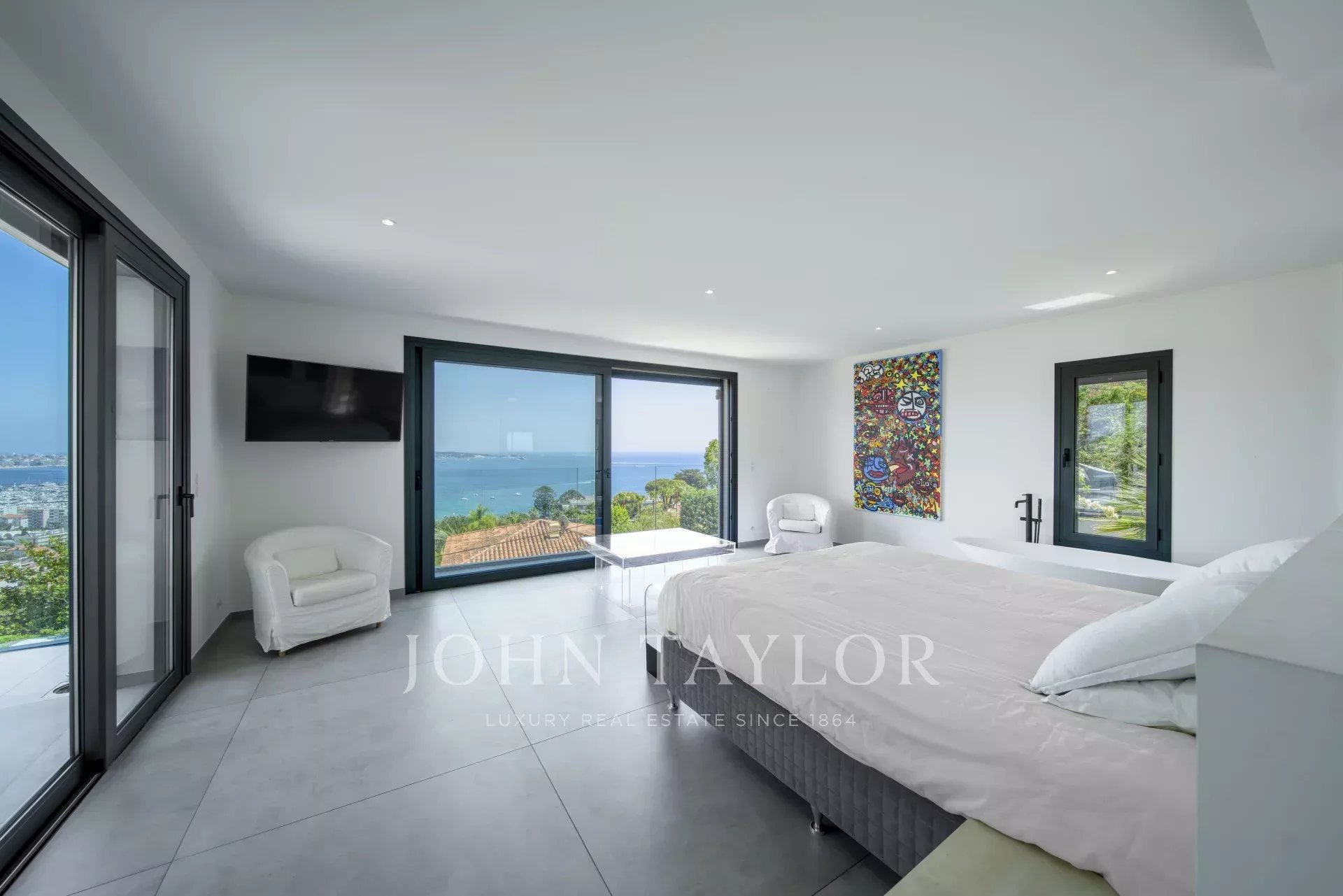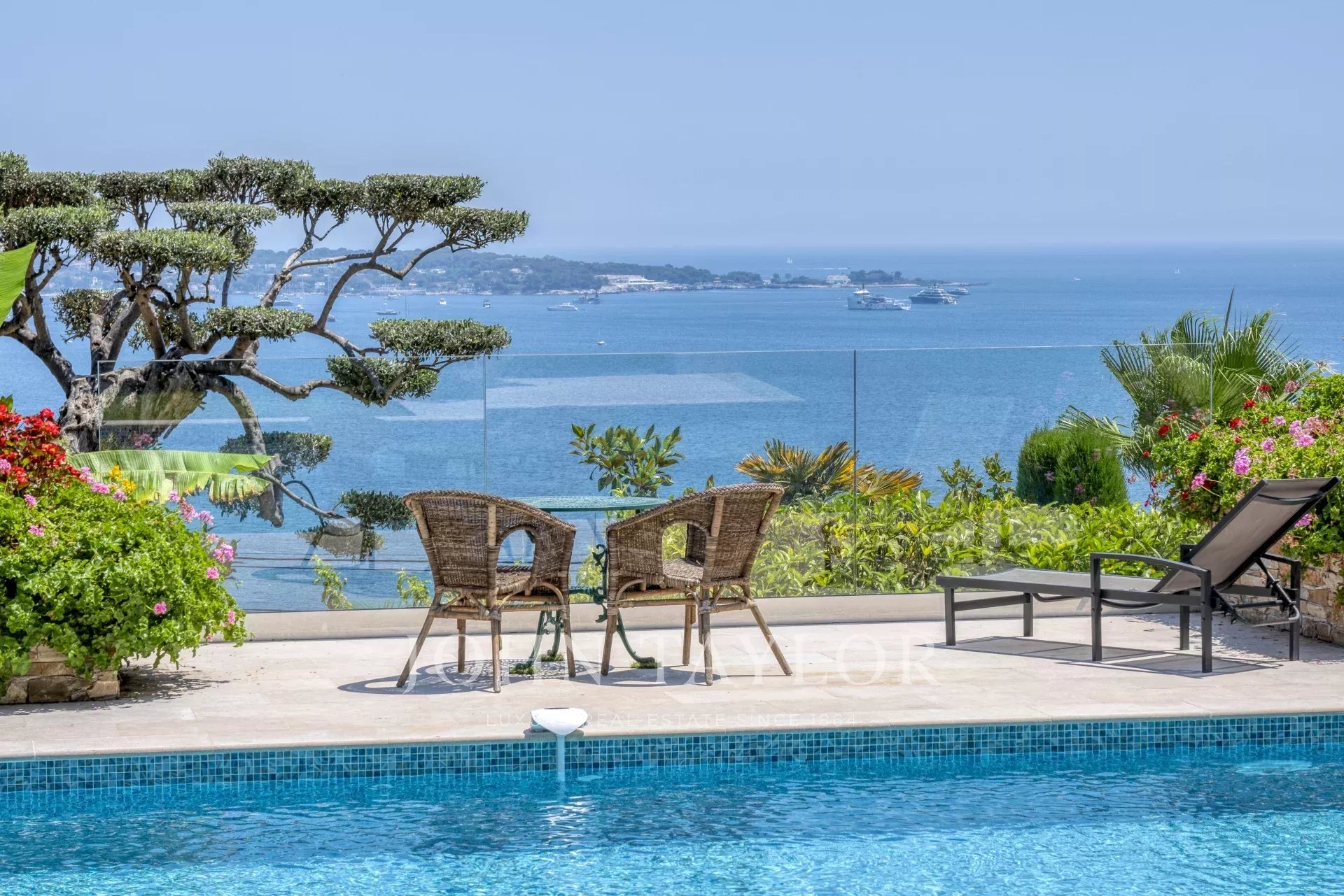 Overlooking the hills of Golfe Juan, just minutes from Cannes, this contemporary villa offers a stunning vacation setting with spectacular views of the Mediterranean and the legendary Cap d’Antibes.
