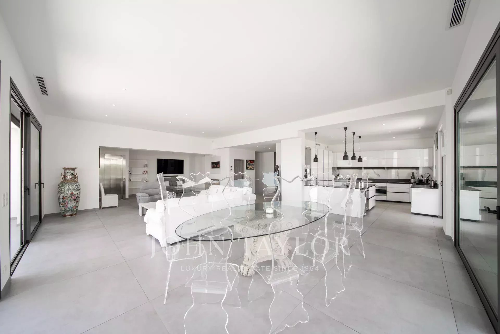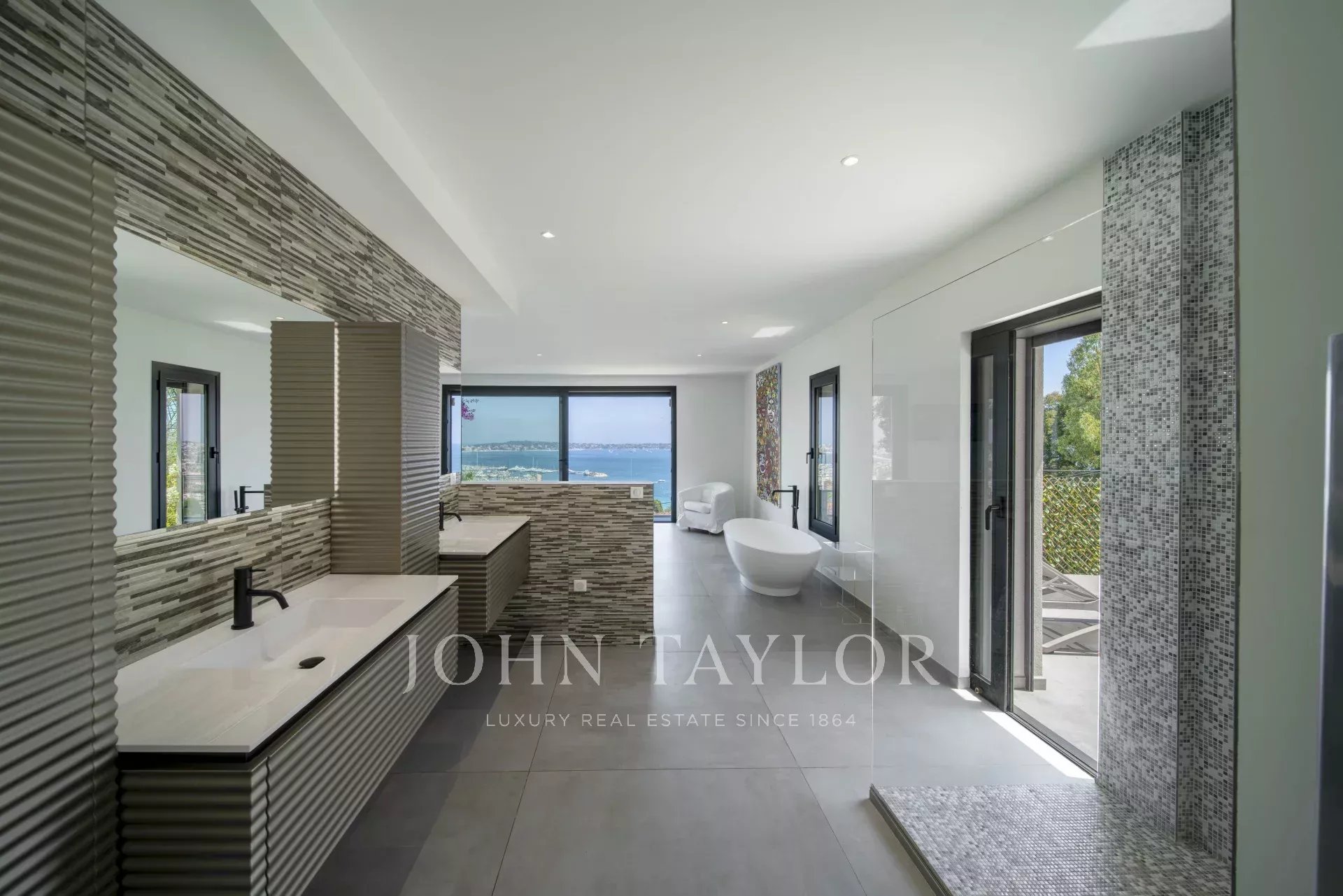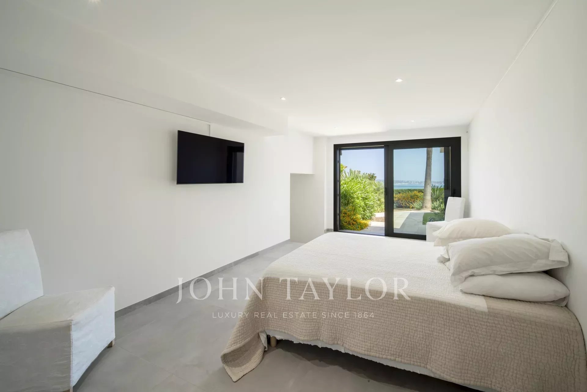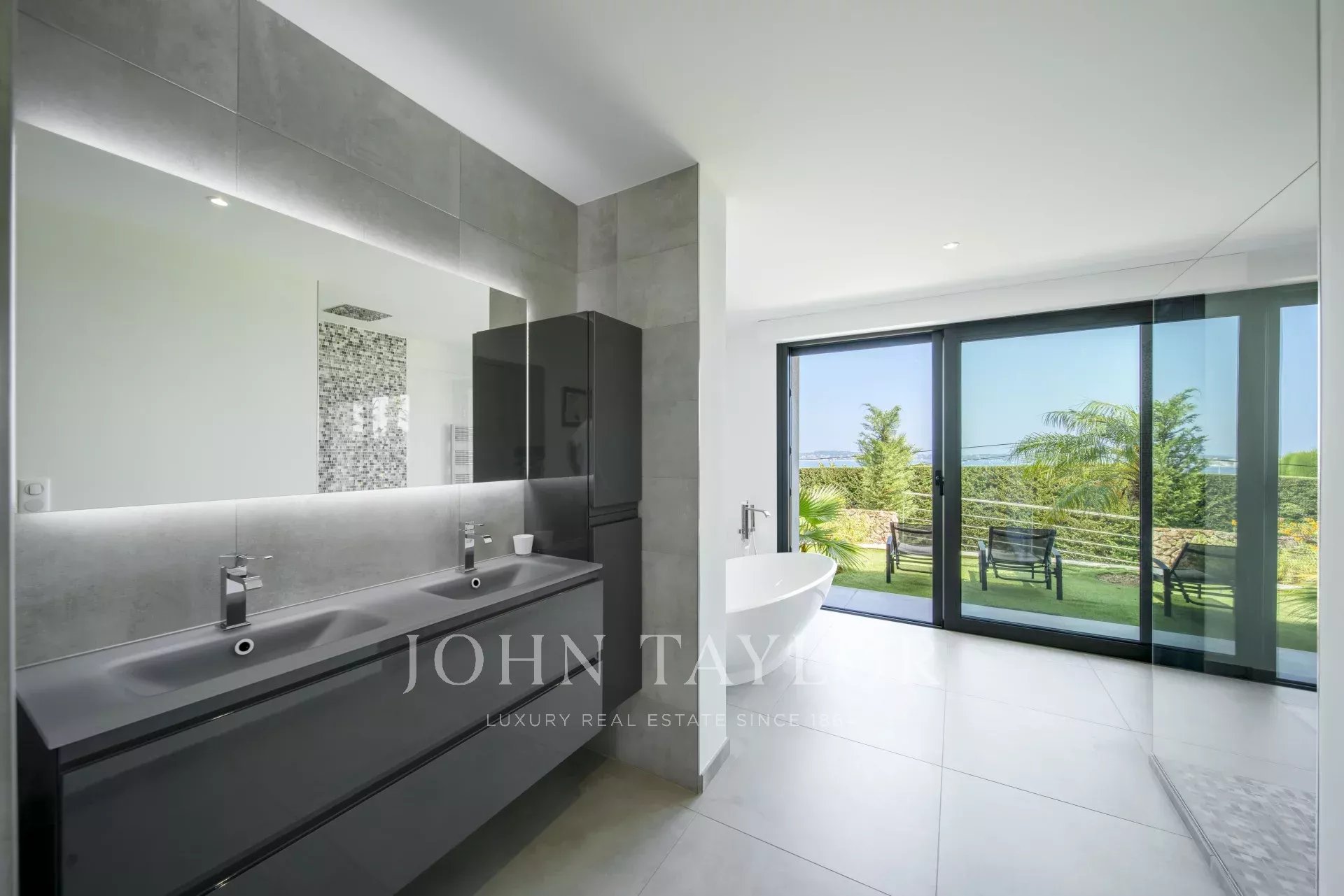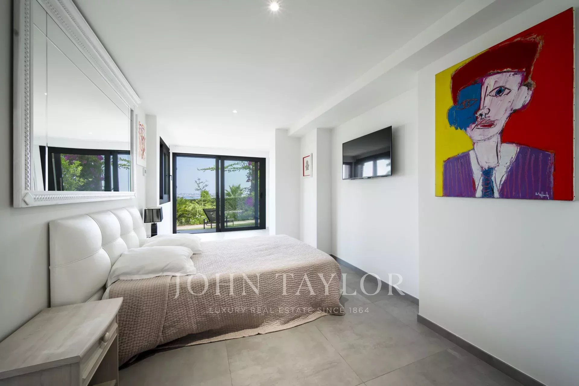 Overlooking the hills of Golfe Juan, just minutes from Cannes, this contemporary villa offers a stunning vacation setting with spectacular views of the Mediterranean and the legendary Cap d’Antibes.