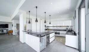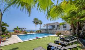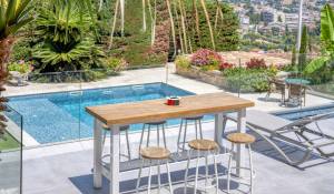 Outside, a beautiful relaxation area awaits, featuring a heated pool (6m x 8,5m) with a waterfall, all set against the backdrop of the azure horizon. An elevator connects the various levels of the villa, and a secure garage is also available.