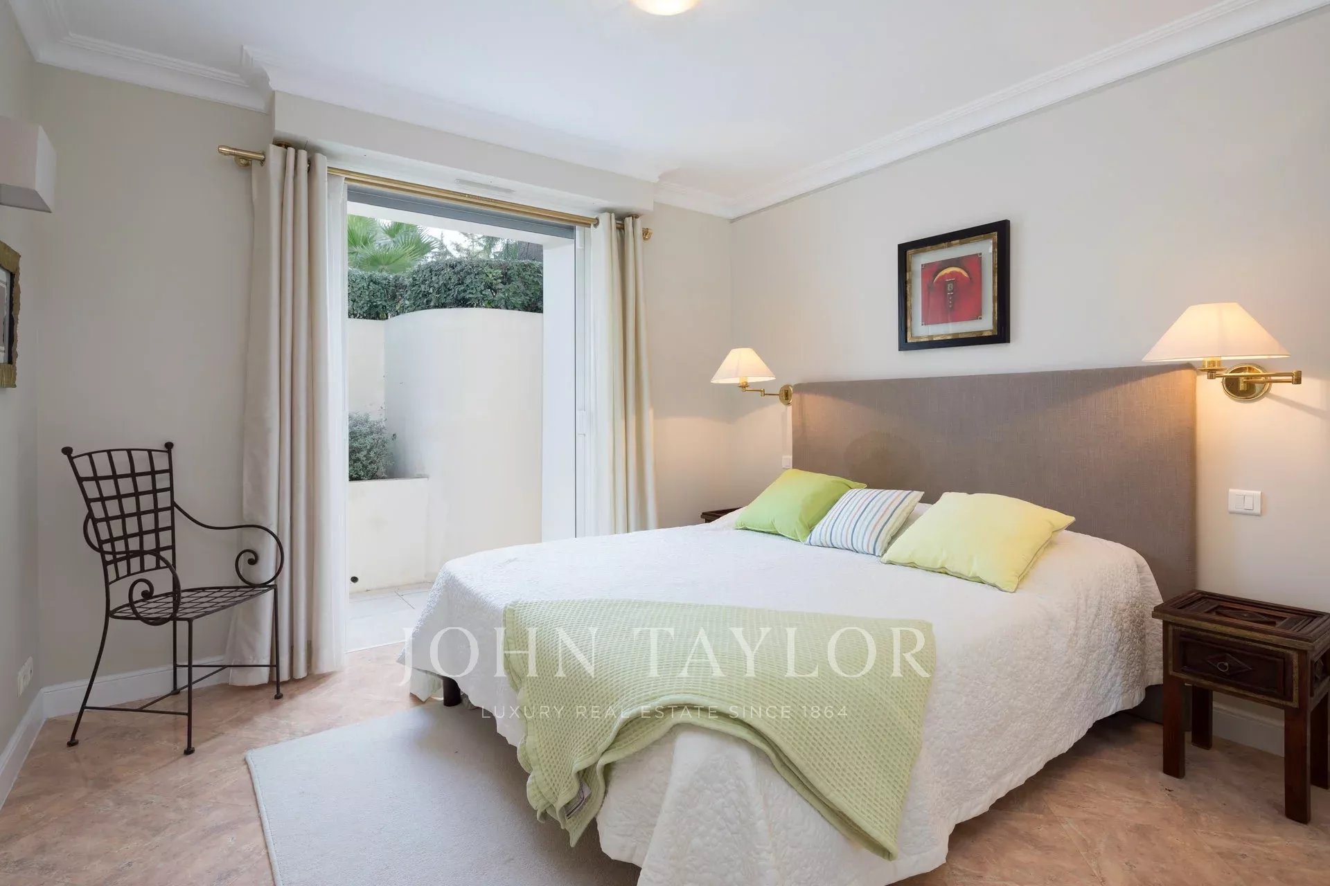 Master bedroom, king size bed (2 beds of 1m), terrace with sea view.
