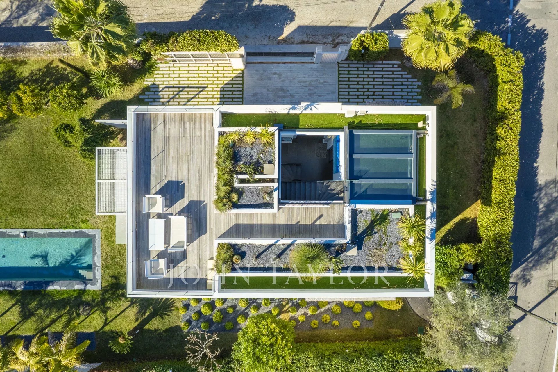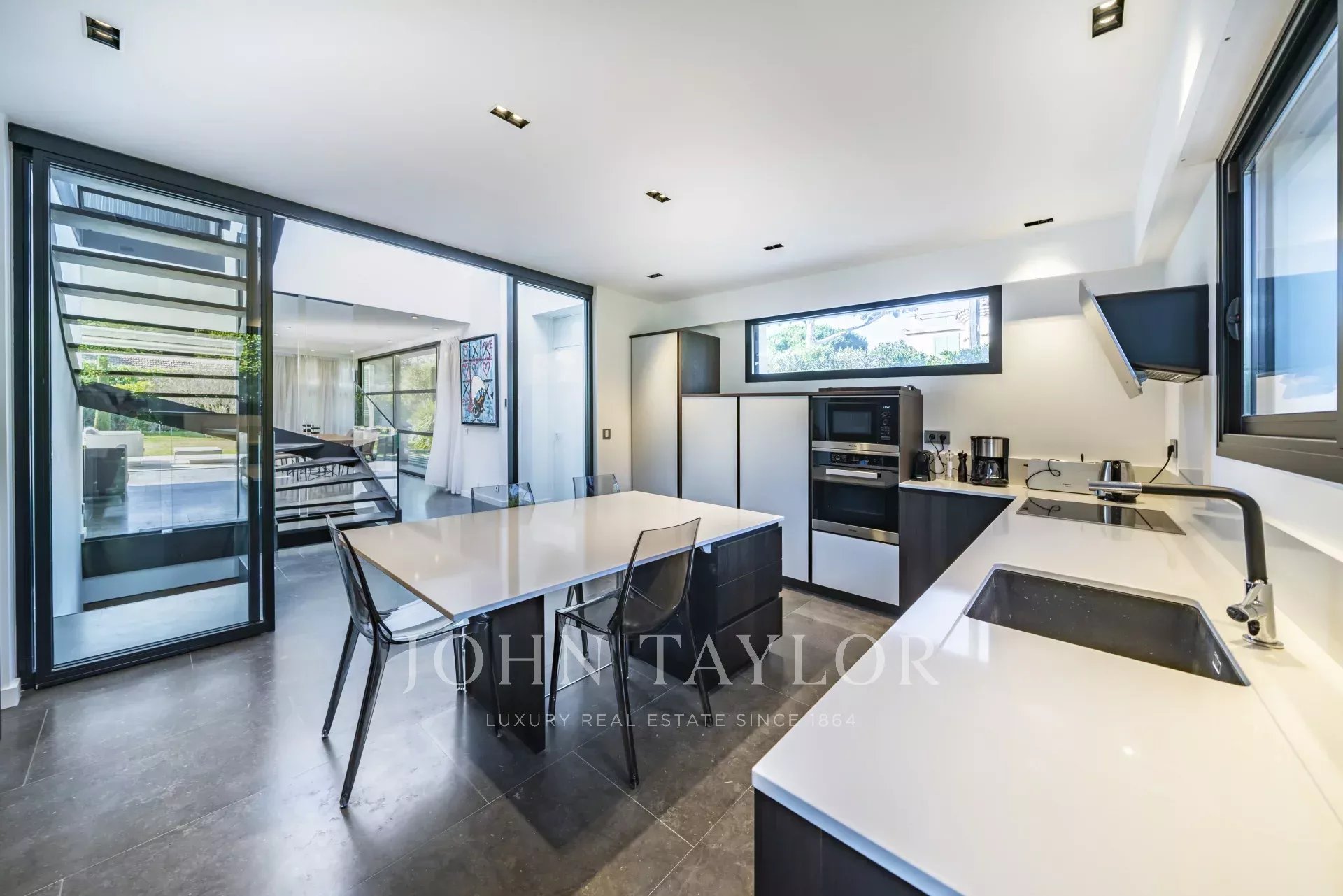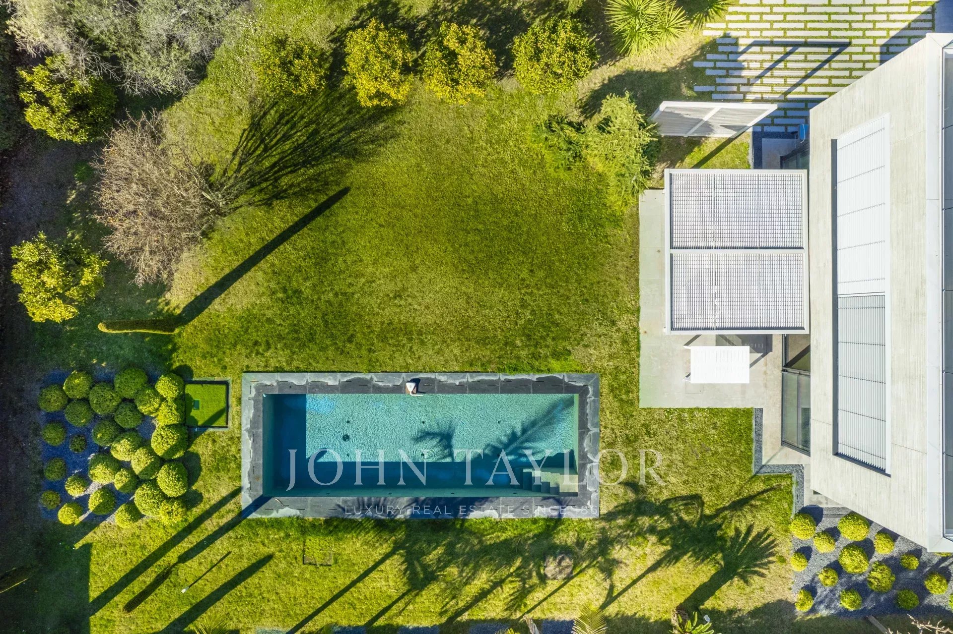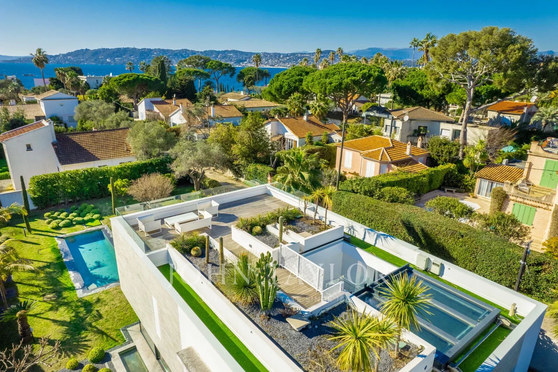 Beautiful new contemporary villa completed in summer 2020, offering 320 sqm living area surrounded with 940 sqm grounds and enjoying nice sea views (the Bay of Juan les Pins and the Iles de Lerins) from its roof top terrace/solarium.