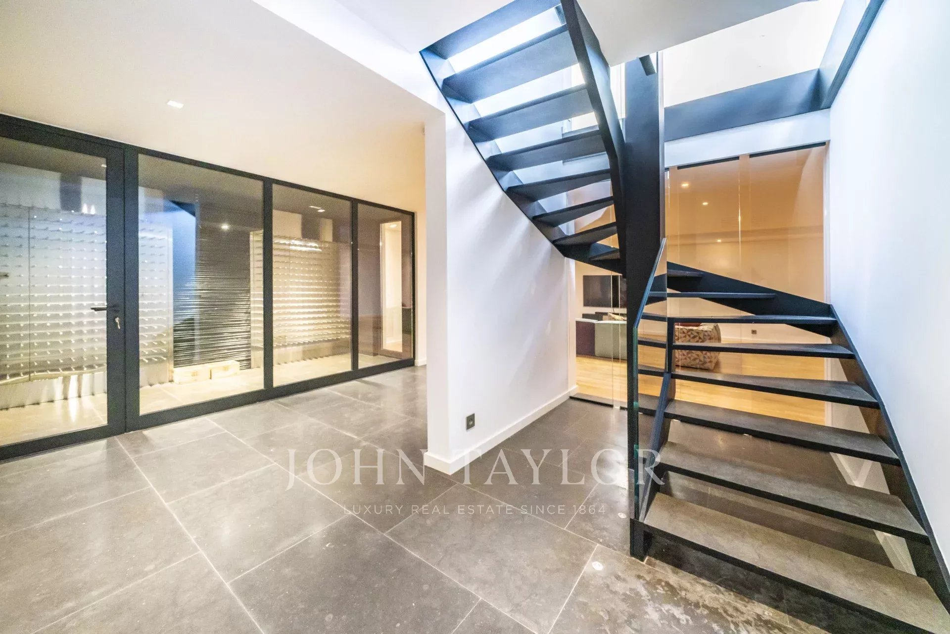 The main entrance gives access to a hall with to the left the kitchen; opposite a staircase to the first floor, a corridor with to the right a WC and to the left an ensuite bedroom; to the right a large open space including the dining room and the living room. Doors slide fully open to garden (indoor outdoor flow)