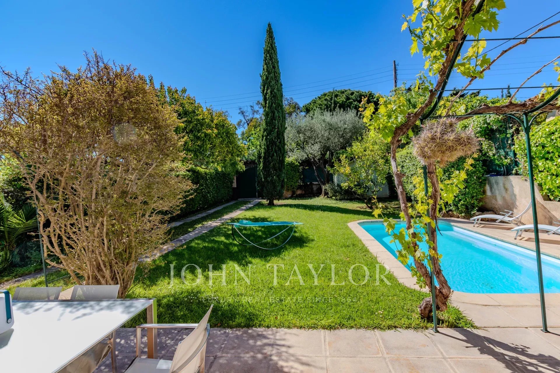 Pleasant flat garden enjoying a swimming pool and sunshine throughout the day.