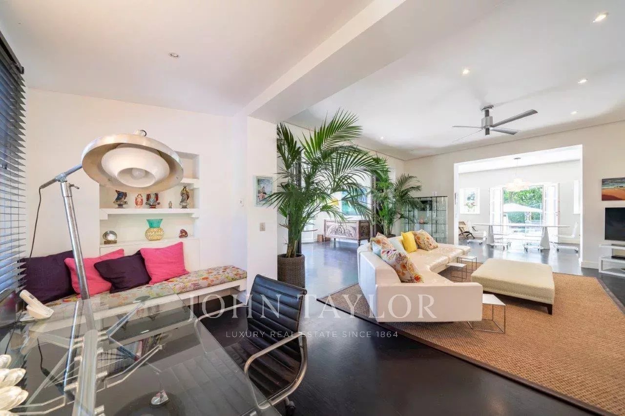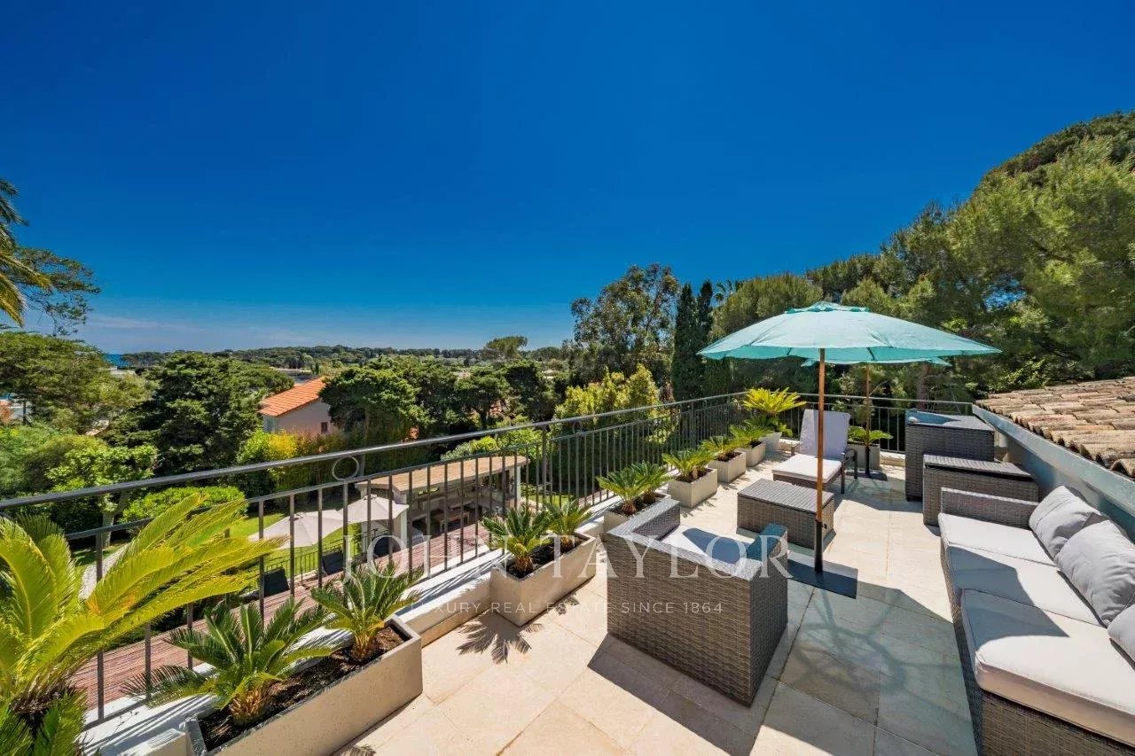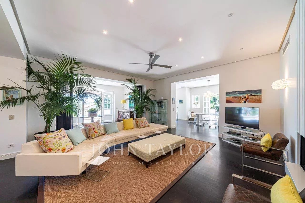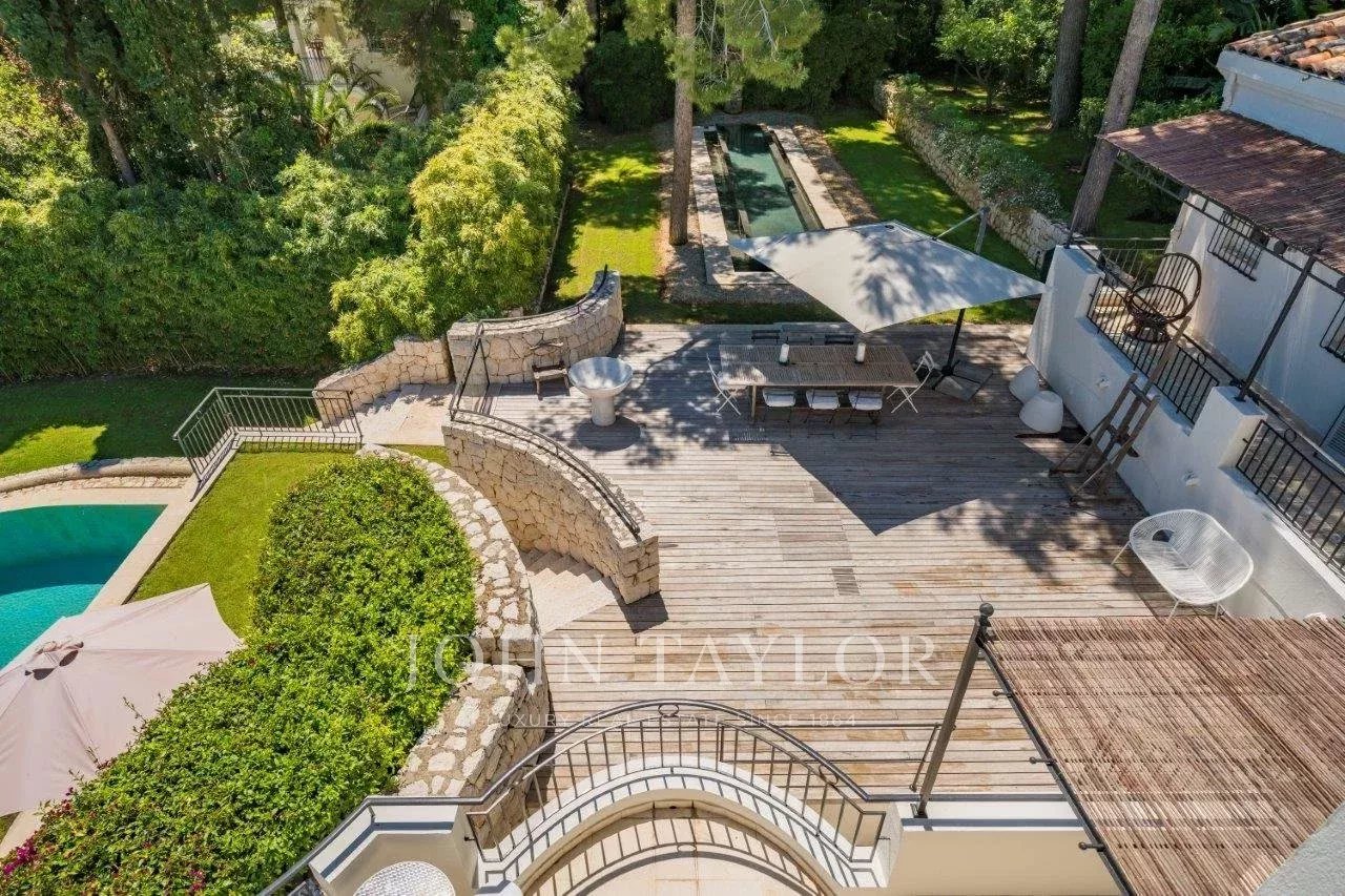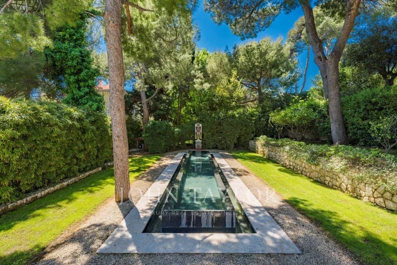In a small private domaine, closed to the Garoupe beach, attractive and renovated property of approx. 400 sq.m, entirely air-conditioned, surrounded with beautiful grounds of 2 700 sq.m enhanced with waterfalls and fountains.