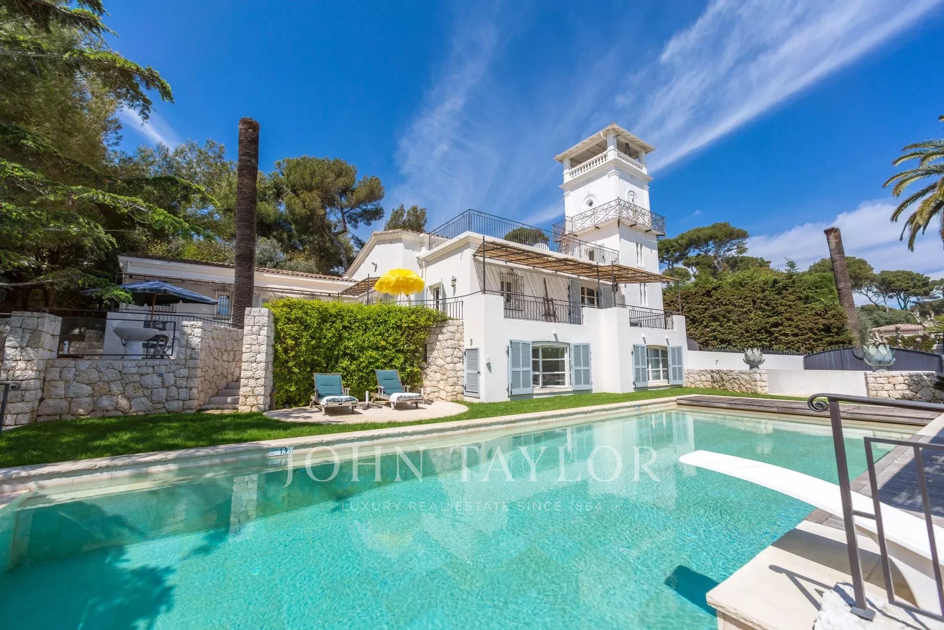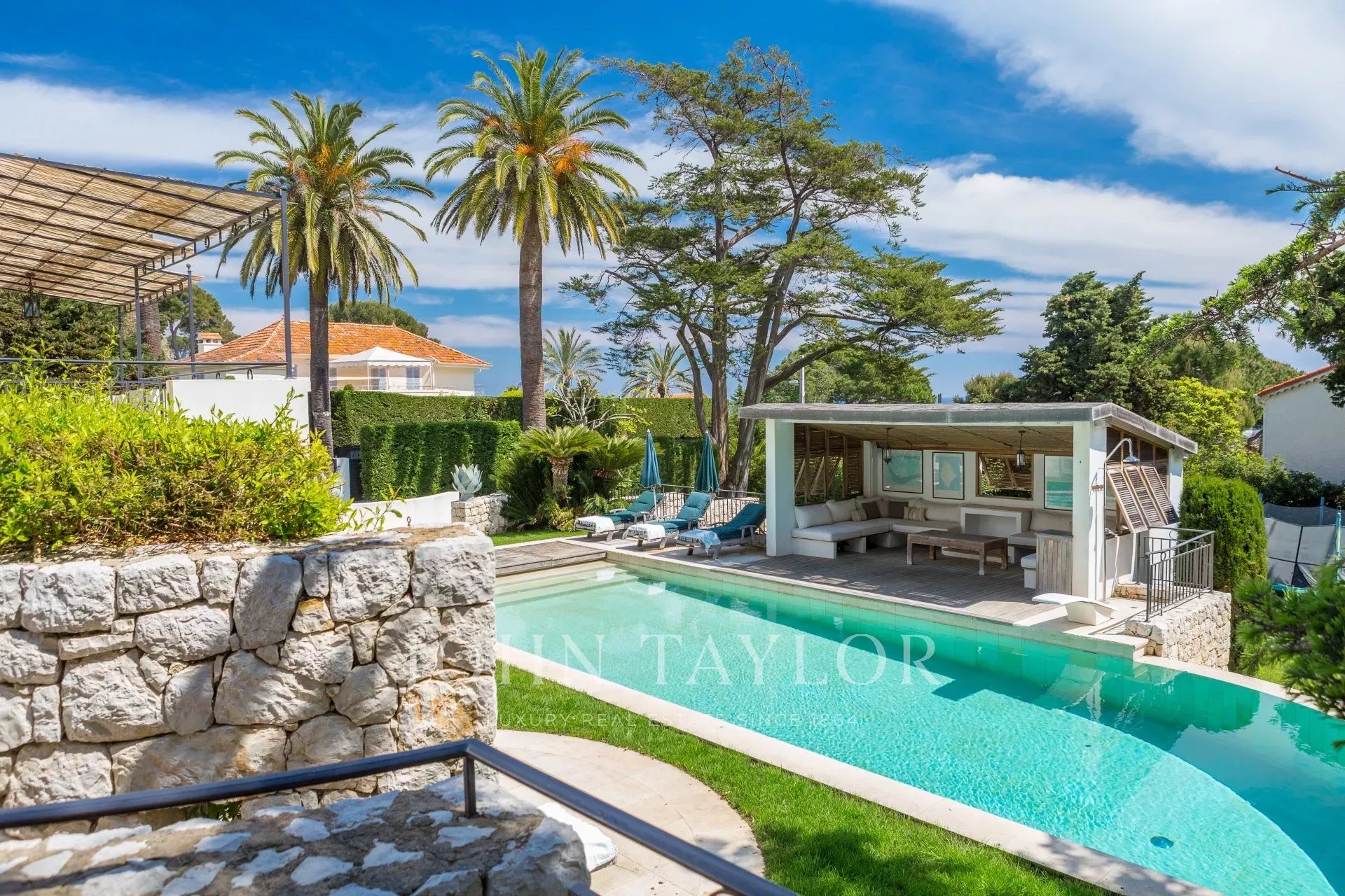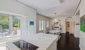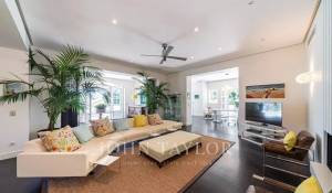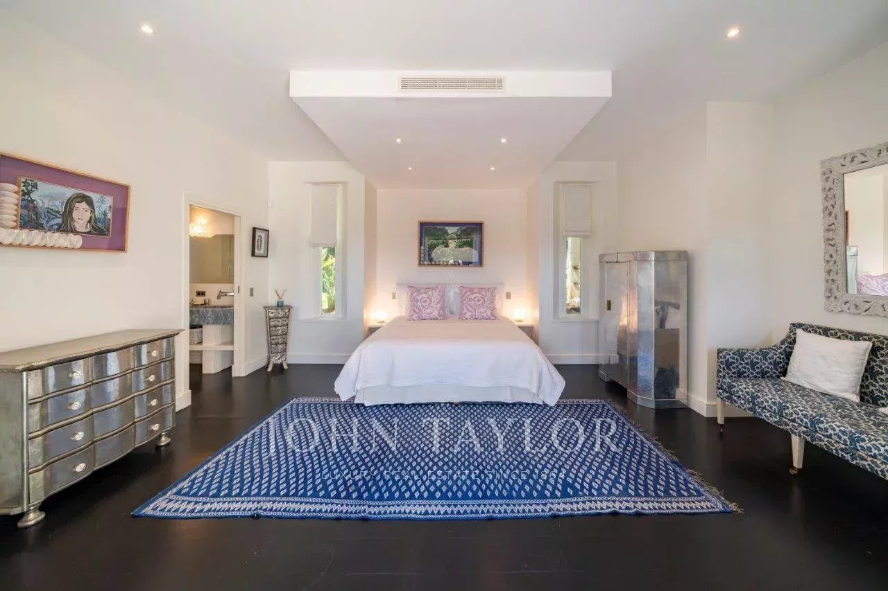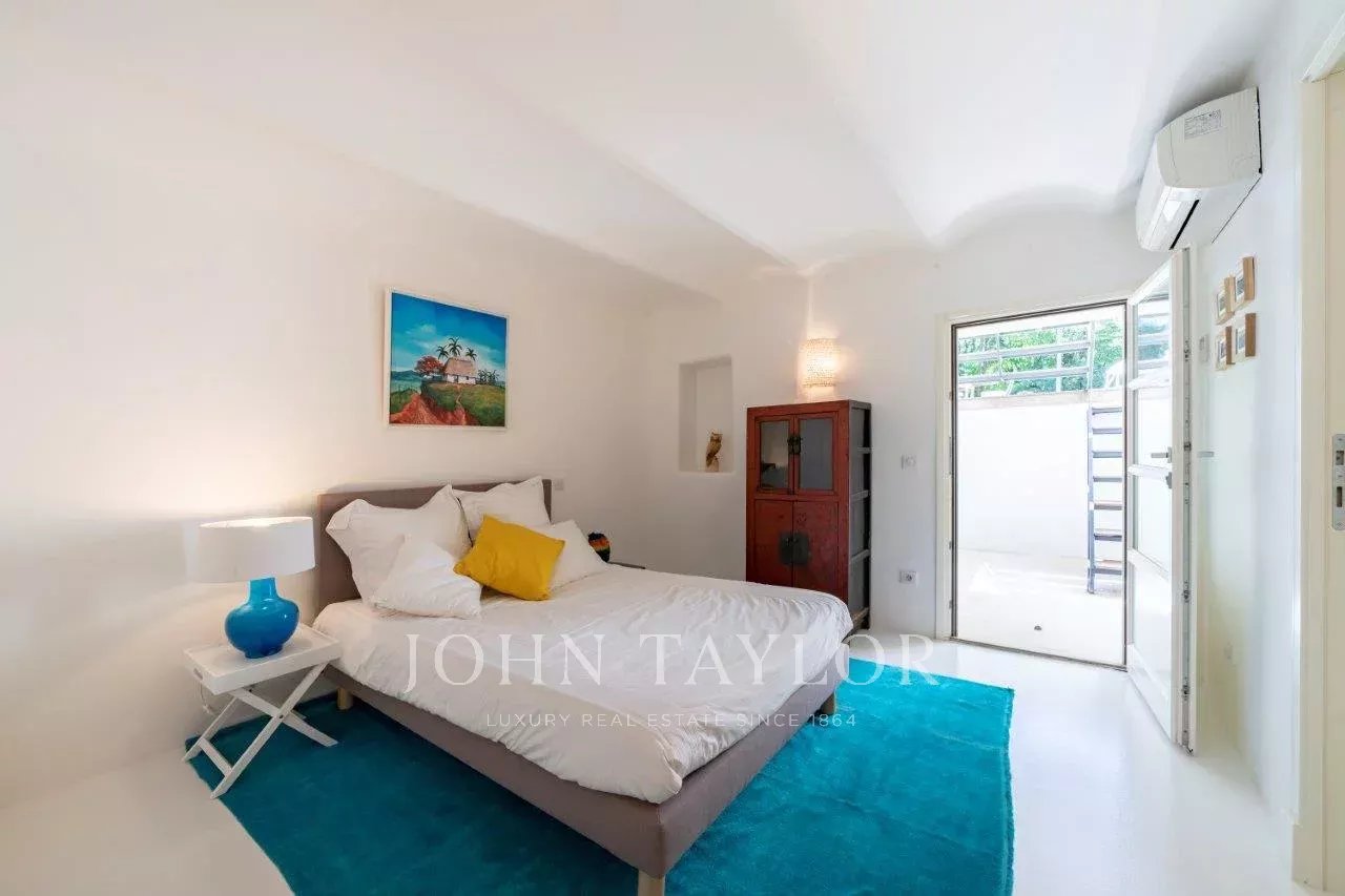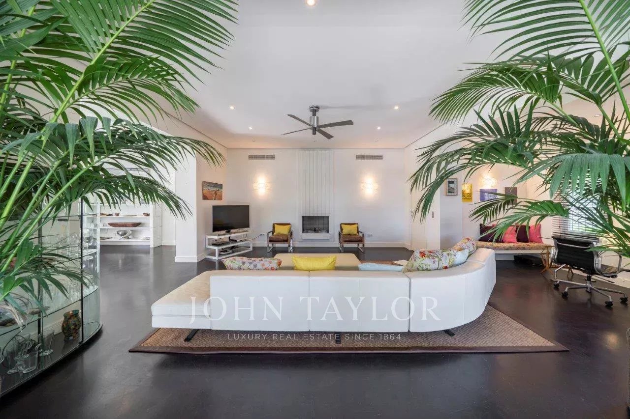 In a small private domaine, closed to the Garoupe beach, attractive and renovated property of approx. 400 sq.m, entirely air-conditioned, surrounded with beautiful grounds of 2 700 sq.m enhanced with waterfalls and fountains.