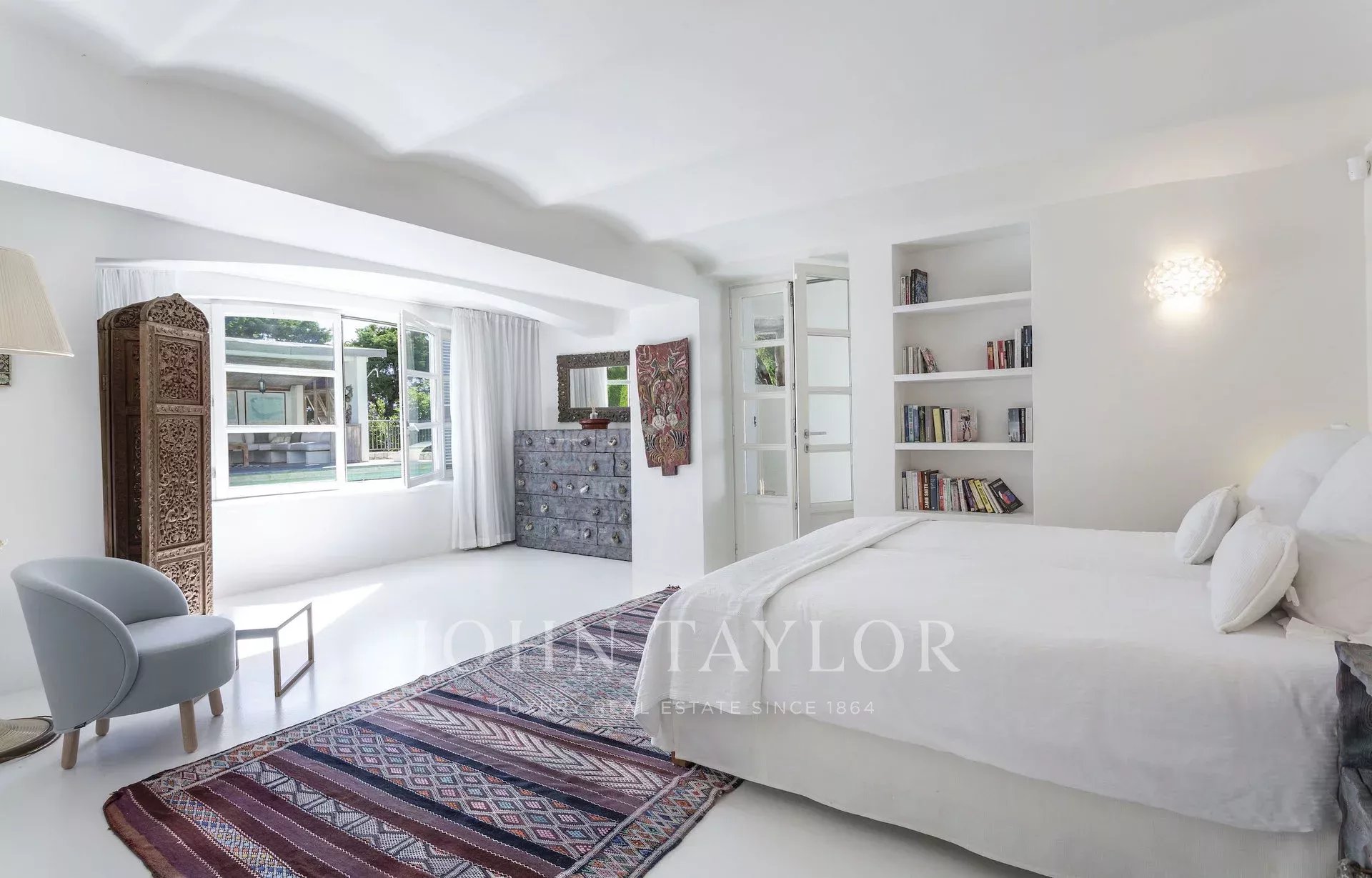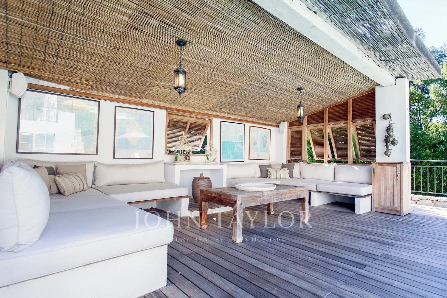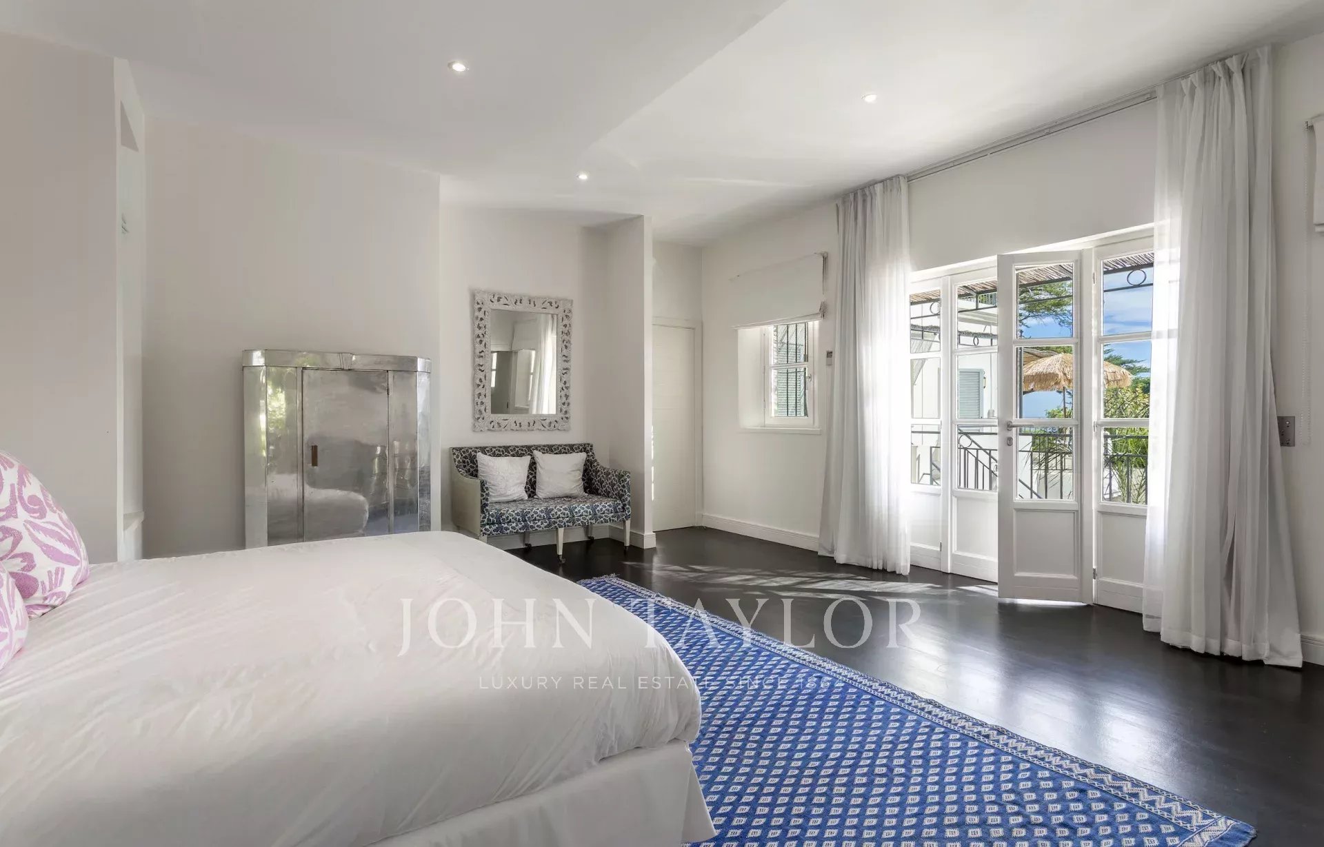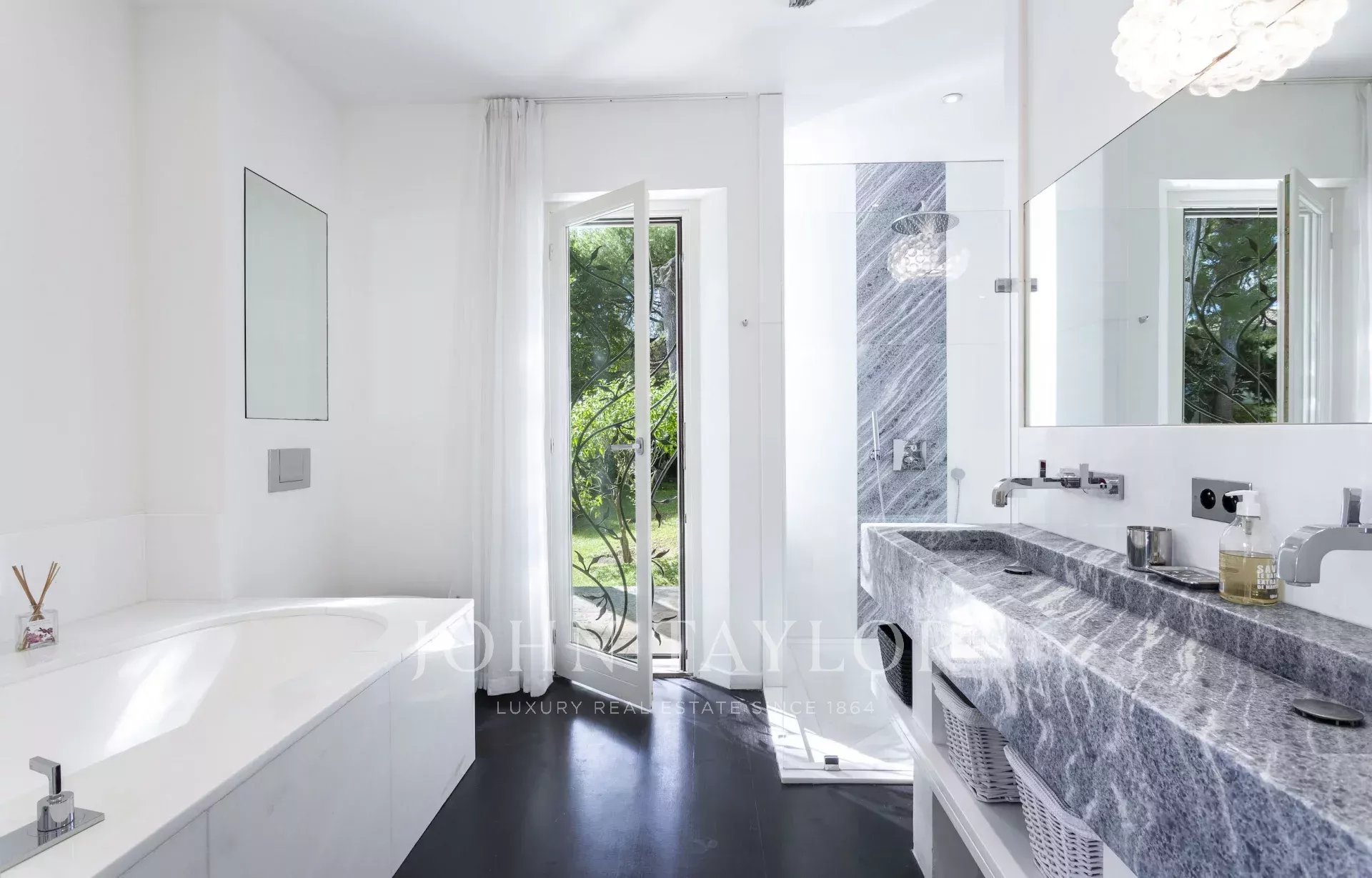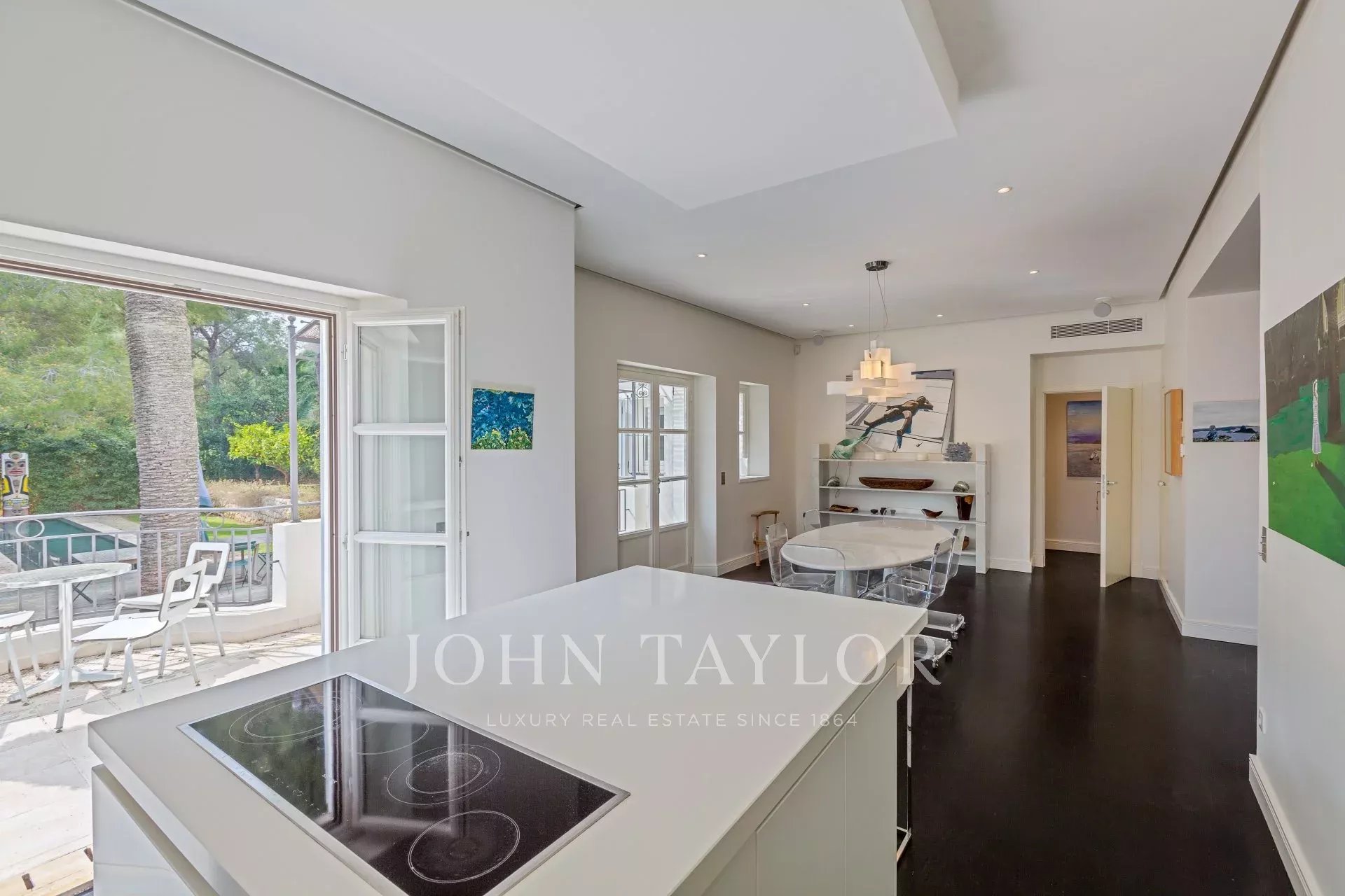 In a small private domaine, closed to the Garoupe beach, attractive and renovated property of approx. 400 sq.m, entirely air-conditioned, surrounded with beautiful grounds of 2 700 sq.m enhanced with waterfalls and fountains.