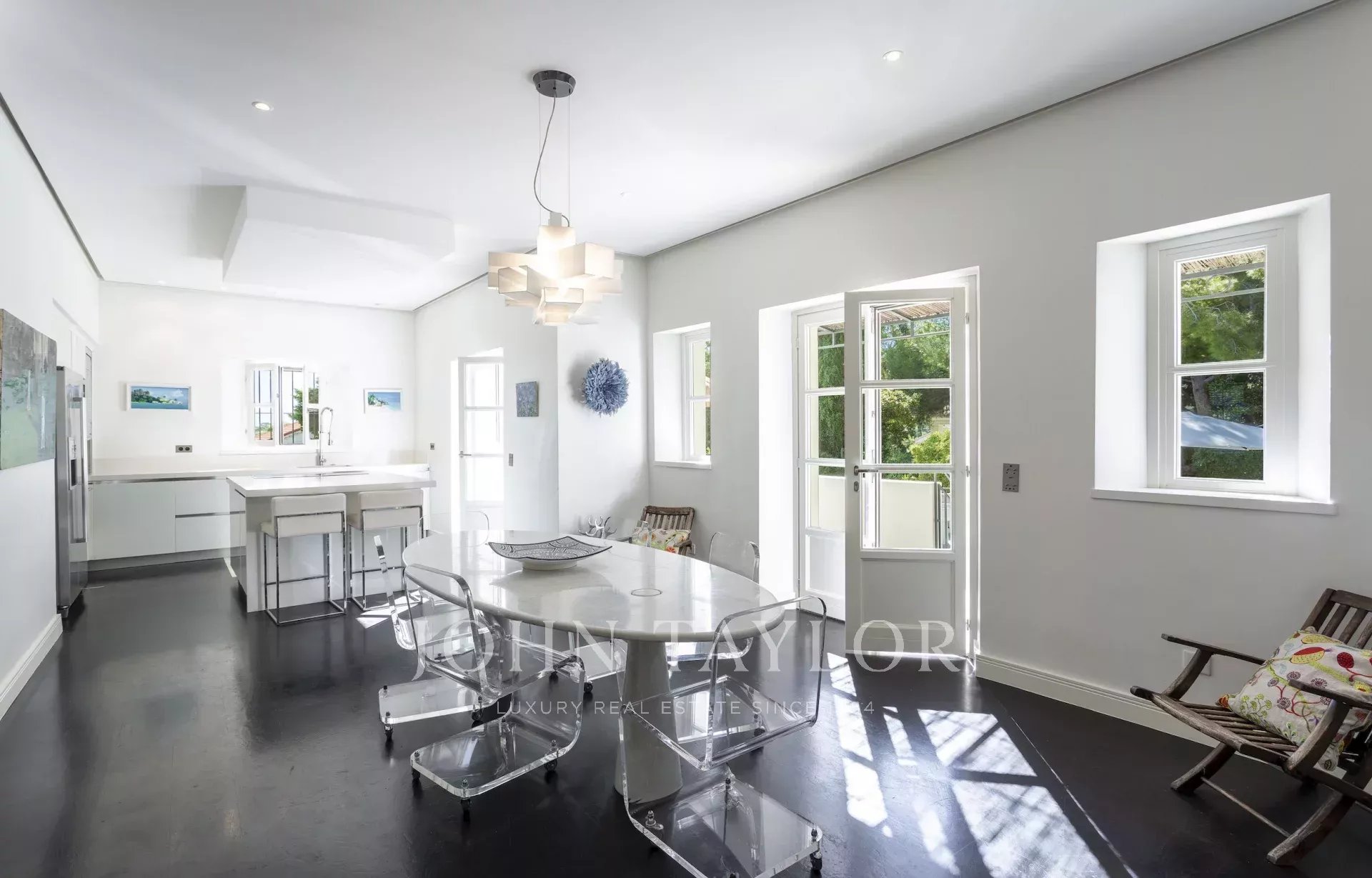Attractive and large reception with lounge, dining room and kitchen, opening onto the terrace