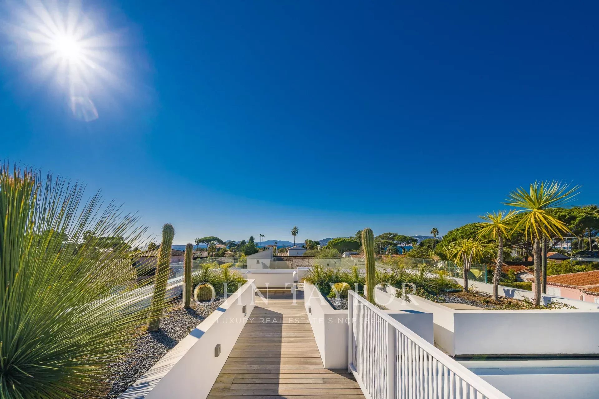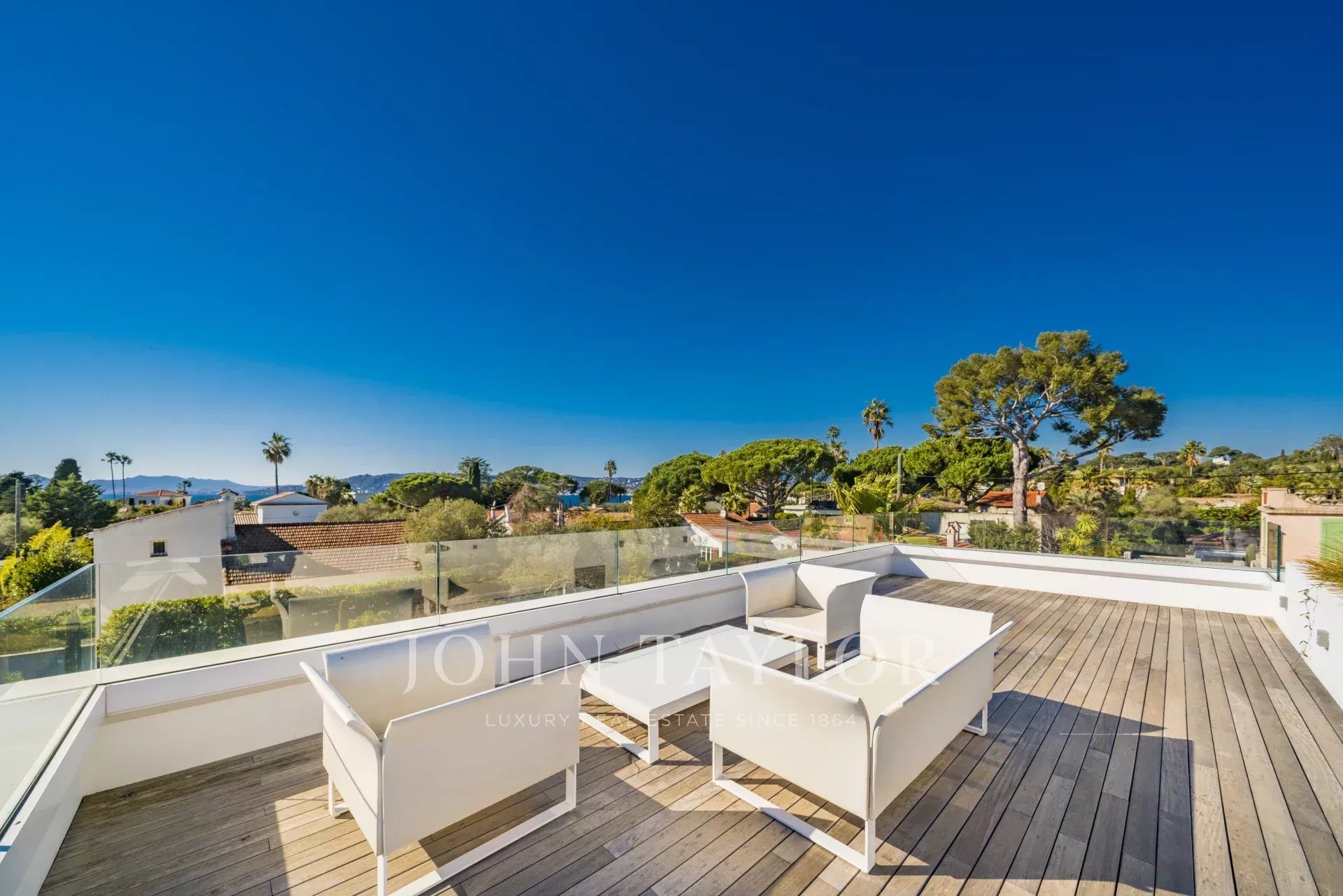 Beautiful new contemporary villa completed in summer 2020, offering 320 sq.m of living area surrounded with 940 sq.m flat grounds and enjoying nice sea views (the Bay of Juan les Pins and the Iles de Lerins) from its roof top terrace.