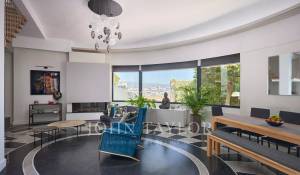 Entrance leading to the circular reception room opening by large bay windows onto the terrace and the garden, and comprising living room, dining area and open plan kitchen