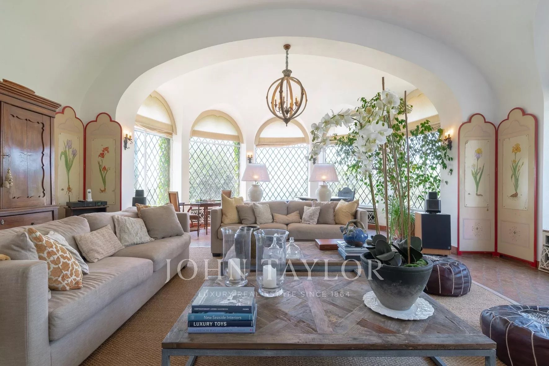 On the garden level, the property features a large living room, a dining room, a fully equipped kitchen with adjoining dining room, a large courtyard leading to the entrance hall, an office, a TV lounge, a master bedroom (180 cm bed) (1) opening onto a large balcony overlooking the Bay of Cannes, with en-suite bathroom.