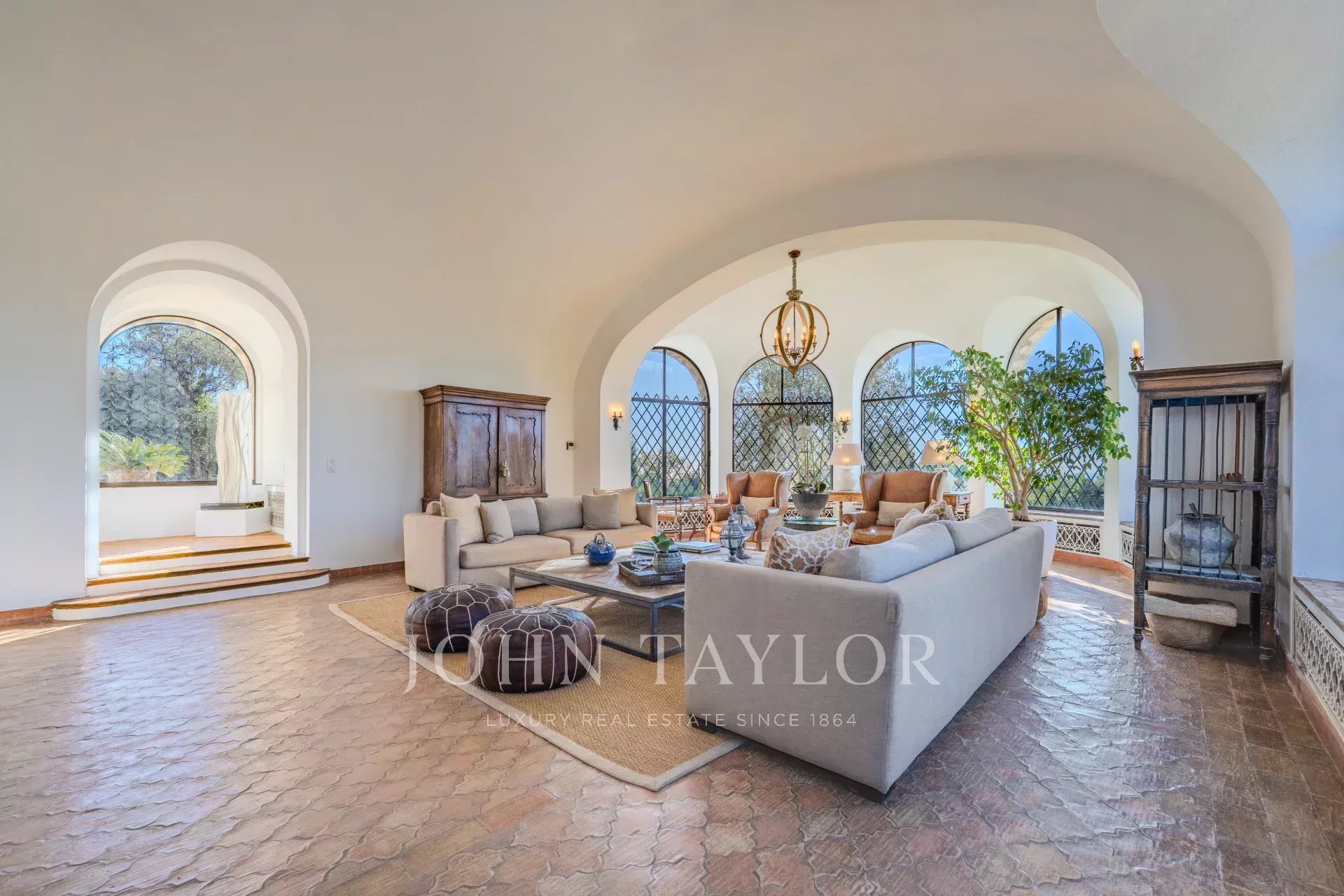 On the garden level, the property features a large living room, a dining room, a fully equipped kitchen with adjoining dining room, a large courtyard leading to the entrance hall, an office, a TV lounge, a master bedroom (180 cm bed) (1) opening onto a large balcony overlooking the Bay of Cannes, with en-suite bathroom.
