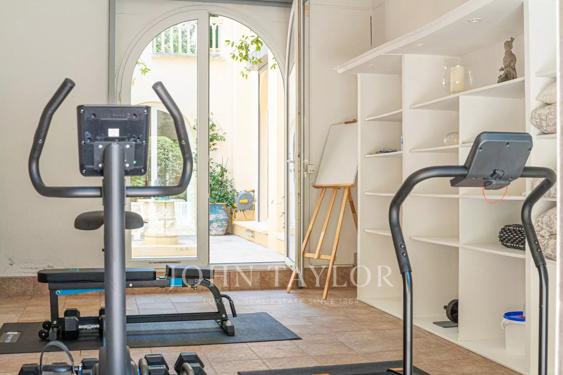 The first floor features a large living room, small sitting room, study, kitchen, dining room, gym, patio and access to a spacious covered terrace with ceiling fans.
