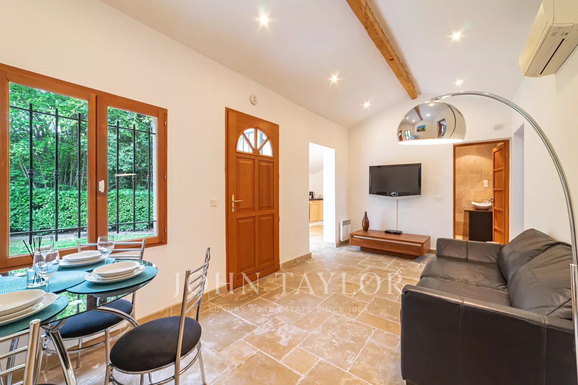 A guest house with air-conditioned living room and kitchen, a large air-conditioned bedroom, a small bedroom and a shower room with WC.