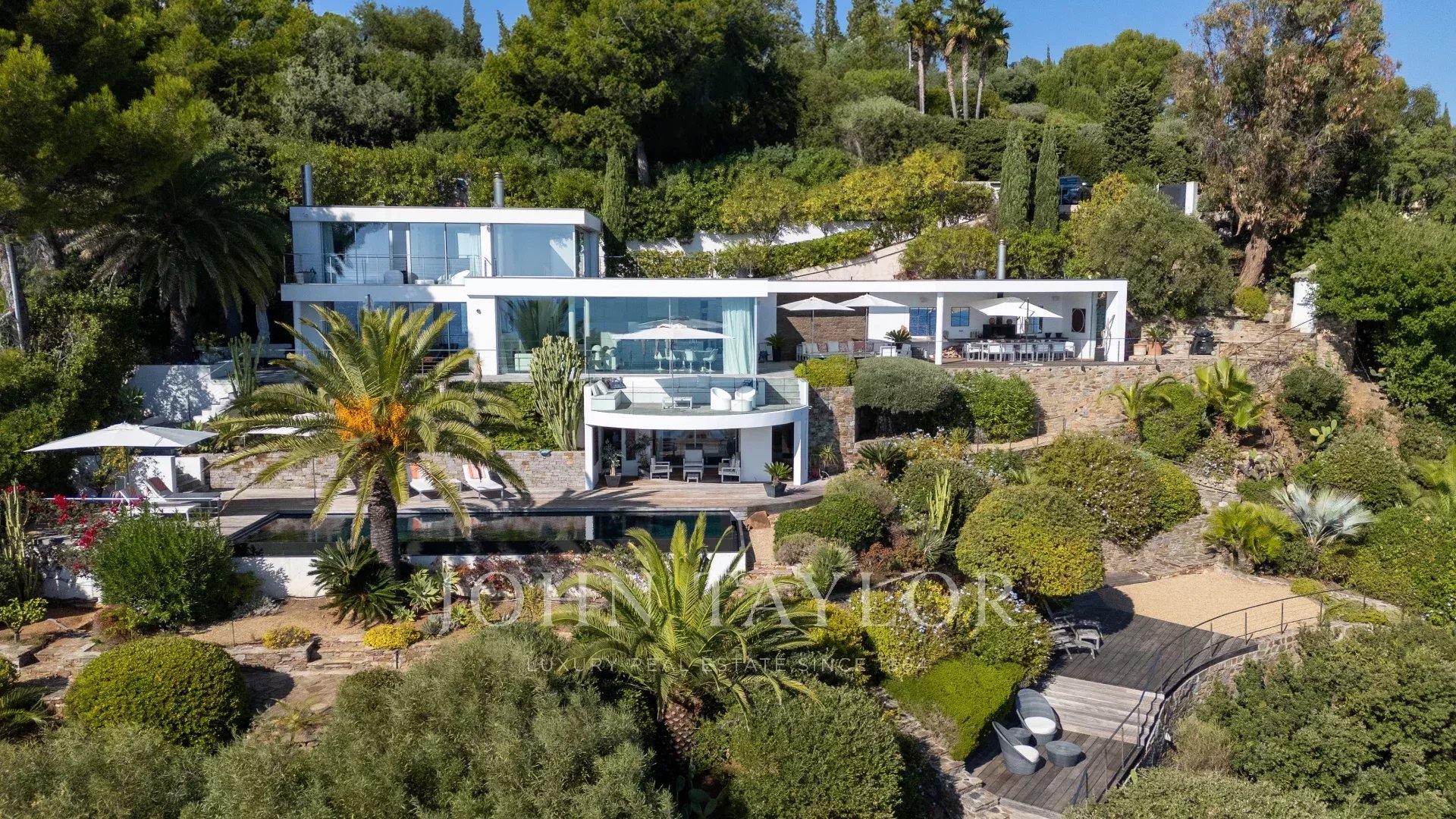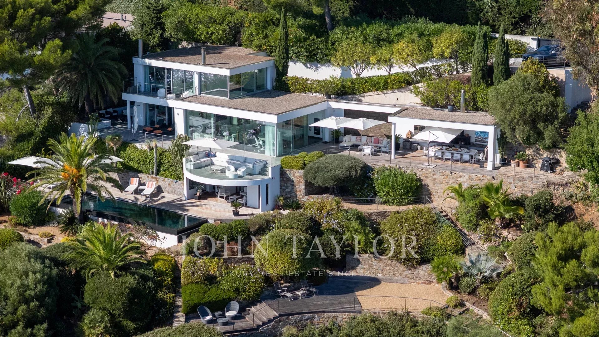 Main terrace with barbecue, large dining table and various outdoor lounge areas