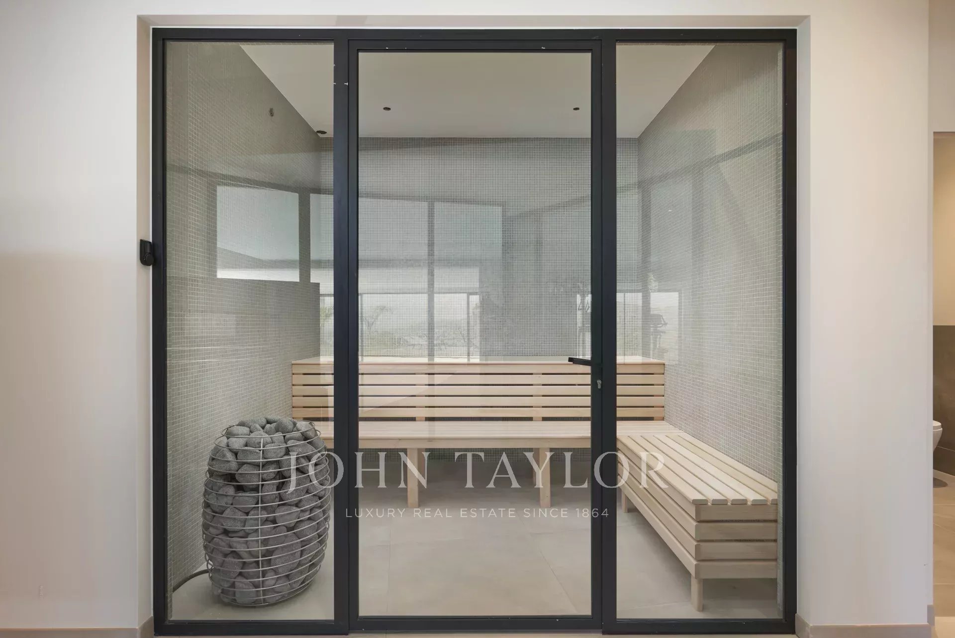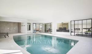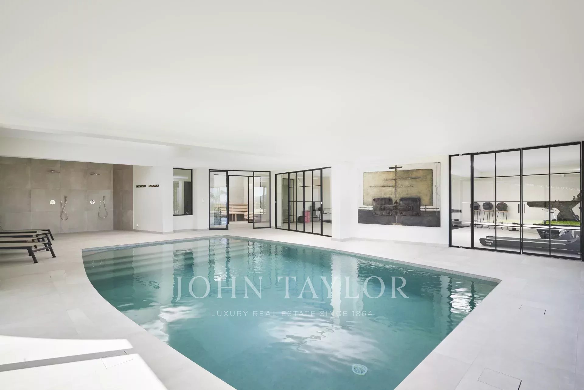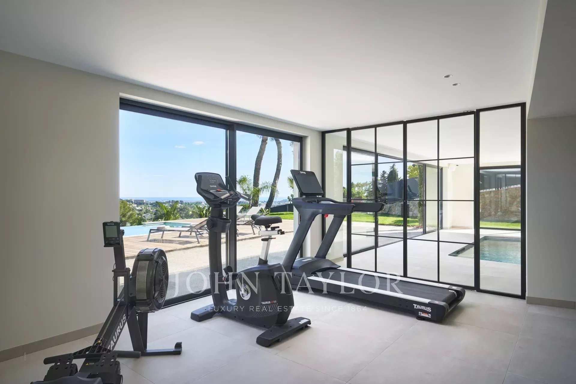 The garden level features an indoor swimming pool, a gym, a sauna, a shower room, a first bedroom (n°1) en suite with two beds (90cm) or one double bed (180cm) with terrace access, another bedroom (n°2) with two beds (90cm) or one double bed (180cm), and a third bedroom (n°3) en suite with two beds (90cm) or one double bed (180cm), a boiler room.