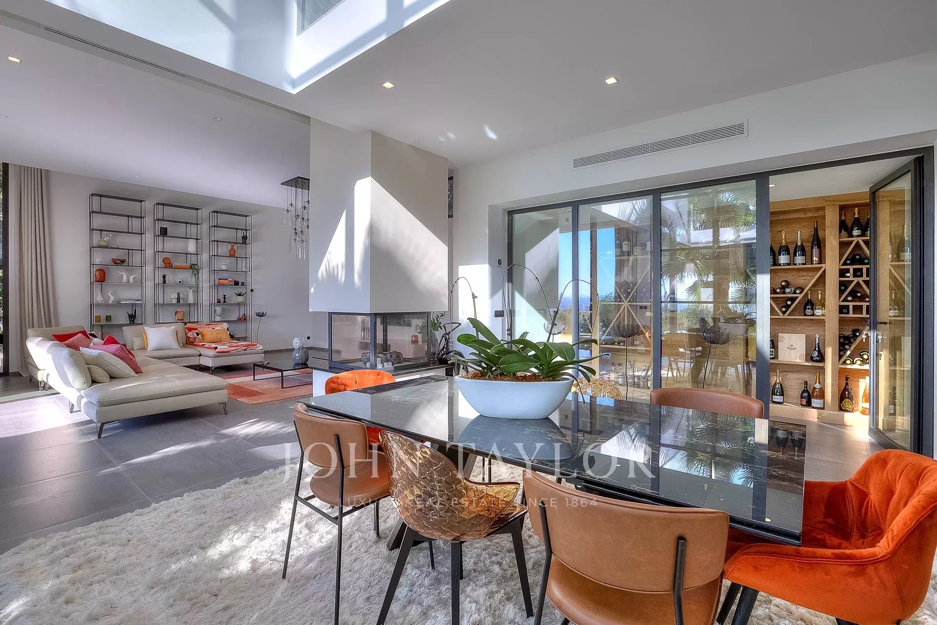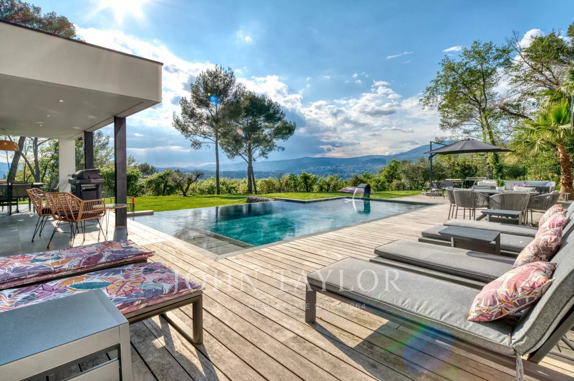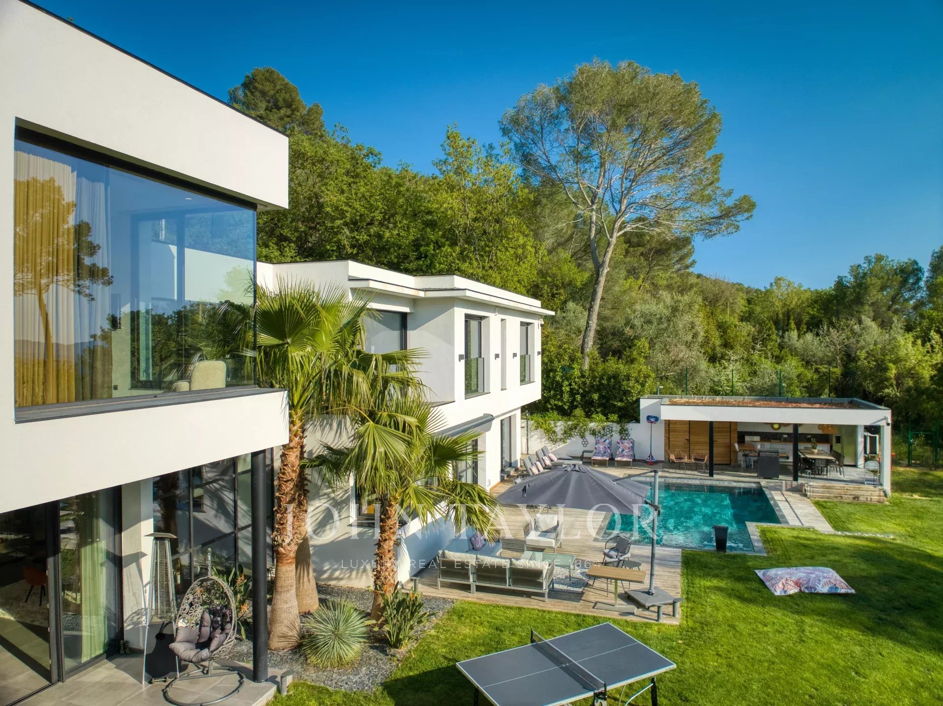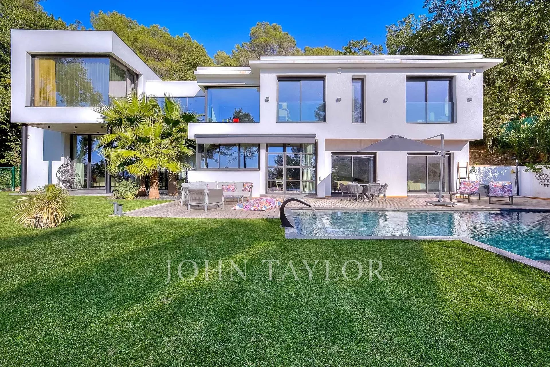 This exceptional 430 m² contemporary villa, ideally located near the sought-after villages of Mougins and Valbonne, offers an abundance of natural light through expansive bay windows and enjoys breathtaking panoramic views of the surrounding landscape.