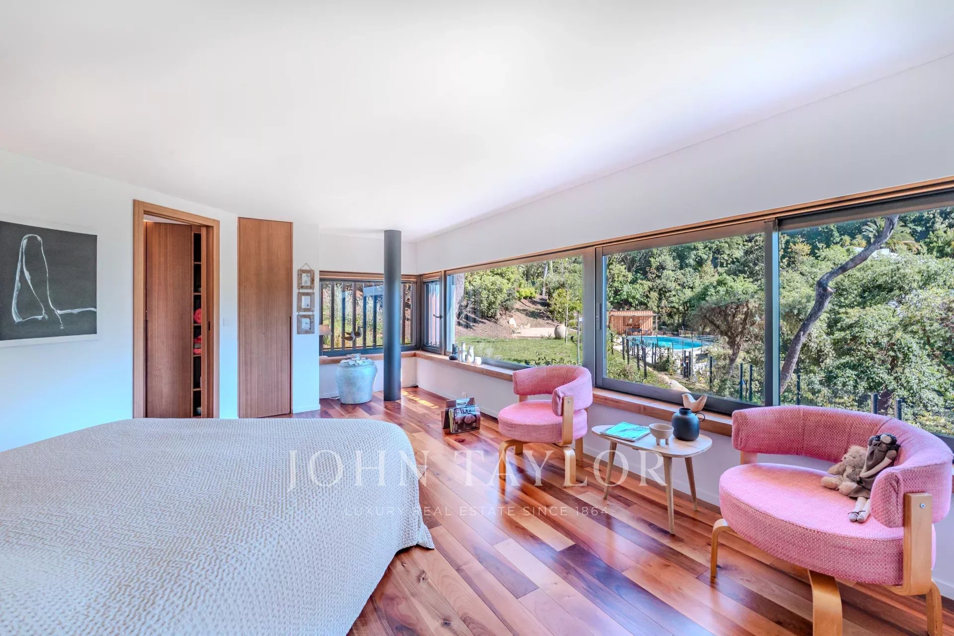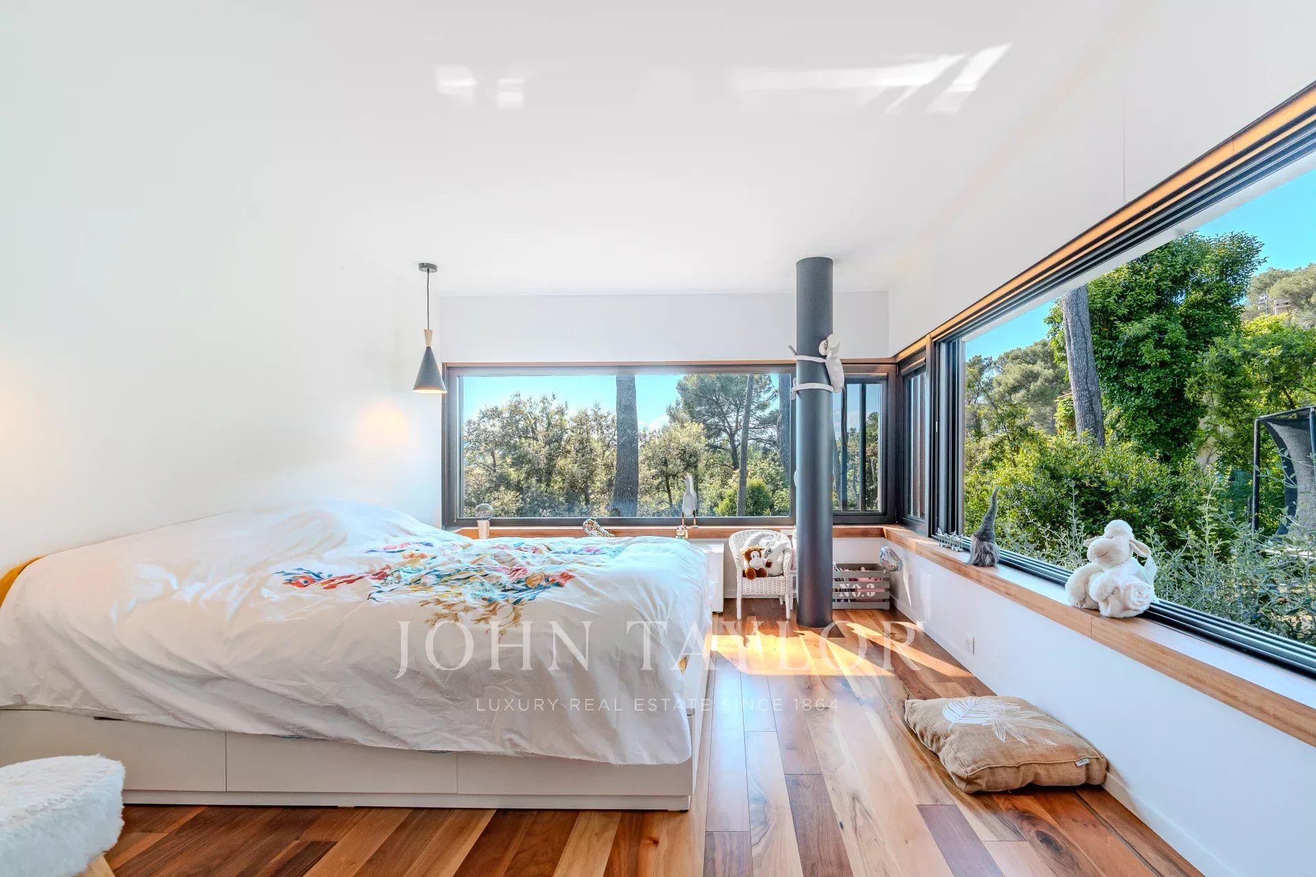 In a prestigious private estate, this architect-designed villa impresses with its contemporary architecture, sleek design, high-end materials, and exceptionally peaceful setting, surrounded by lush greenery.