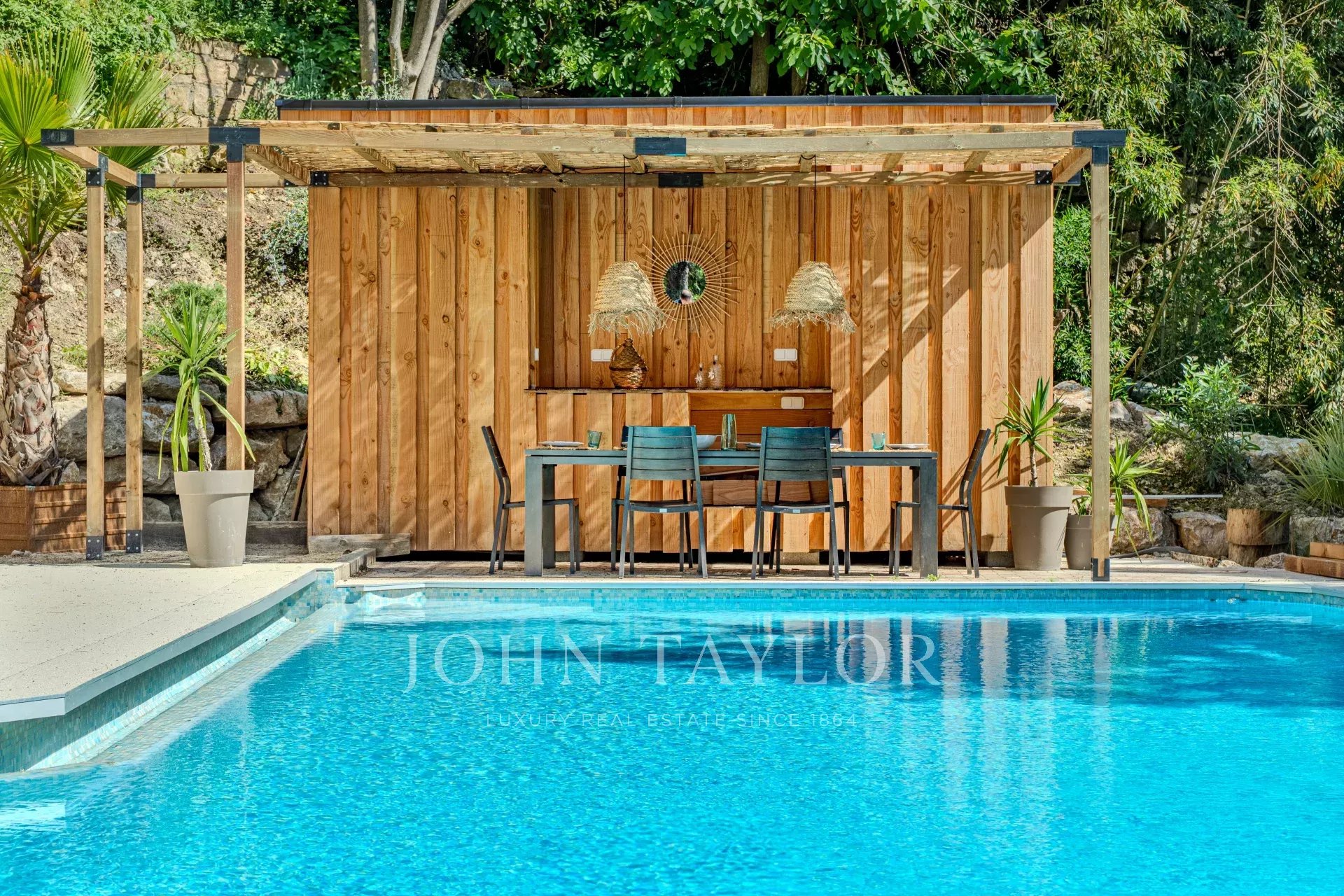 Beautifully landscaped garden with large swimming pool and pool house