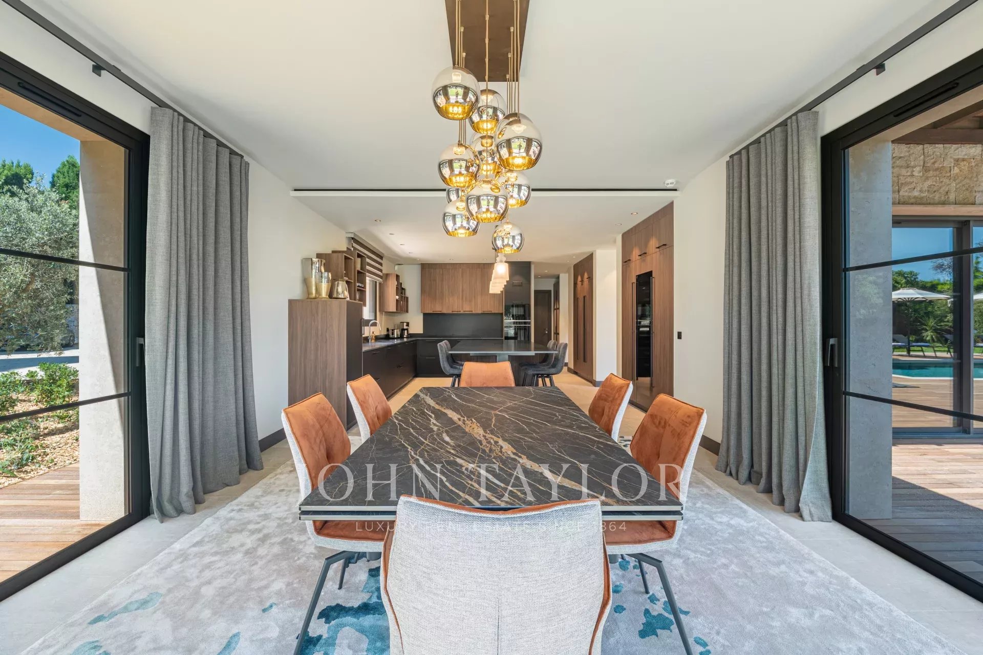 Bright and welcoming dining area opening onto the pool