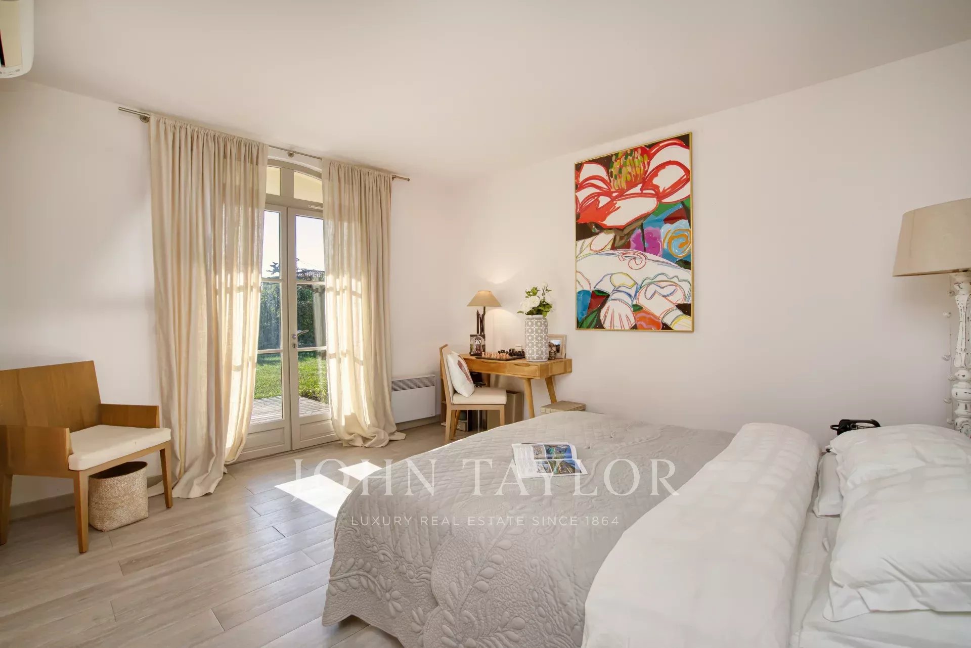 - A first bedroom with (160x200 bed), TV, wardrobes, shower room, WC, and sink separate from the bedroom.