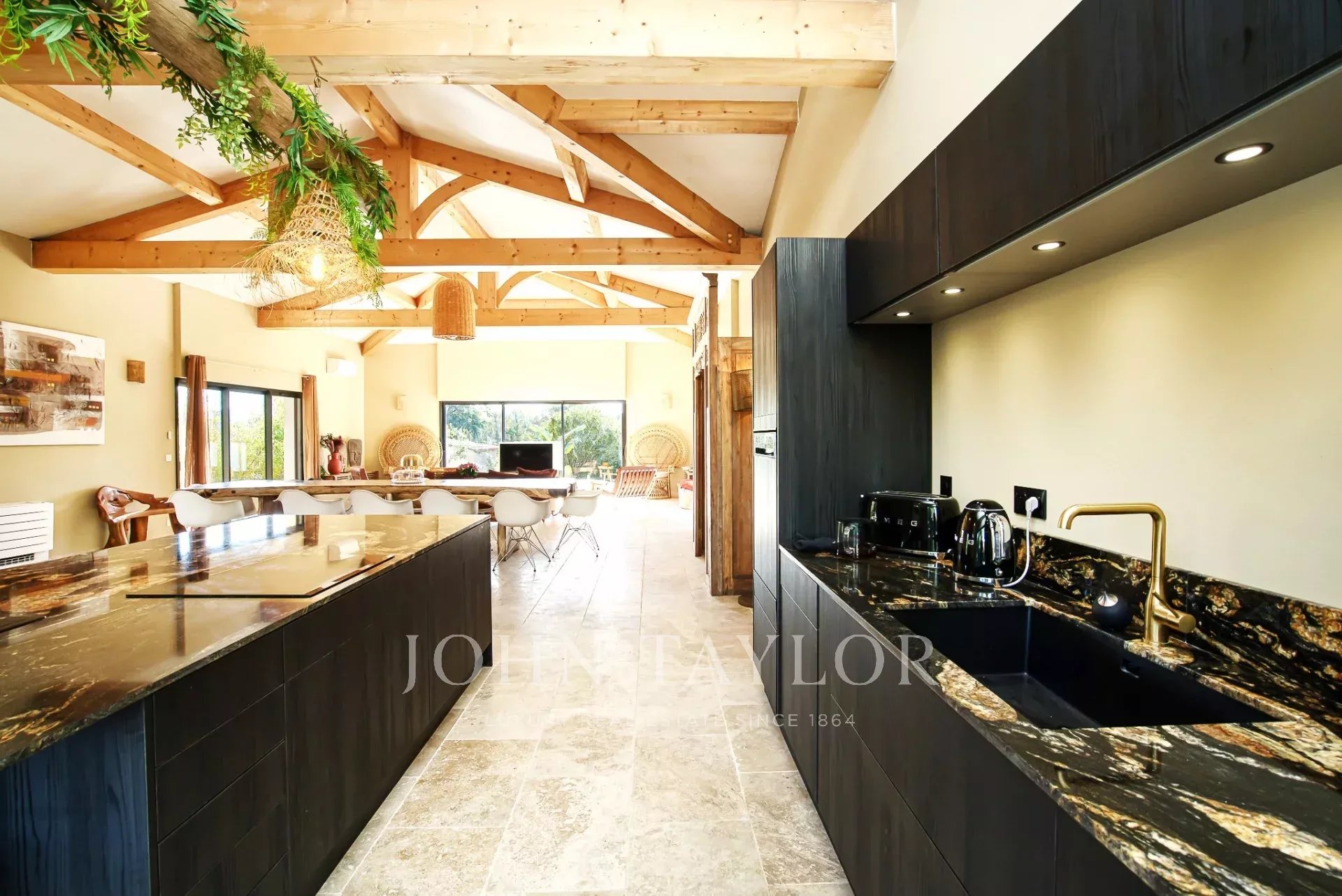 - A large living room comprising a lounge, a dining room and a fully-equipped kitchen (oven, microwave, Nespresso coffee machine, dishwasher, two fridges with a freezer section).