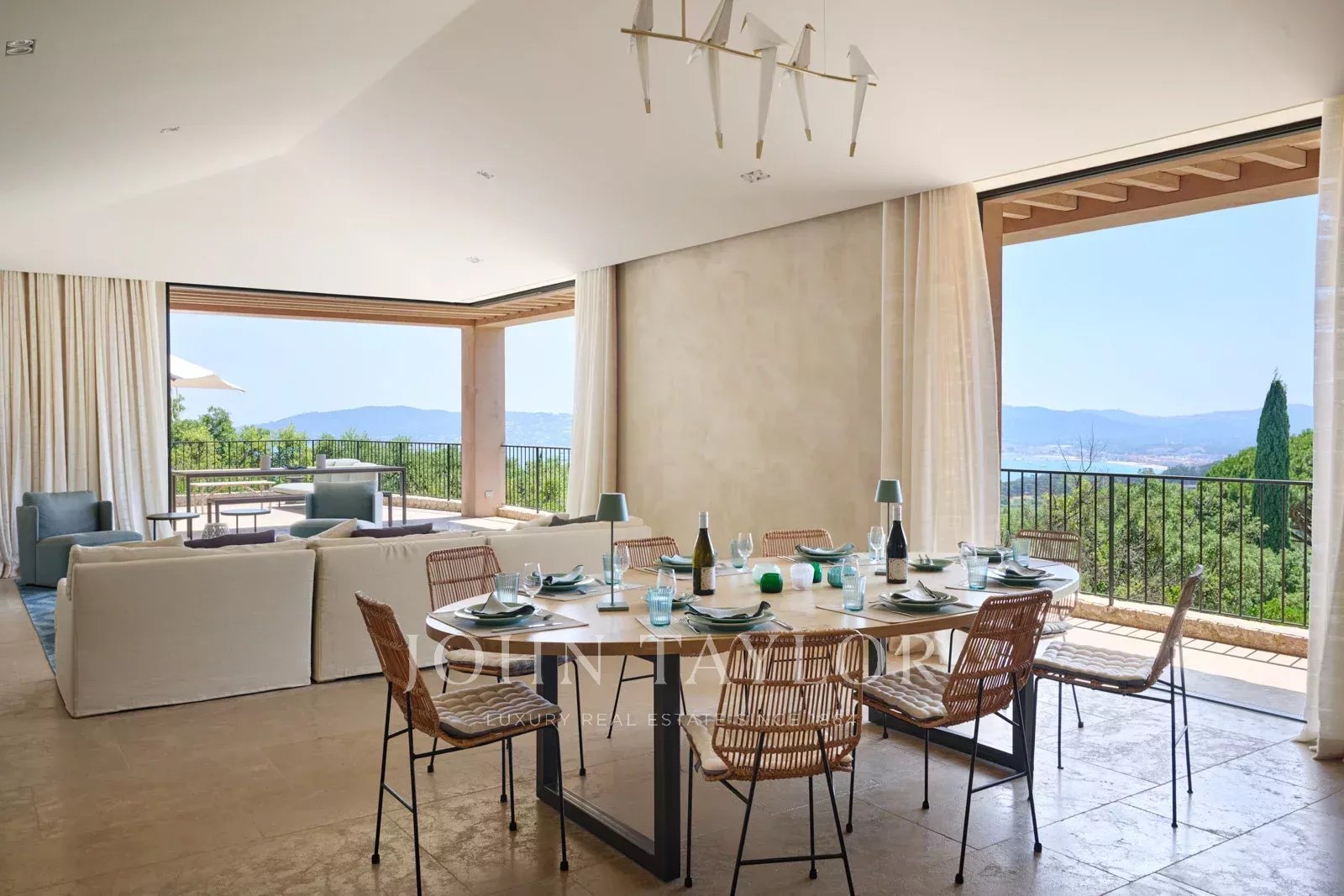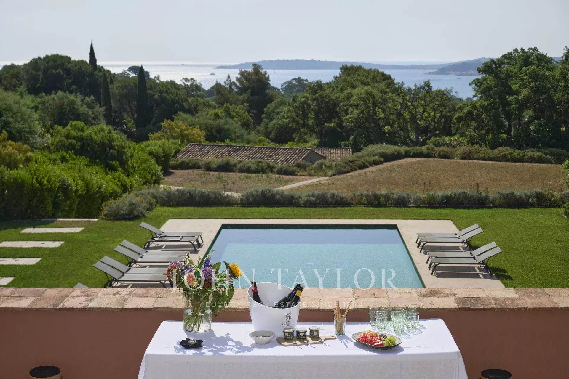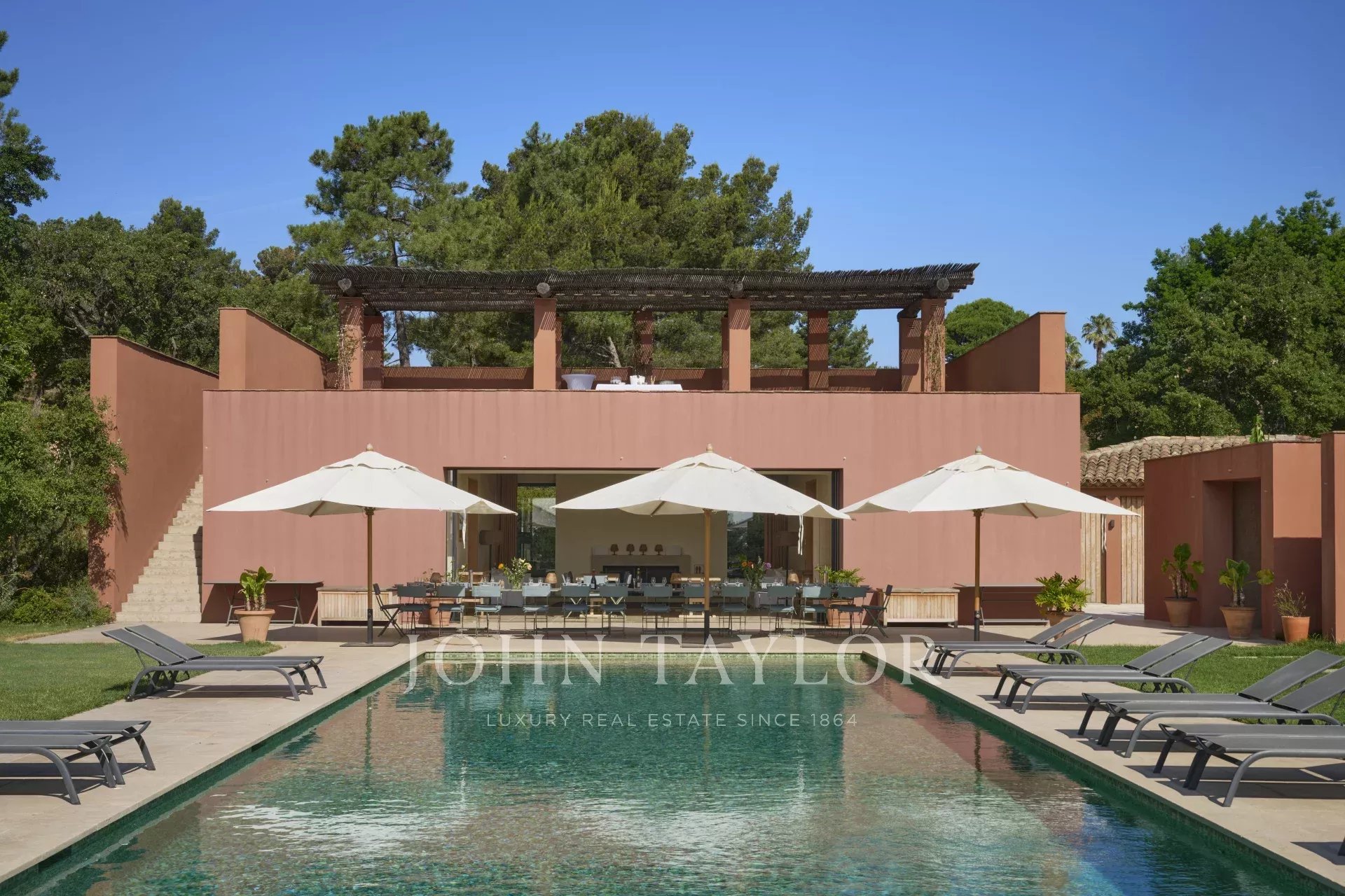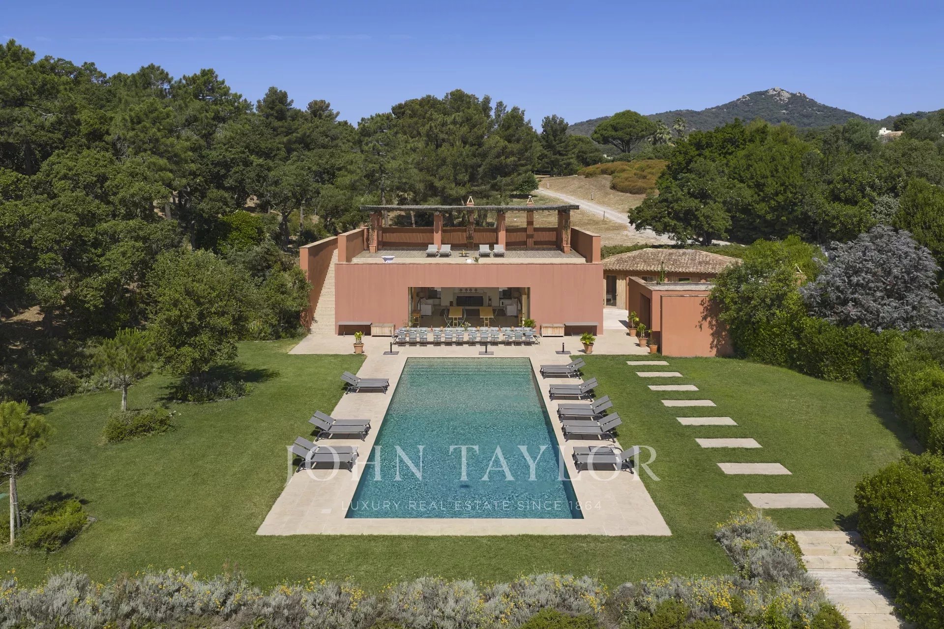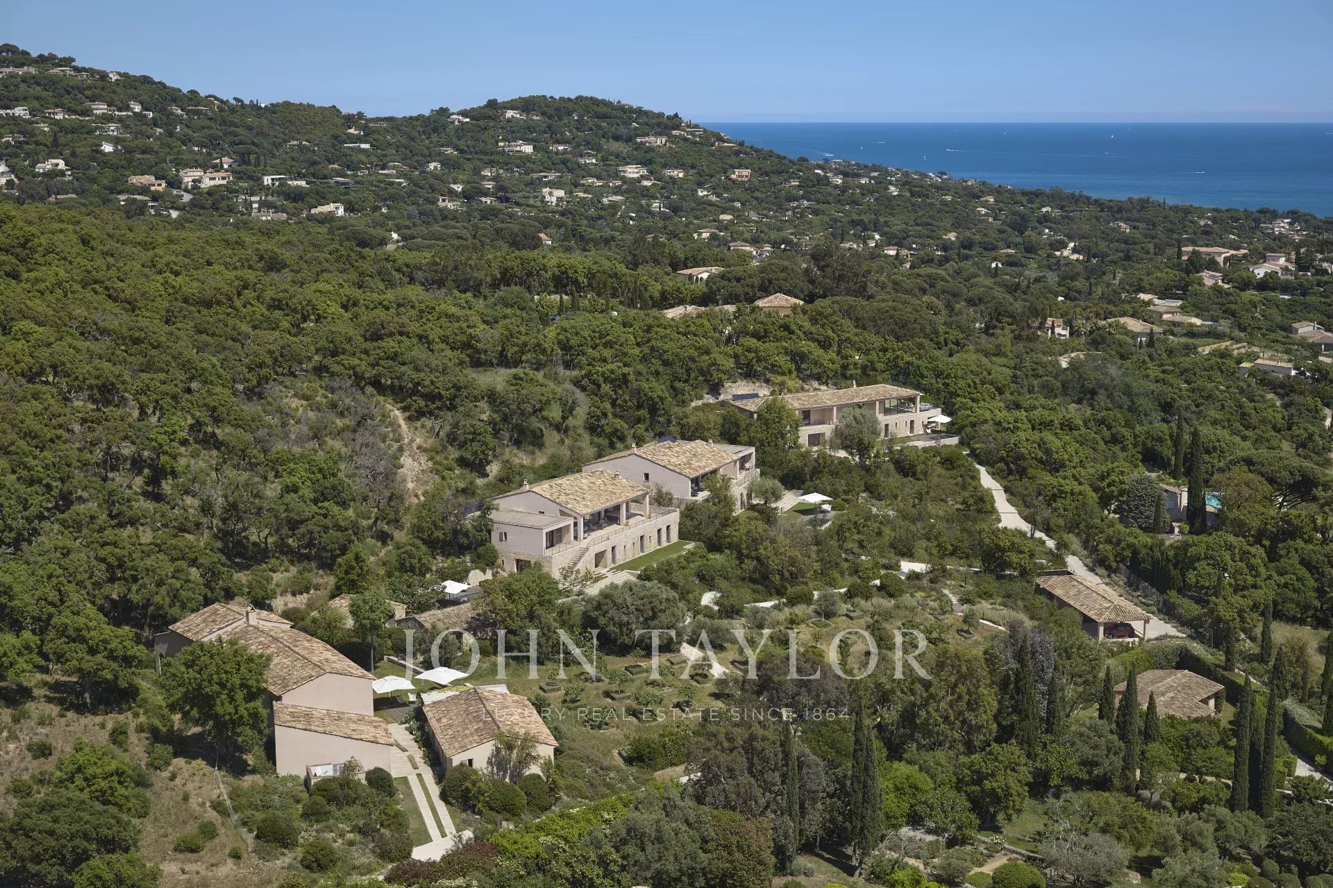 In the heart of the Gulf of Saint-Tropez, on the edge of the Maures forest, you can discover this exceptional place. The 7-hectare estate features 25 rooms in 5 large houses. The property boasts numerous terraces and gardens from which to admire the Mediterranean, as well as a vast pool house in front of the immense swimming pool, the ideal place to gather with family and friends. Built in a family spirit around an orchard, each house has its own indoor and outdoor lounge, as well as a private swimming pool.
