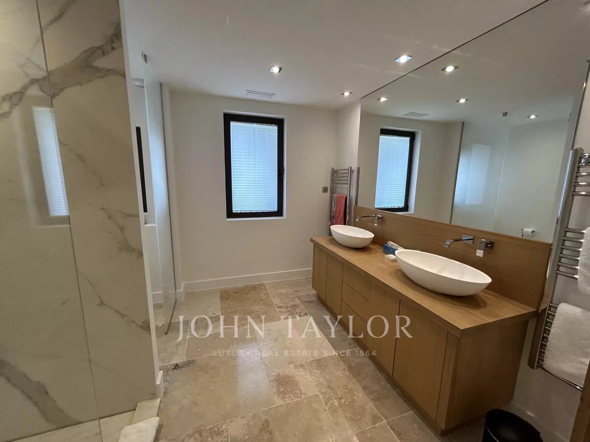 - A second bedroom with a double bed (160x200), desk, cupboards, shower room with double washbasin and separate toilet.