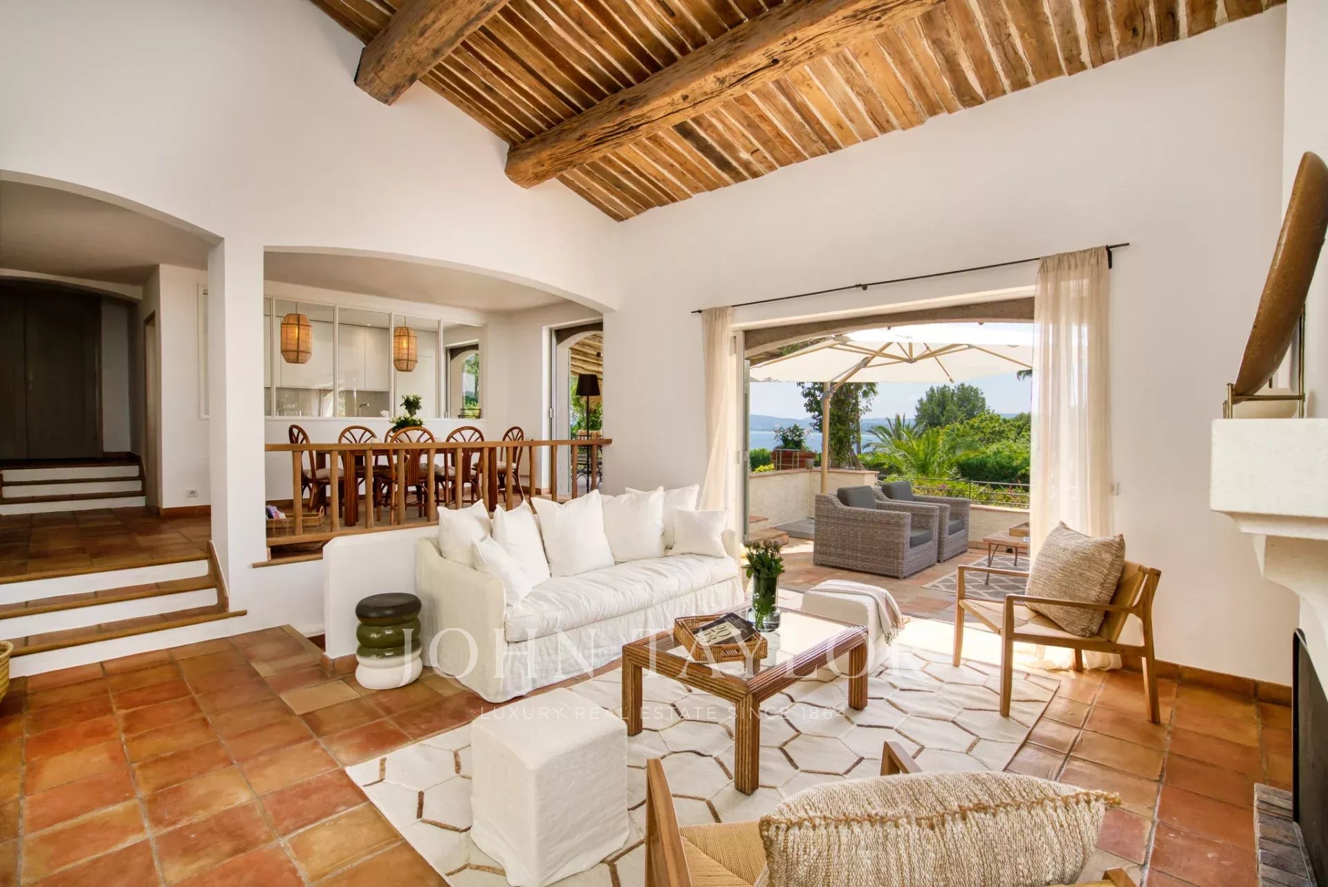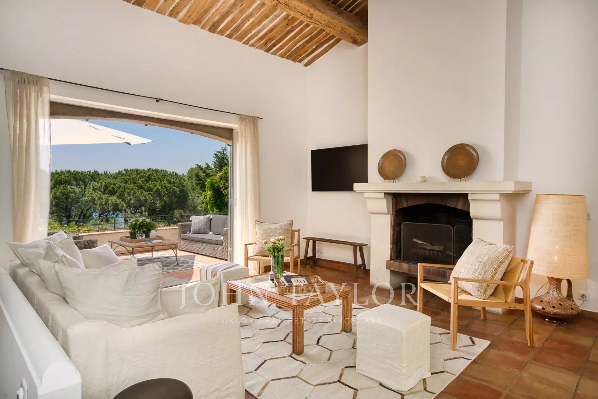 - a living room with fireplace opening on a terrace with sea view and a patio sheltered from the wind