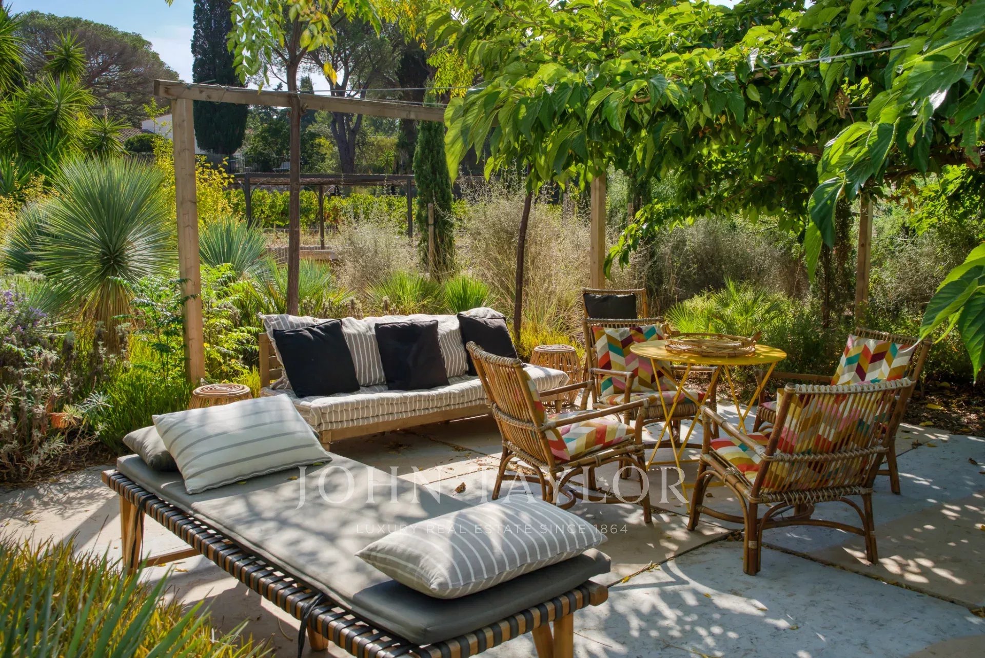 Once an artist's workshop, this meticulously renovated property exudes character and charm. Fully air-conditioned, it boasts a lush garden spanning approximately 5000 sq.m, meticulously crafted by the renowned landscape architects "Essard et Maurieres," offering exclusive access to the Bay of Canoubiers.