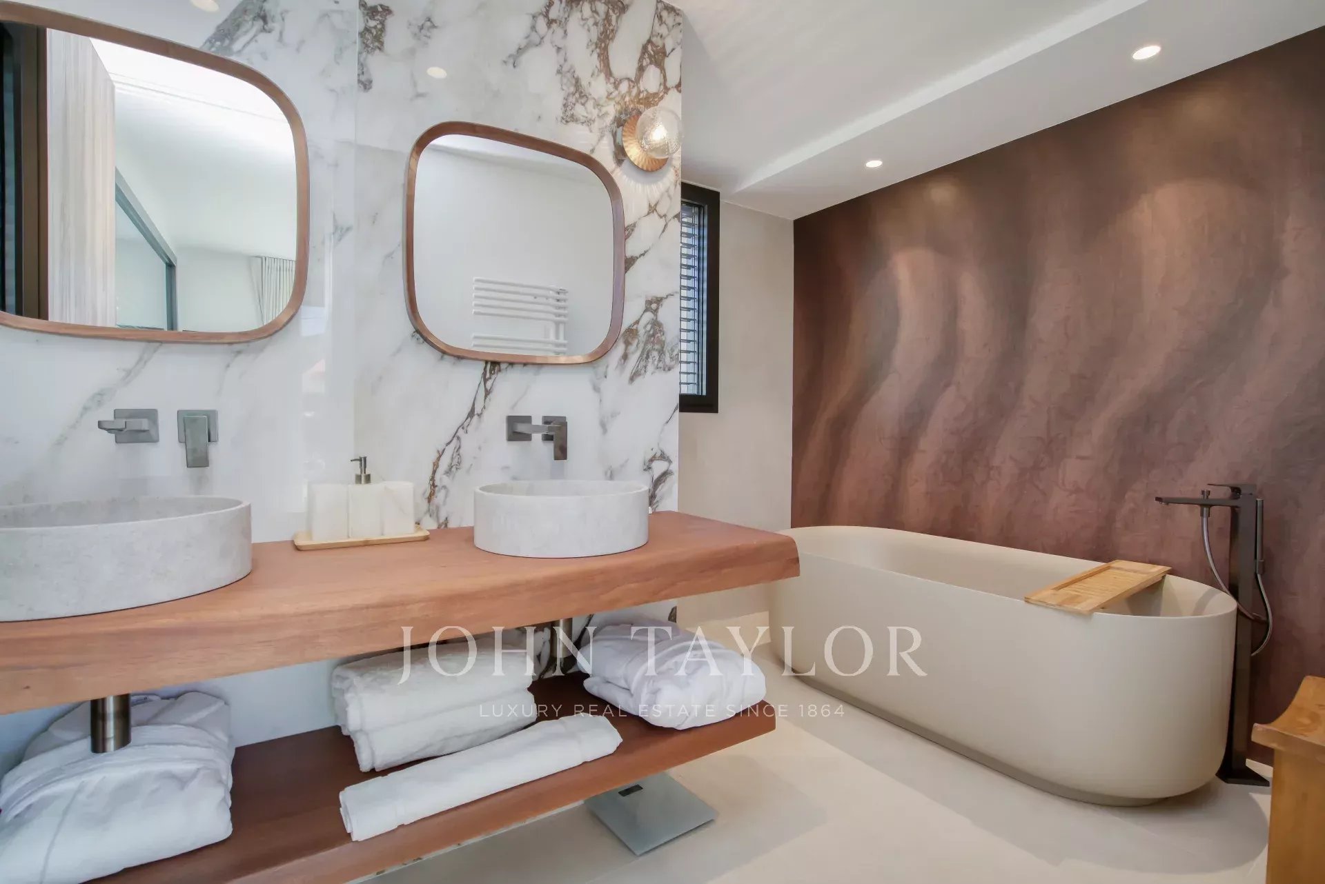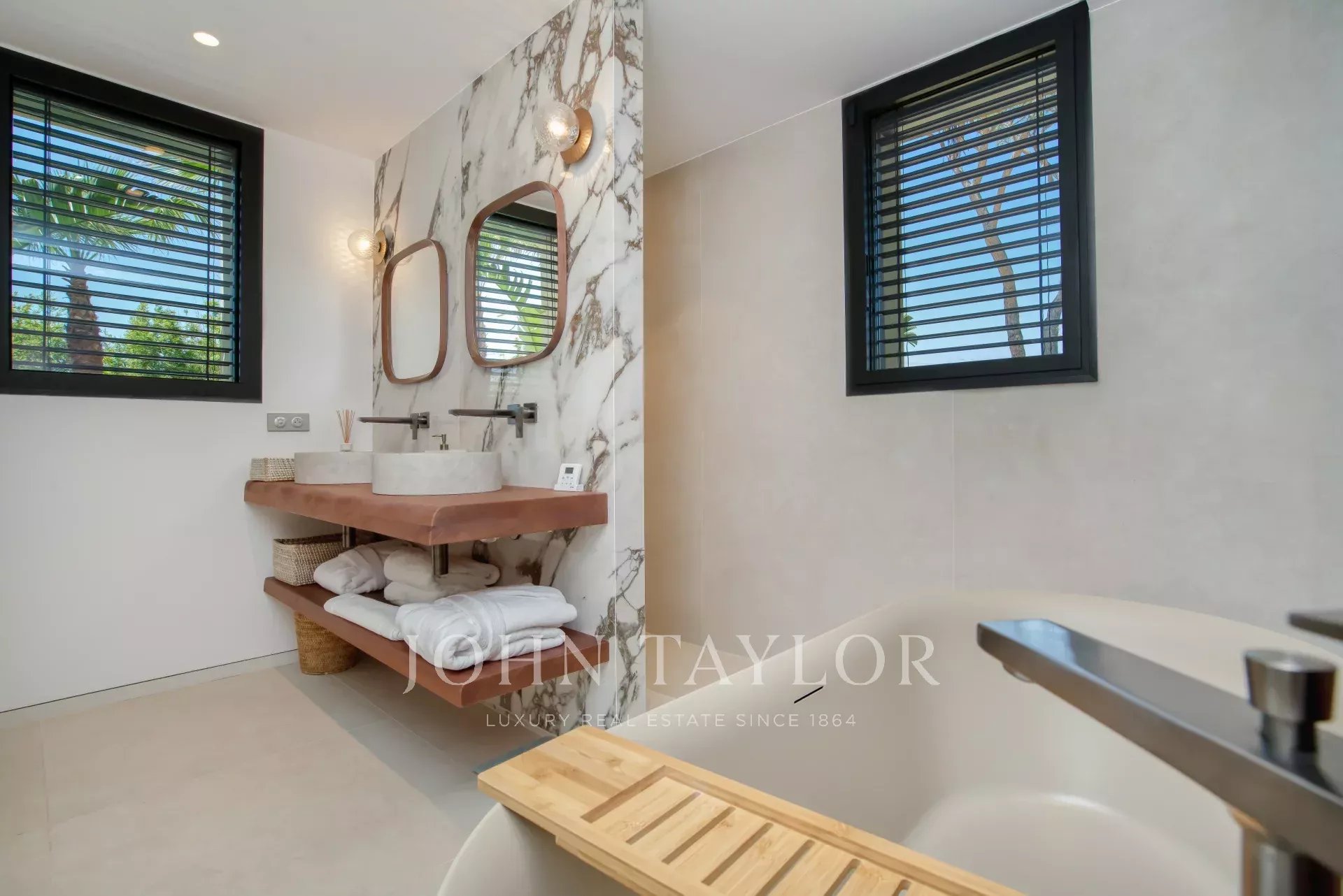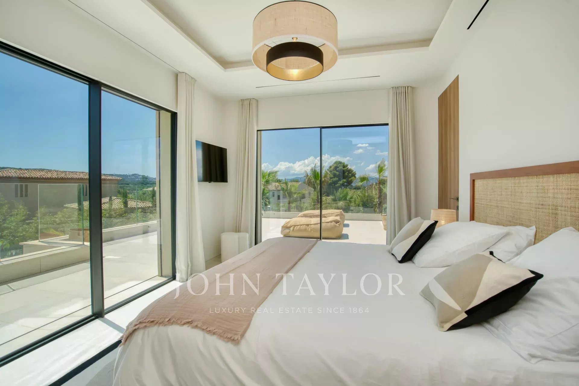 - Bedroom 2: This room features a terrace, king-size bed (180x200), shower room with double basin, toilet as well as closets with a safe.