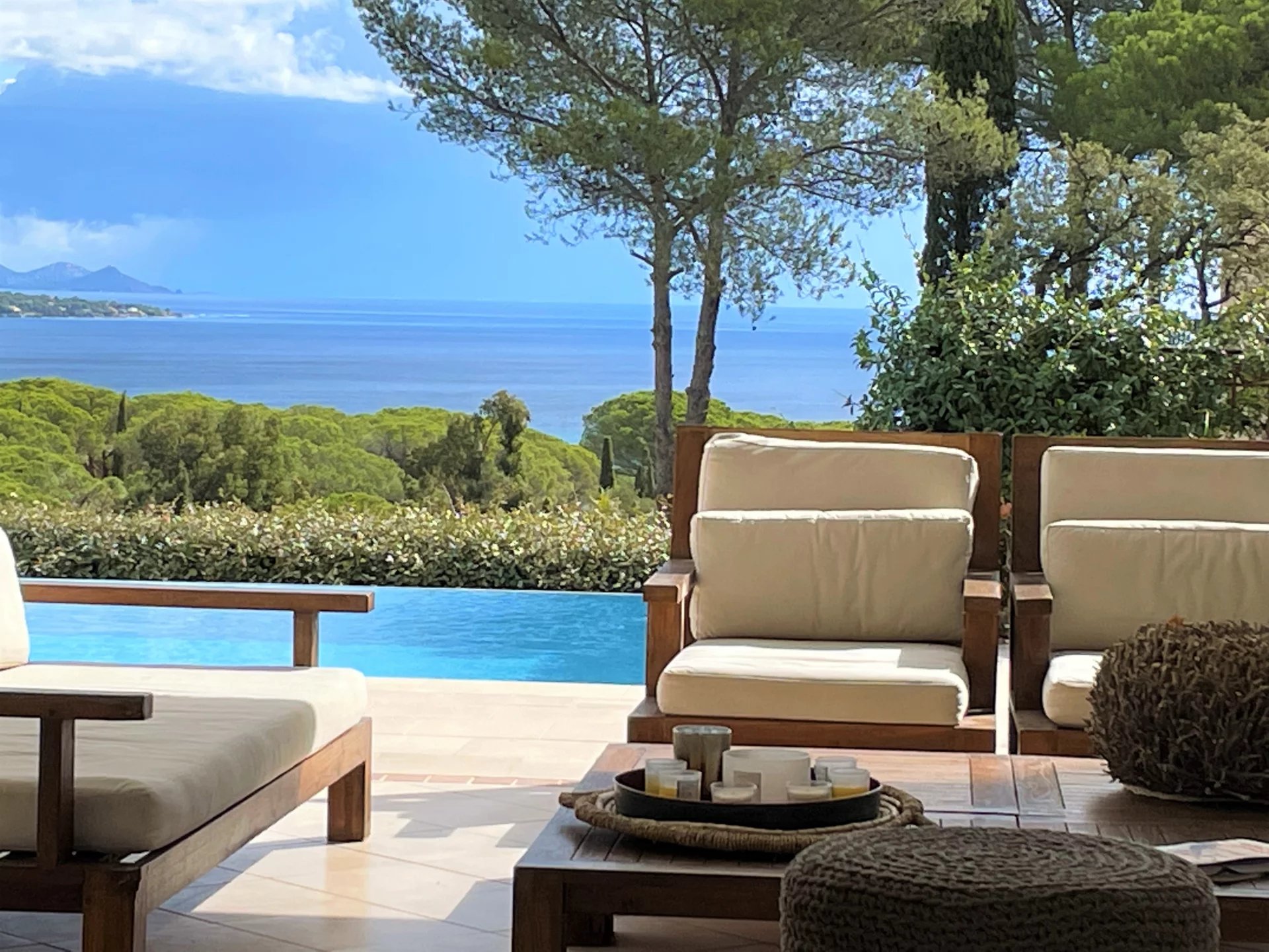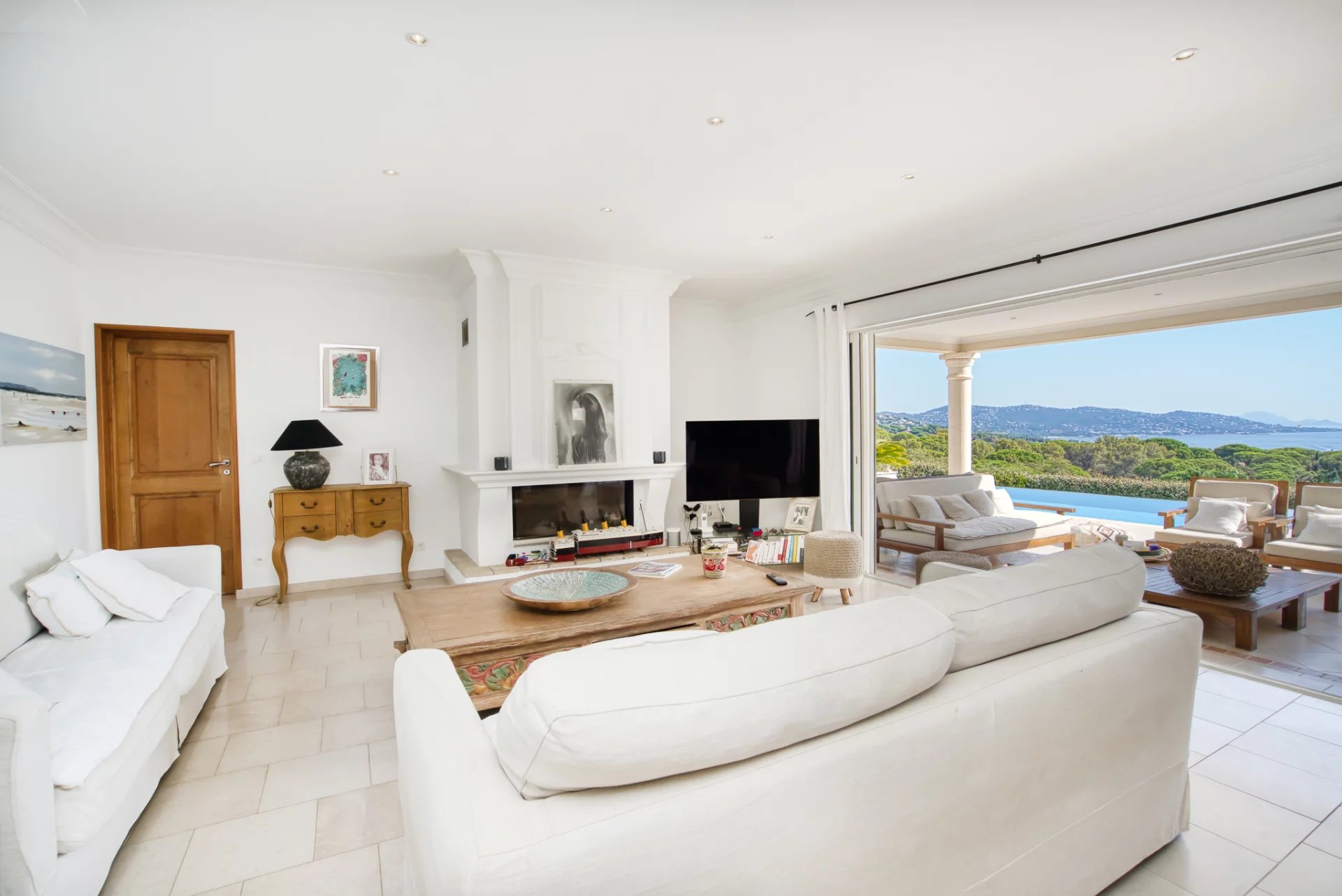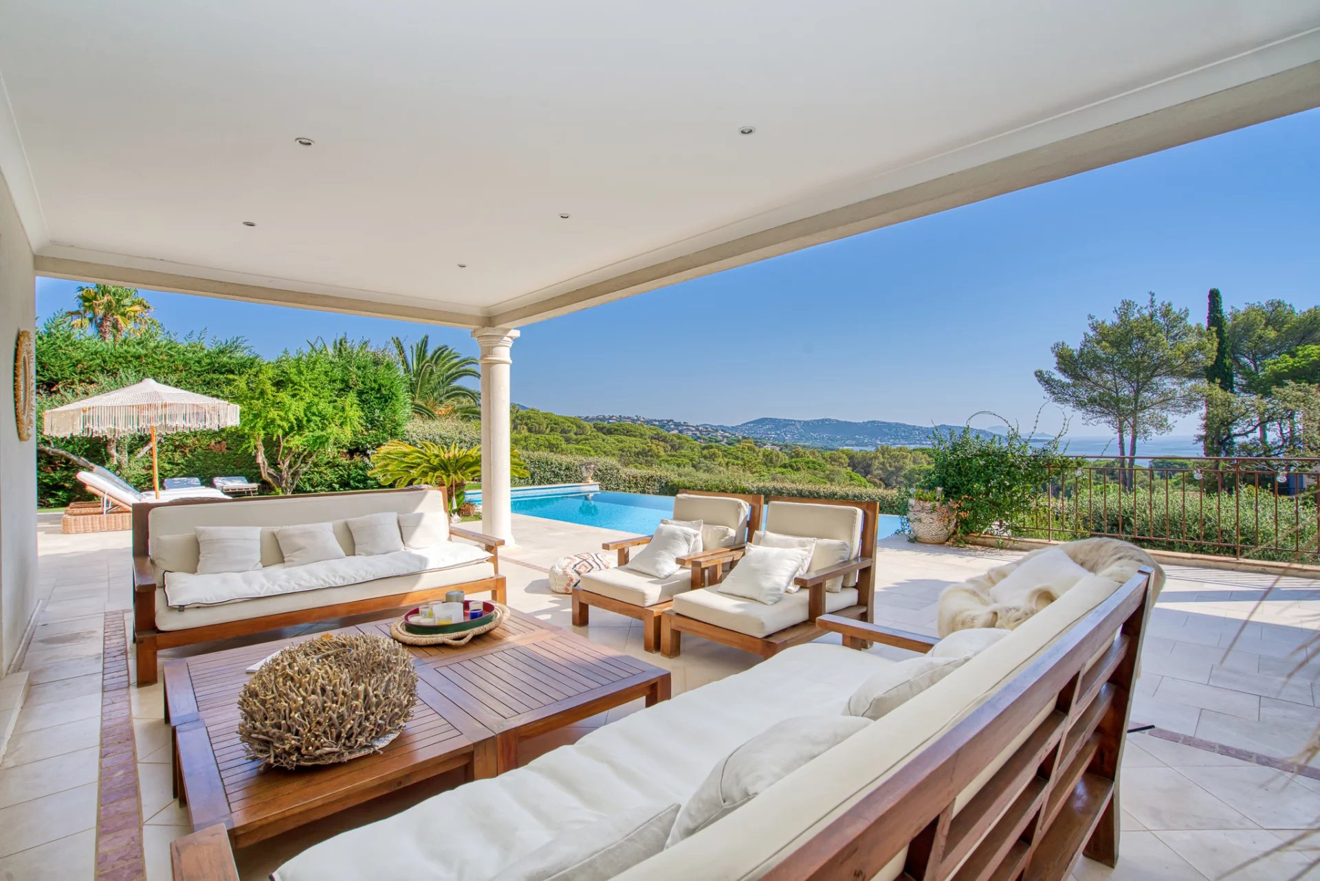 A large living room comprising a lounge and dining room opening onto a beautiful covered terrace with sea view.