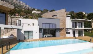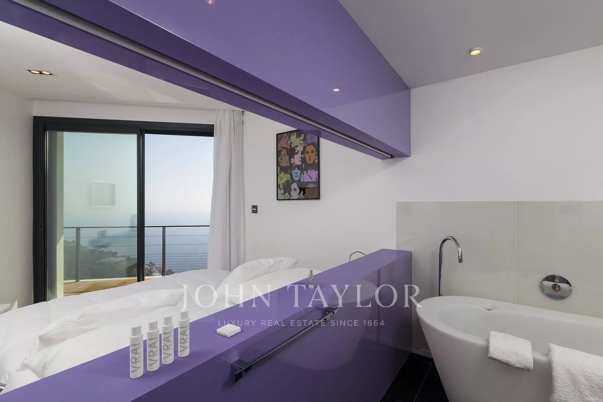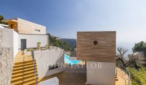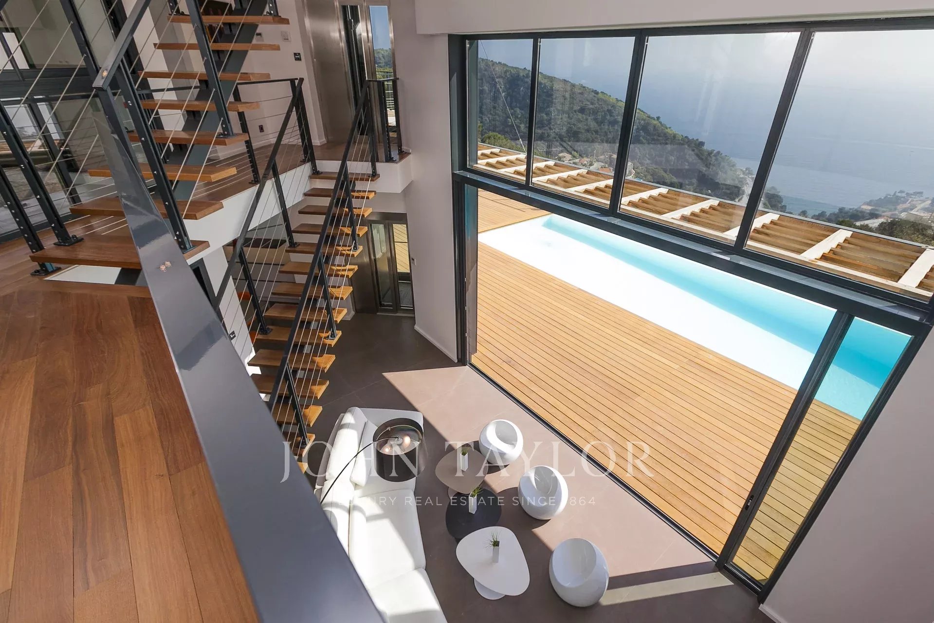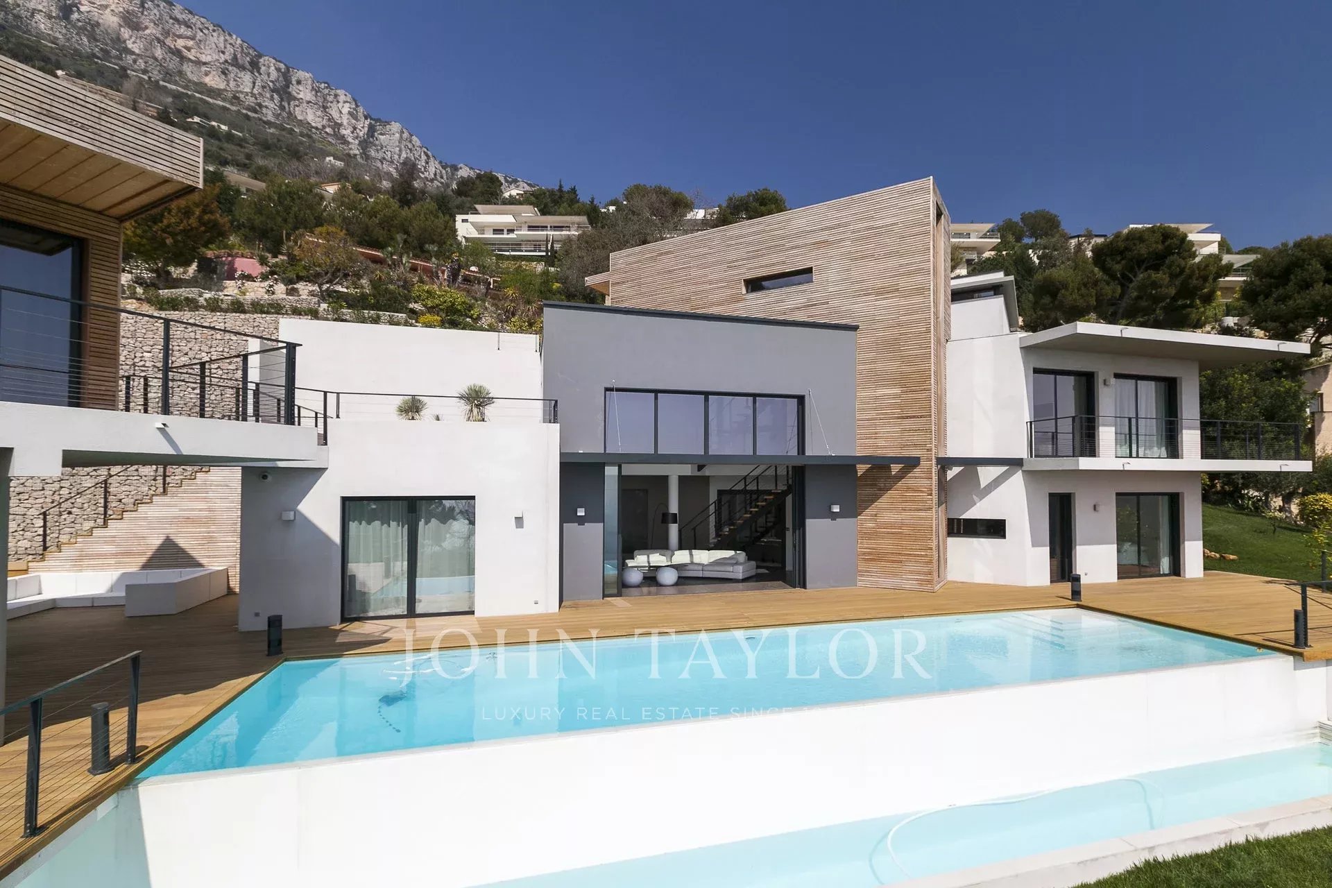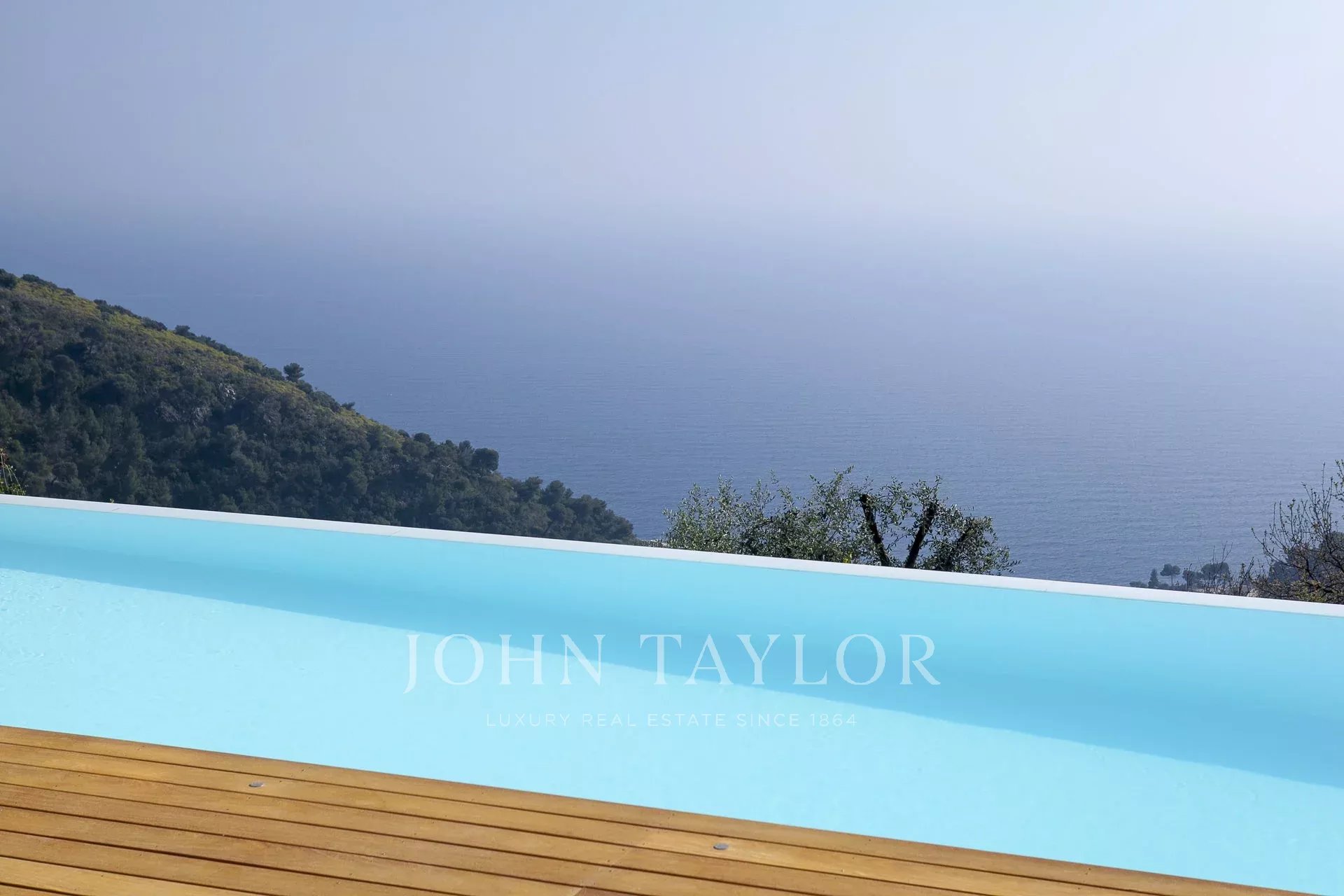 Superb contemporary villa of approximately 350 sq.m of living space set on a plot of land of approximately 2 200 sq.m, situated on the heights of Eze, in a residential area and offering a magnificent view over the sea and the hills. The villa consists of 5 bedrooms, each with a bath or shower room, a living room opening onto a large terrace with heated swimming pool, dining area, fully fitted kitchen with professional scullery.