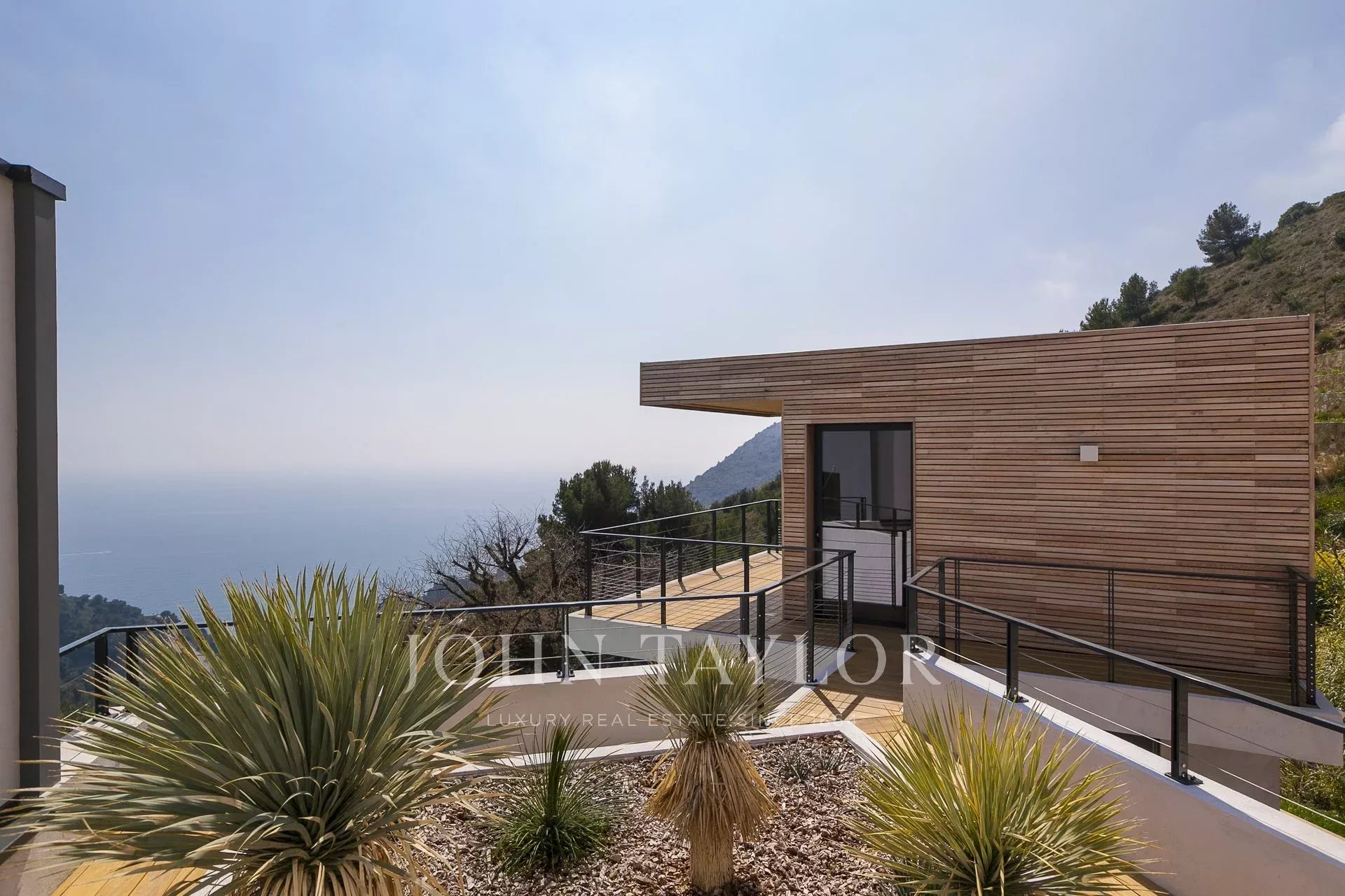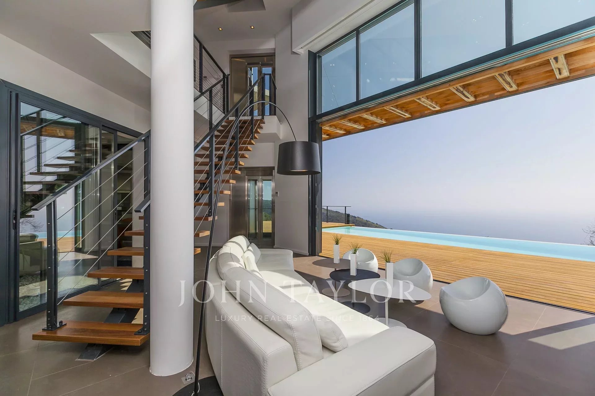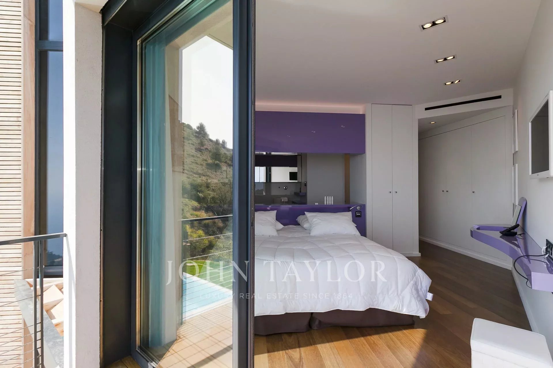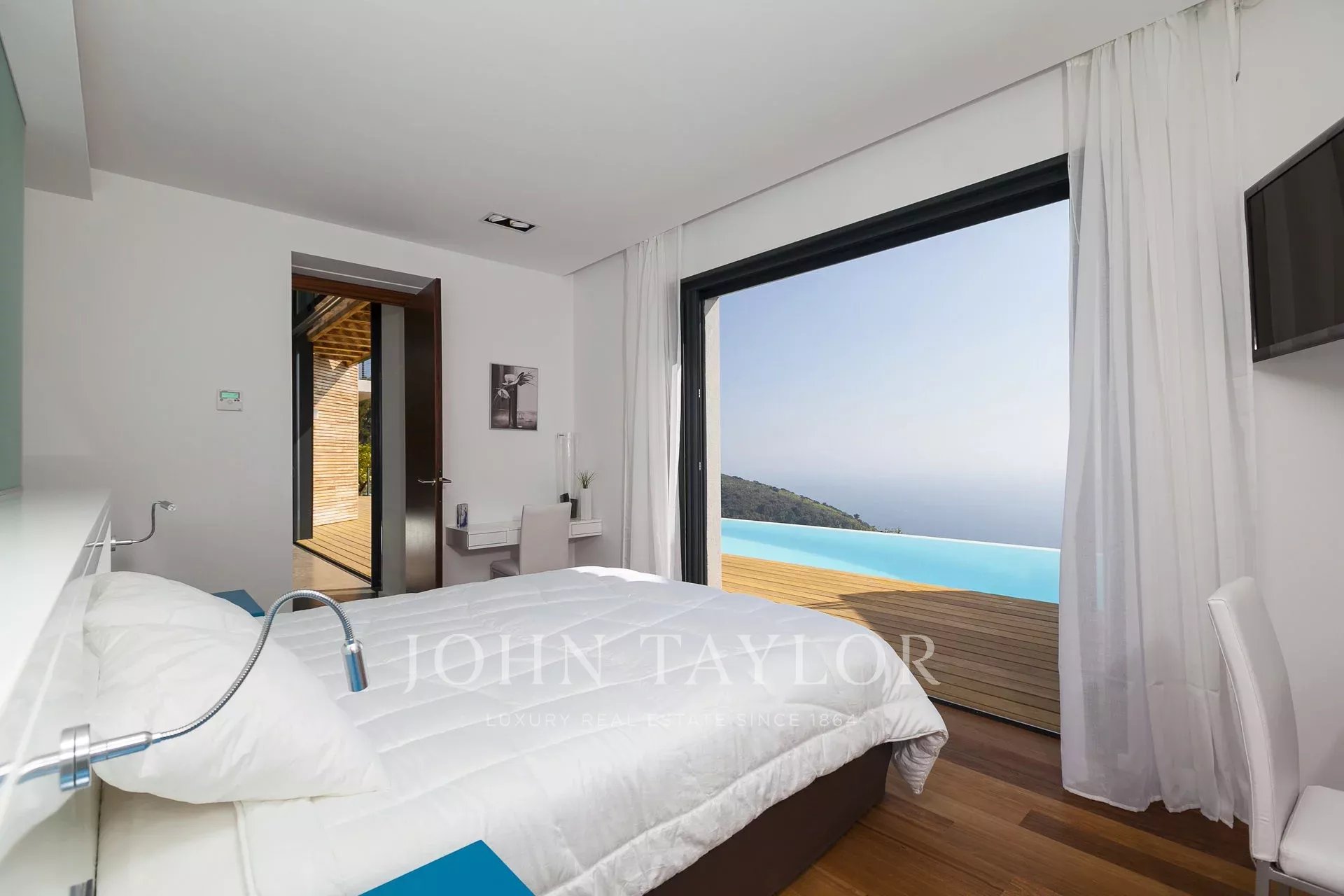 Superb contemporary villa of approximately 350 sq.m of living space set on a plot of land of approximately 2 200 sq.m, situated on the heights of Eze, in a residential area and offering a magnificent view over the sea and the hills. The villa consists of 5 bedrooms, each with a bath or shower room, a living room opening onto a large terrace with heated swimming pool, dining area, fully fitted kitchen with professional scullery.