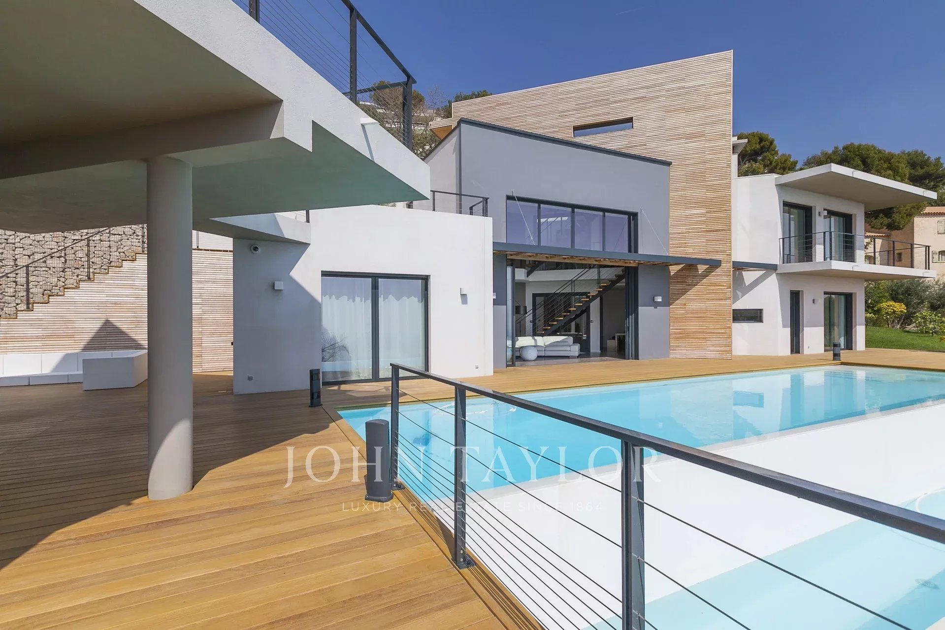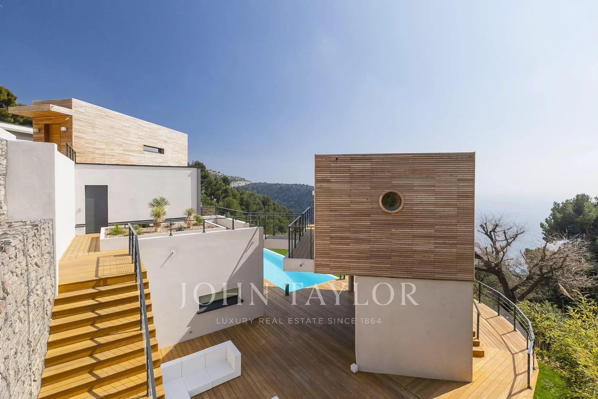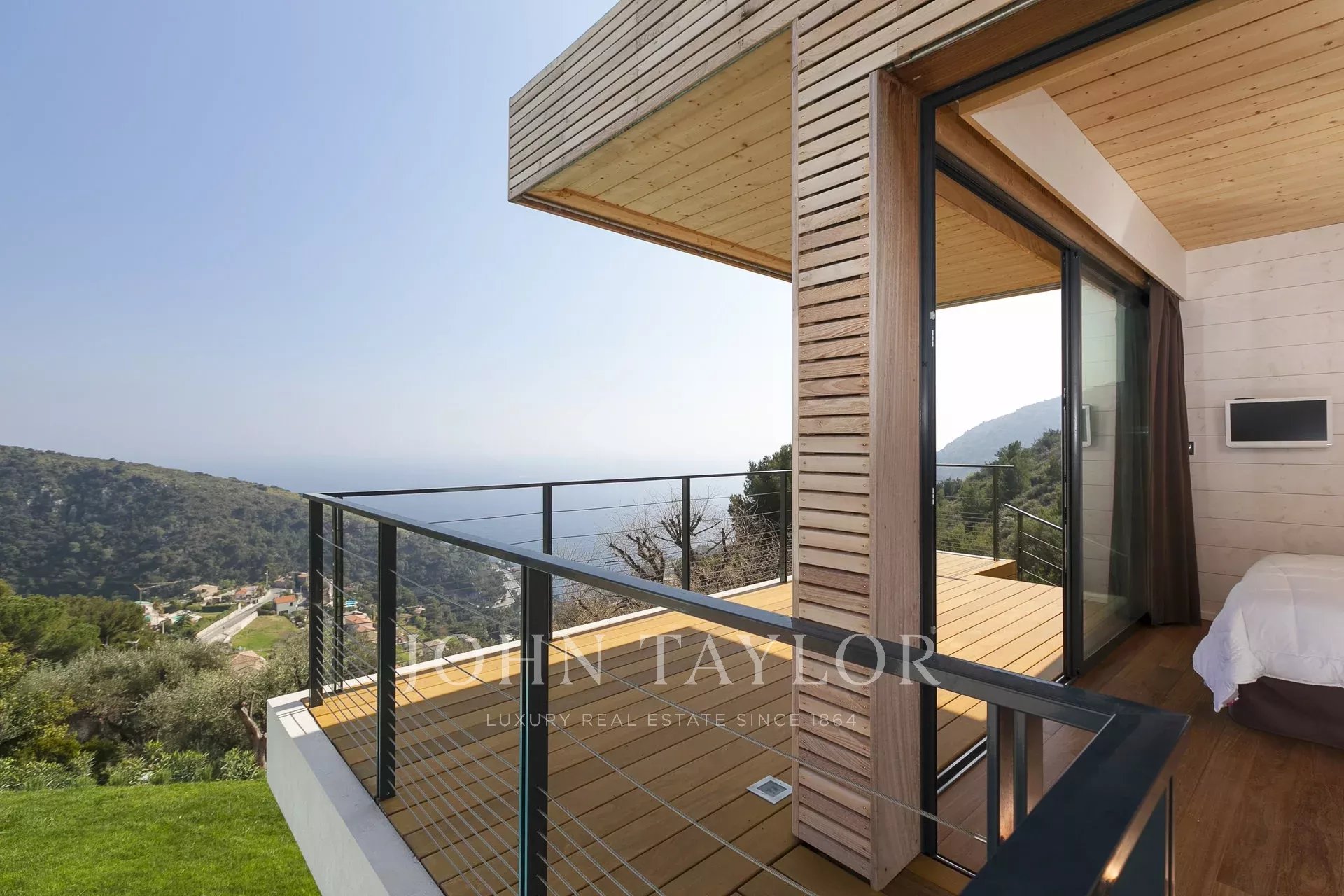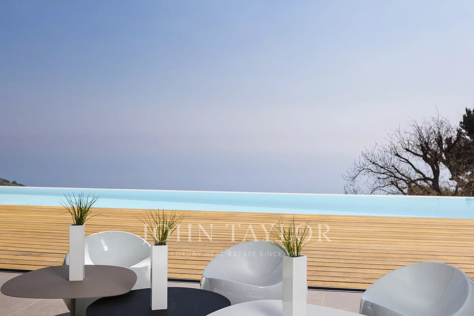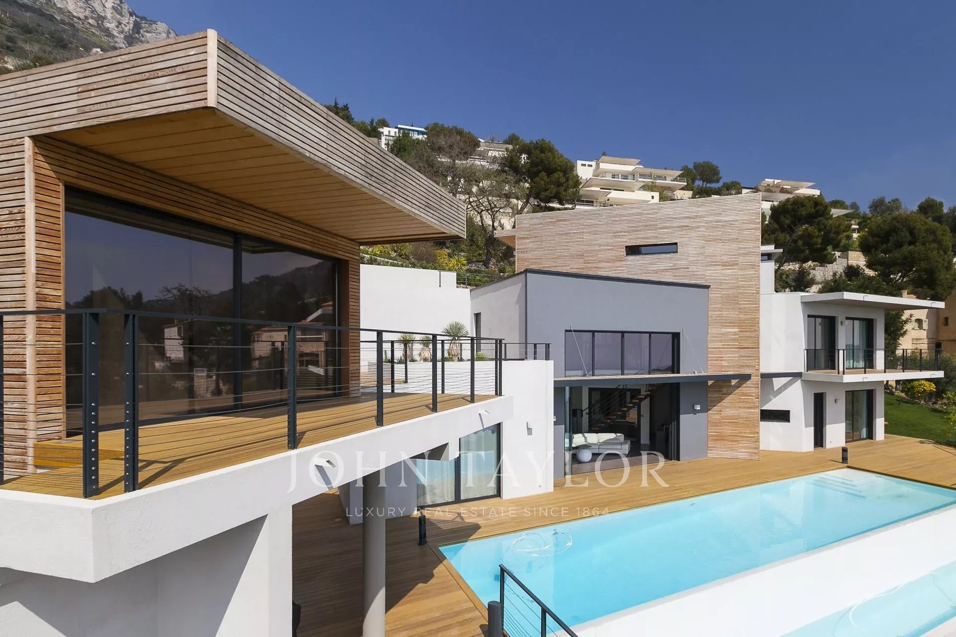 Superb contemporary villa of approximately 350 sq.m of living space set on a plot of land of approximately 2 200 sq.m, situated on the heights of Eze, in a residential area and offering a magnificent view over the sea and the hills. The villa consists of 5 bedrooms, each with a bath or shower room, a living room opening onto a large terrace with heated swimming pool, dining area, fully fitted kitchen with professional scullery.