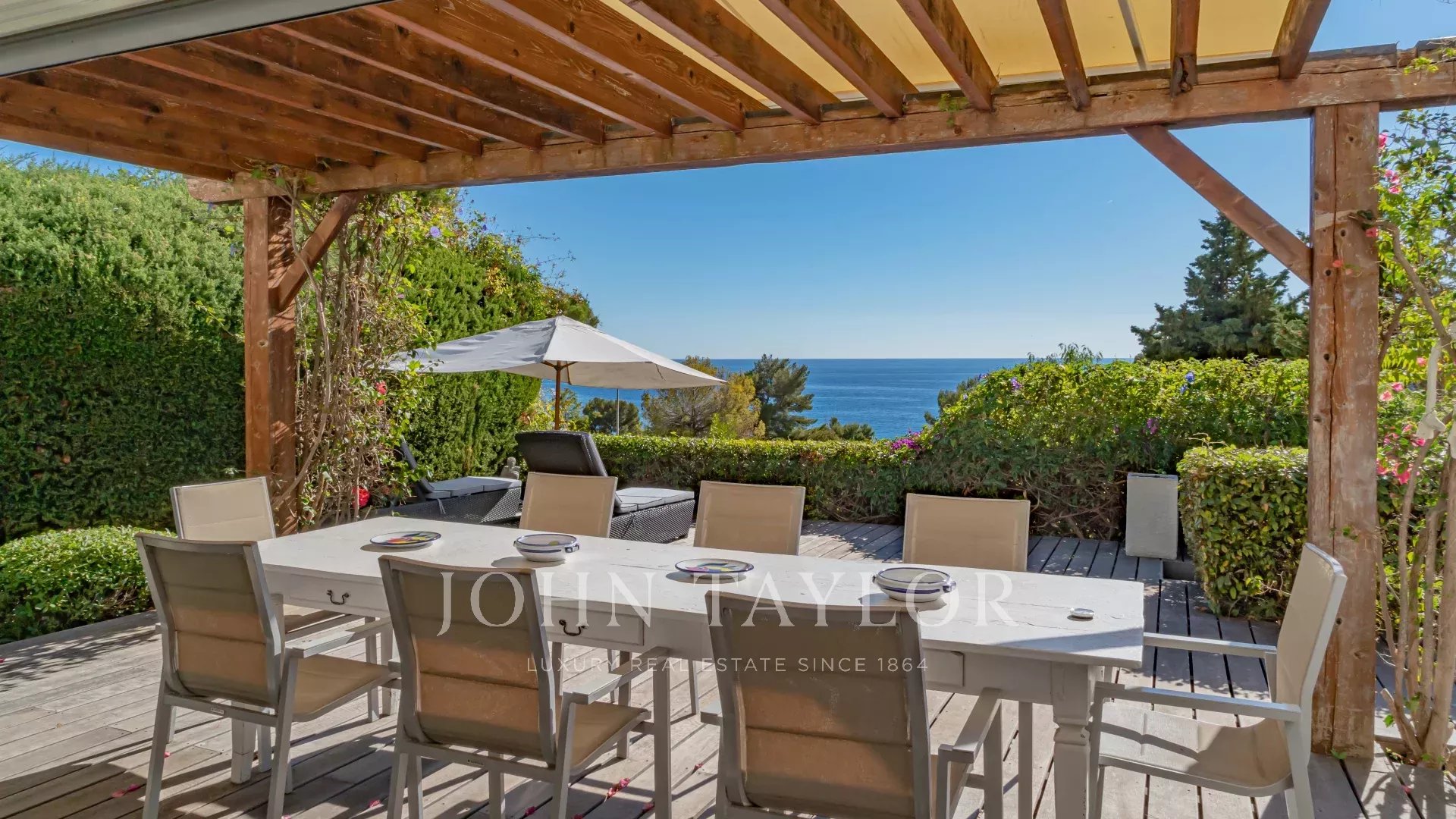 In a quiet residence with independent access, this elegant villa offers lovely sea views and is just a few steps from the beach at Èze bord de Mer, not far from Beaulieu-sur-Mer and Monaco.