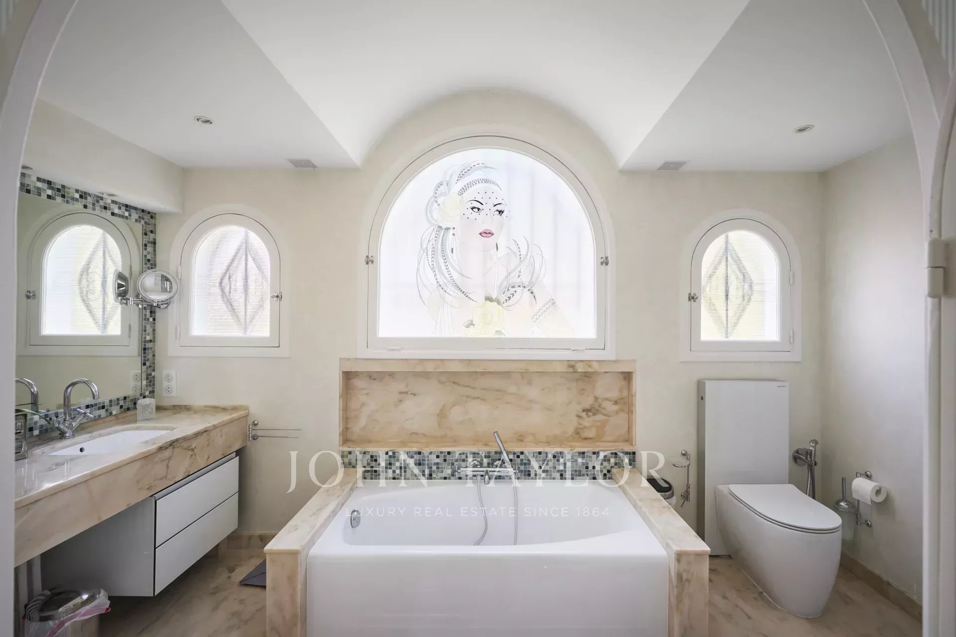 With covered parking for 2 vehicles, the property boasts 4 spacious bedrooms, each with its own private bathroom or shower room. The master suite features a dressing room, en-suite bathroom and direct access to a sunny terrace. An additional bedroom is reserved for staff, guaranteeing absolute comfort for its occupants.