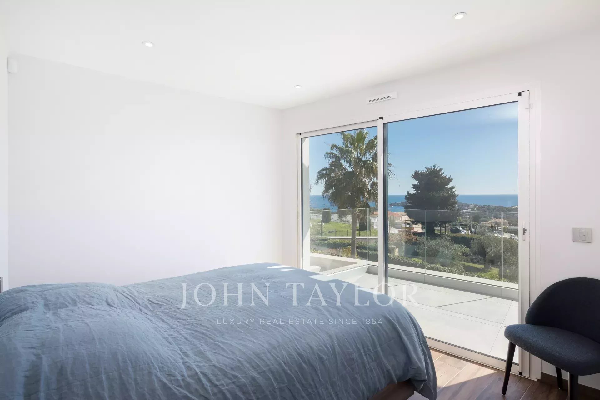 On the main level, opening onto the terrace, the garden and the swimming pool, a living-room with large bay windows allowing to take advantage of a beautiful sunshine, a dining area, a top-of-the-range American kitchen opening onto the terrace and the bar area, a superb master bedroom with its shower room as well as many storage spaces, a laundry room and guest toilets. All facing the sea.