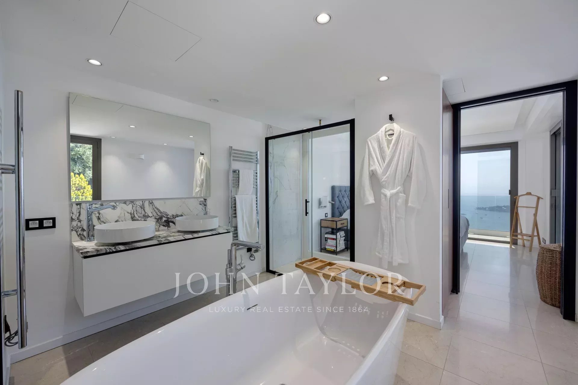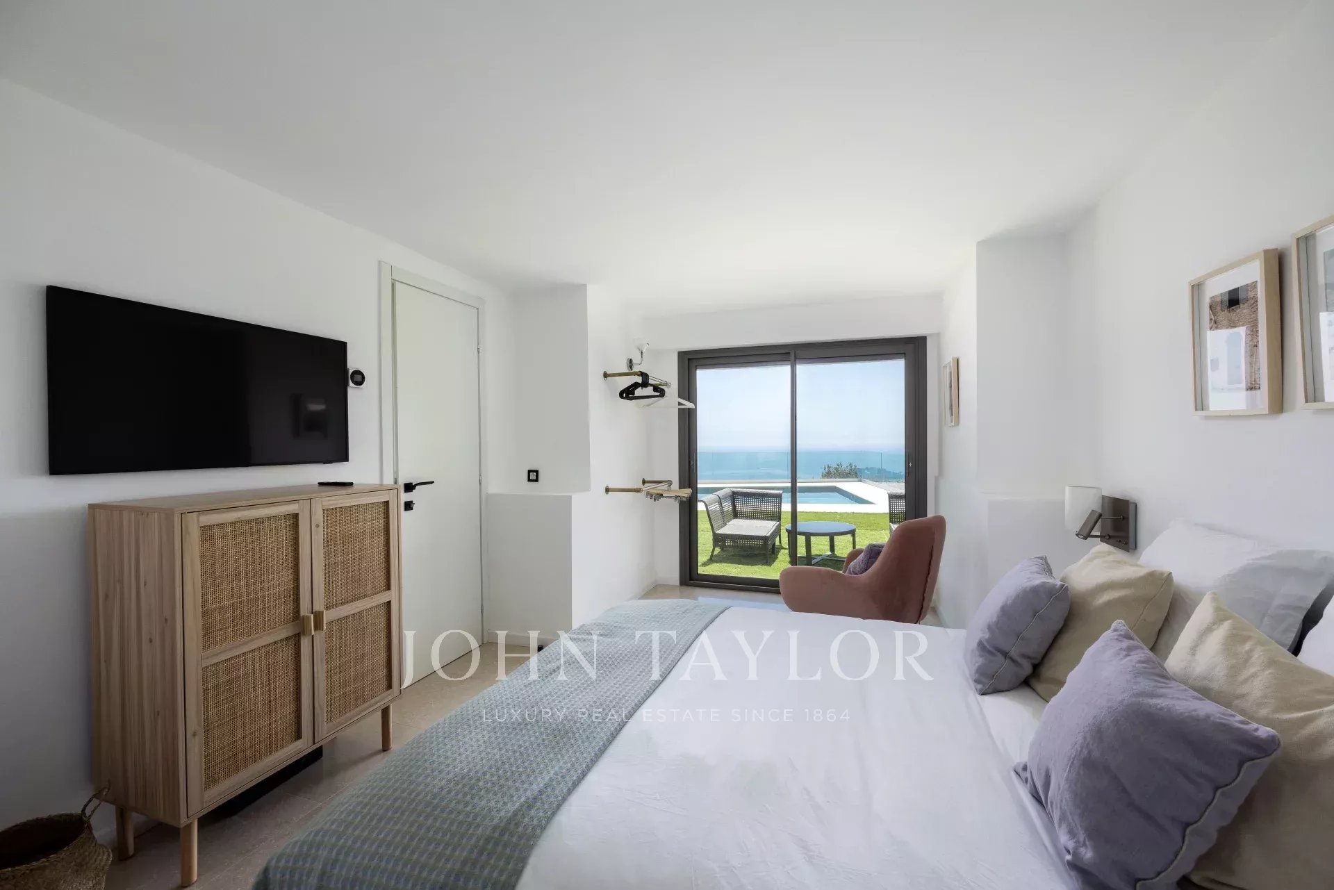 Swimming pool level: access by elevator or outside stairs: a hall, a shower room, a kitchenette, a living room, a bedroom with its own shower room, an extra bedroom with a convertible sofa bed, all opening onto the terrace and leading to the swimming pool.