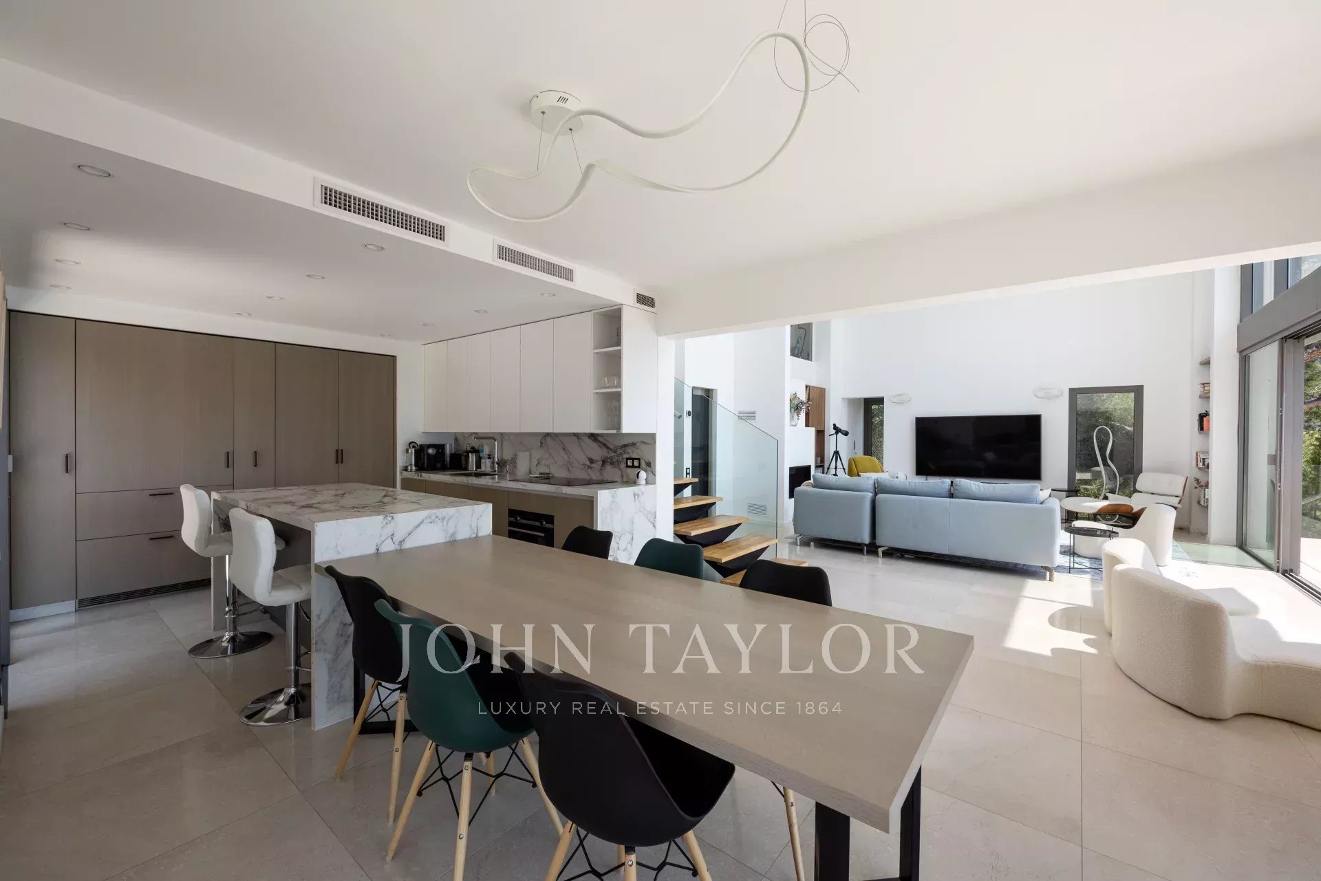 Level +2: living room with TV, dining area with fully equipped kitchen, opening onto a terrace with summer dining area.