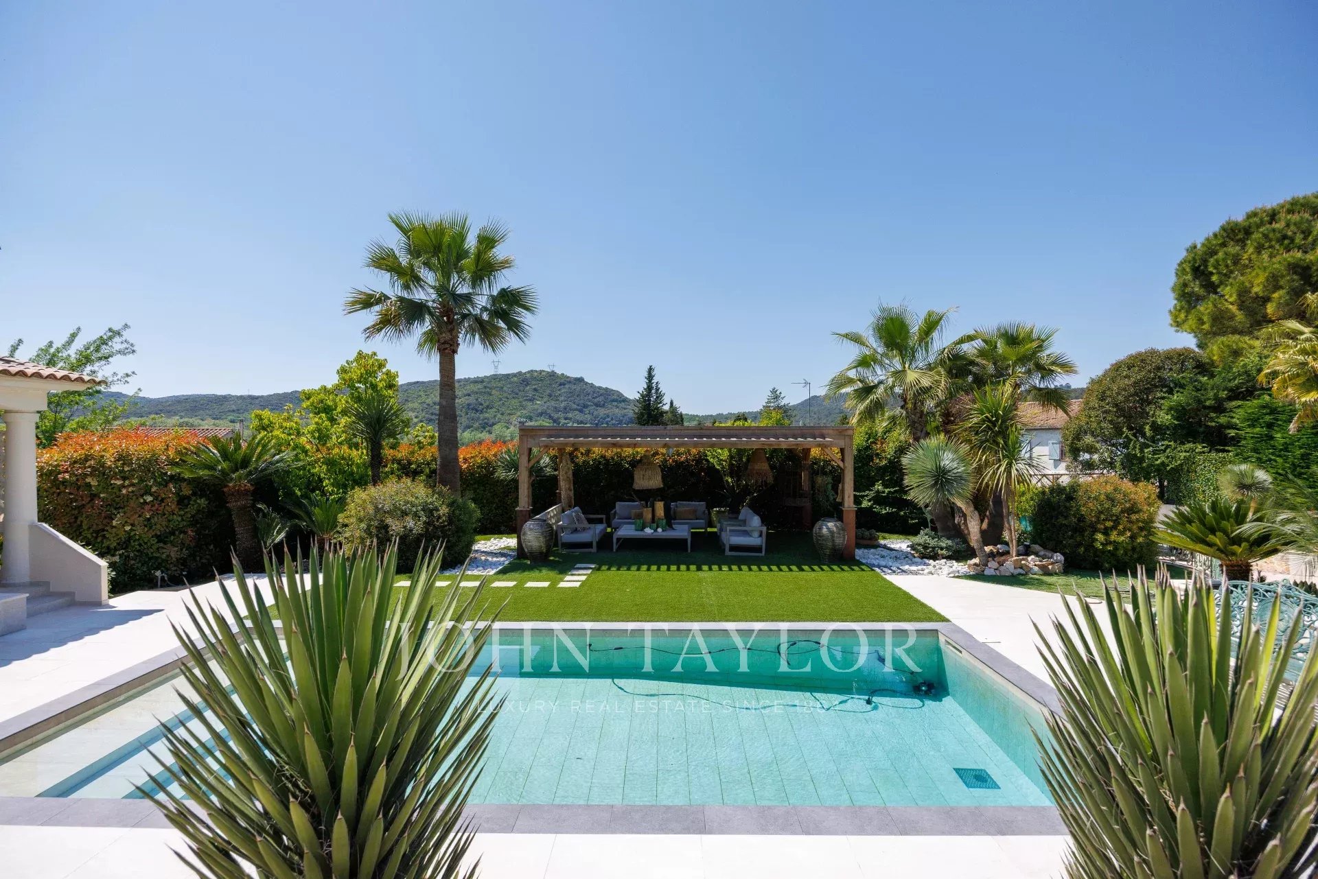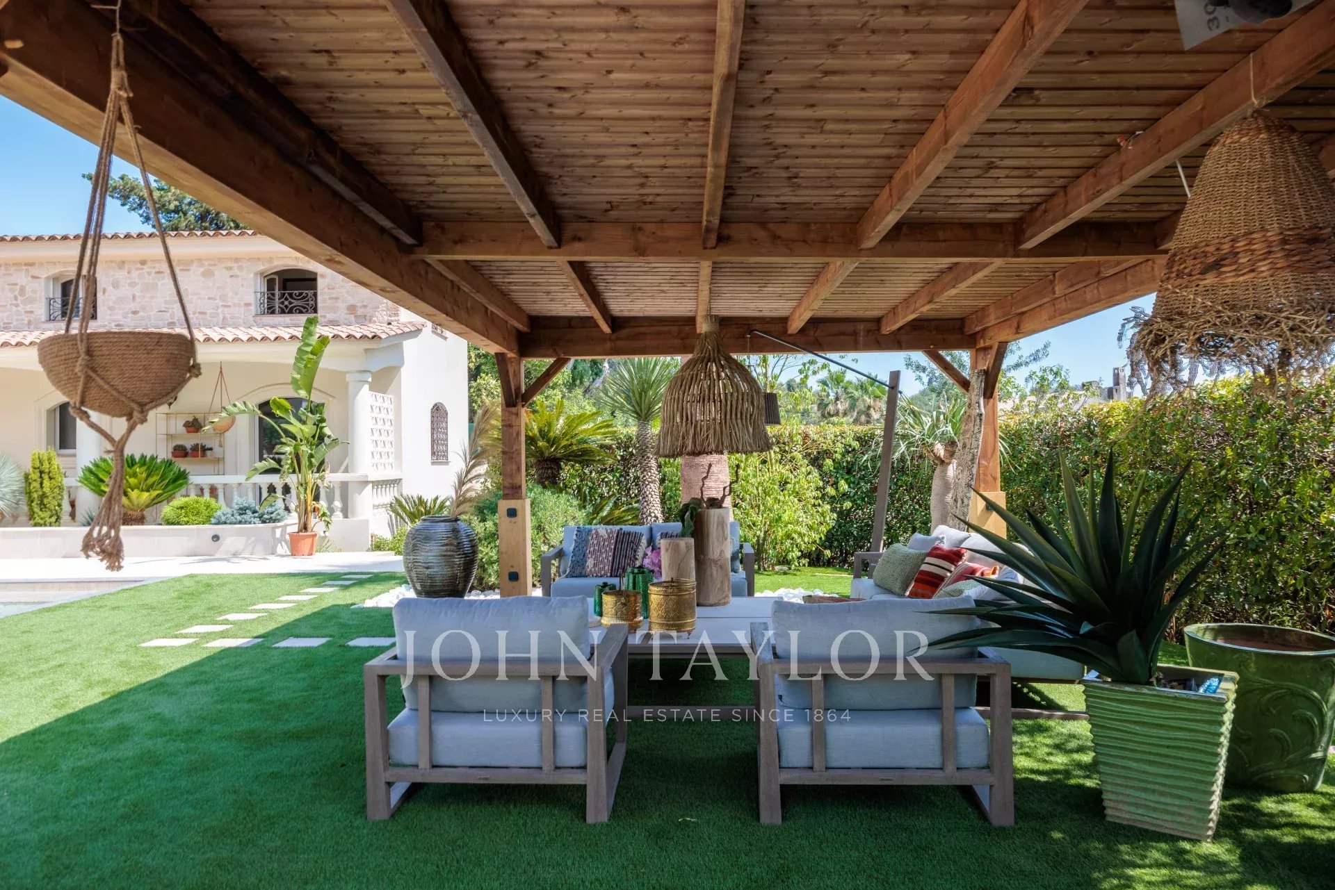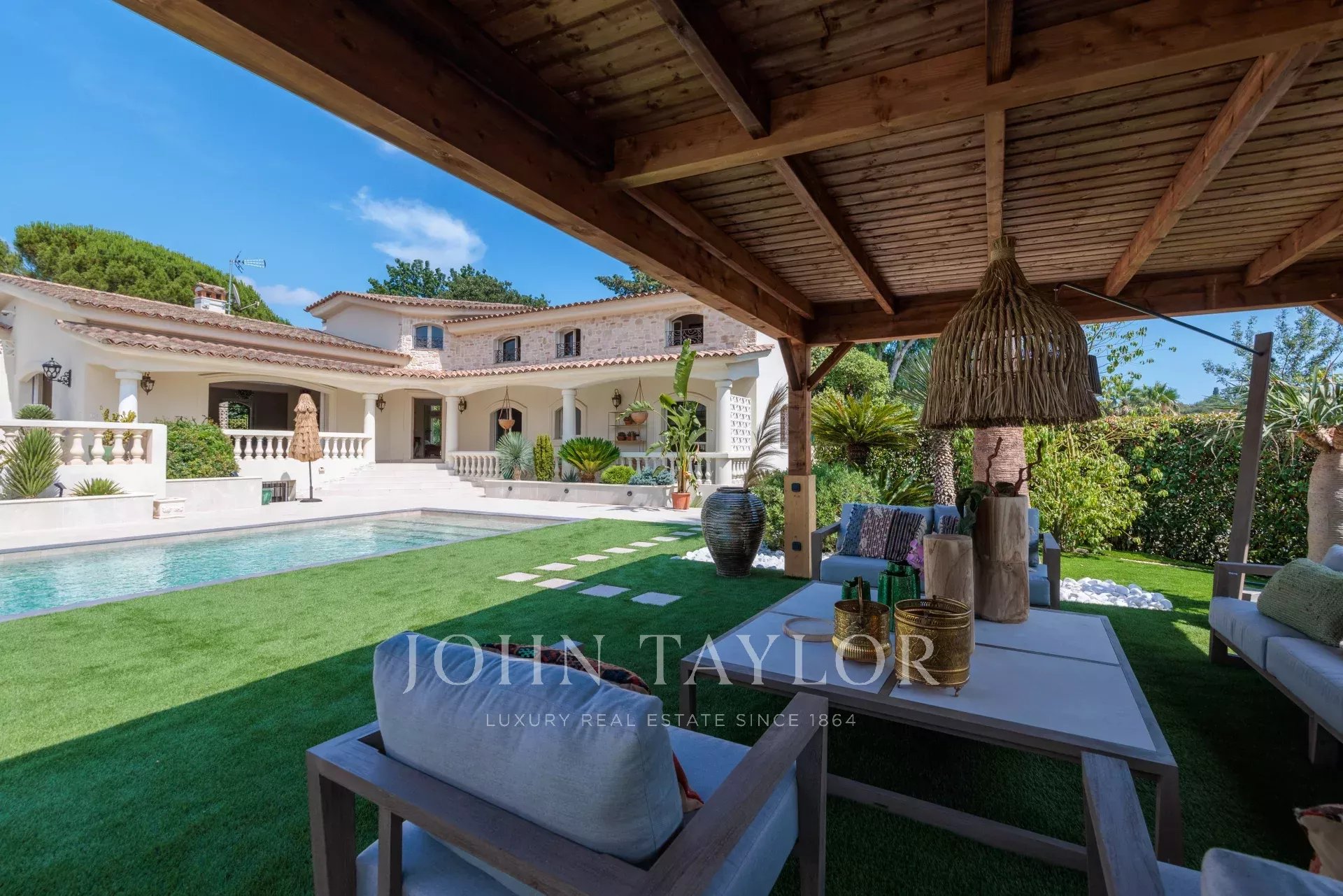 Pool house with large outdoor lounge sheltered under a pergola.