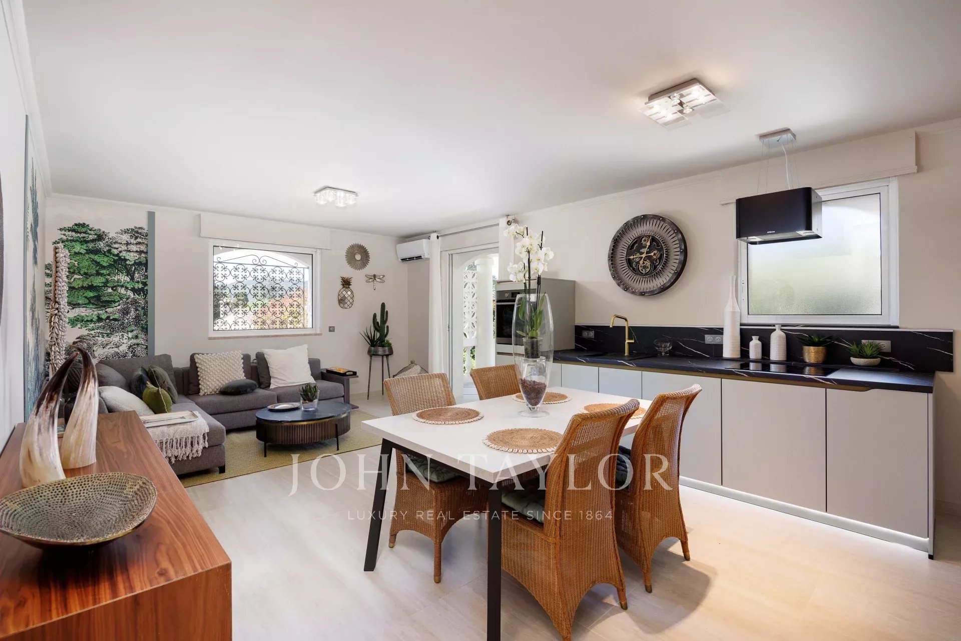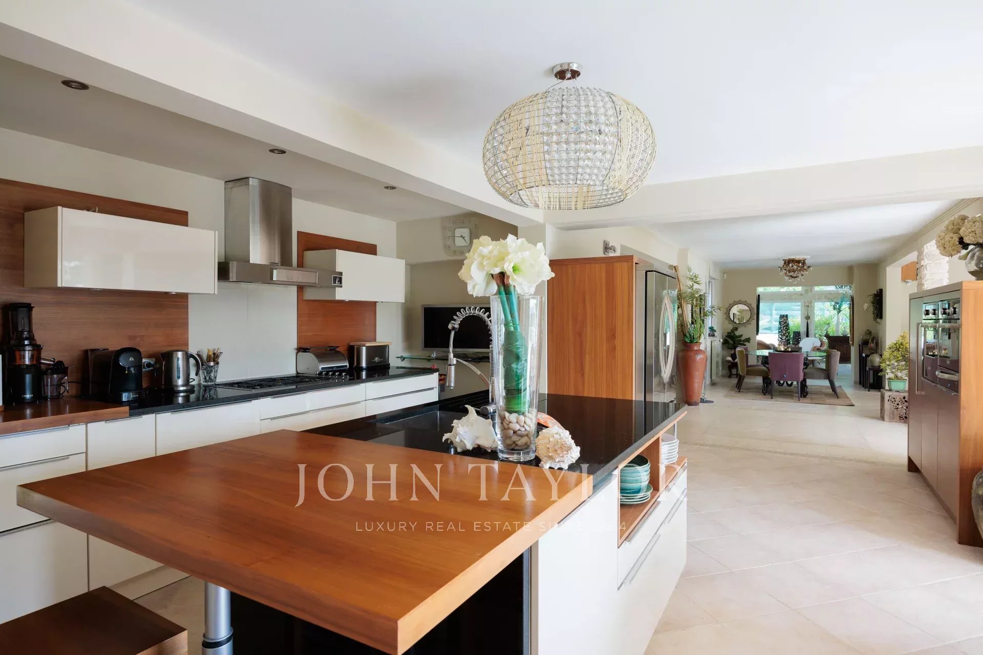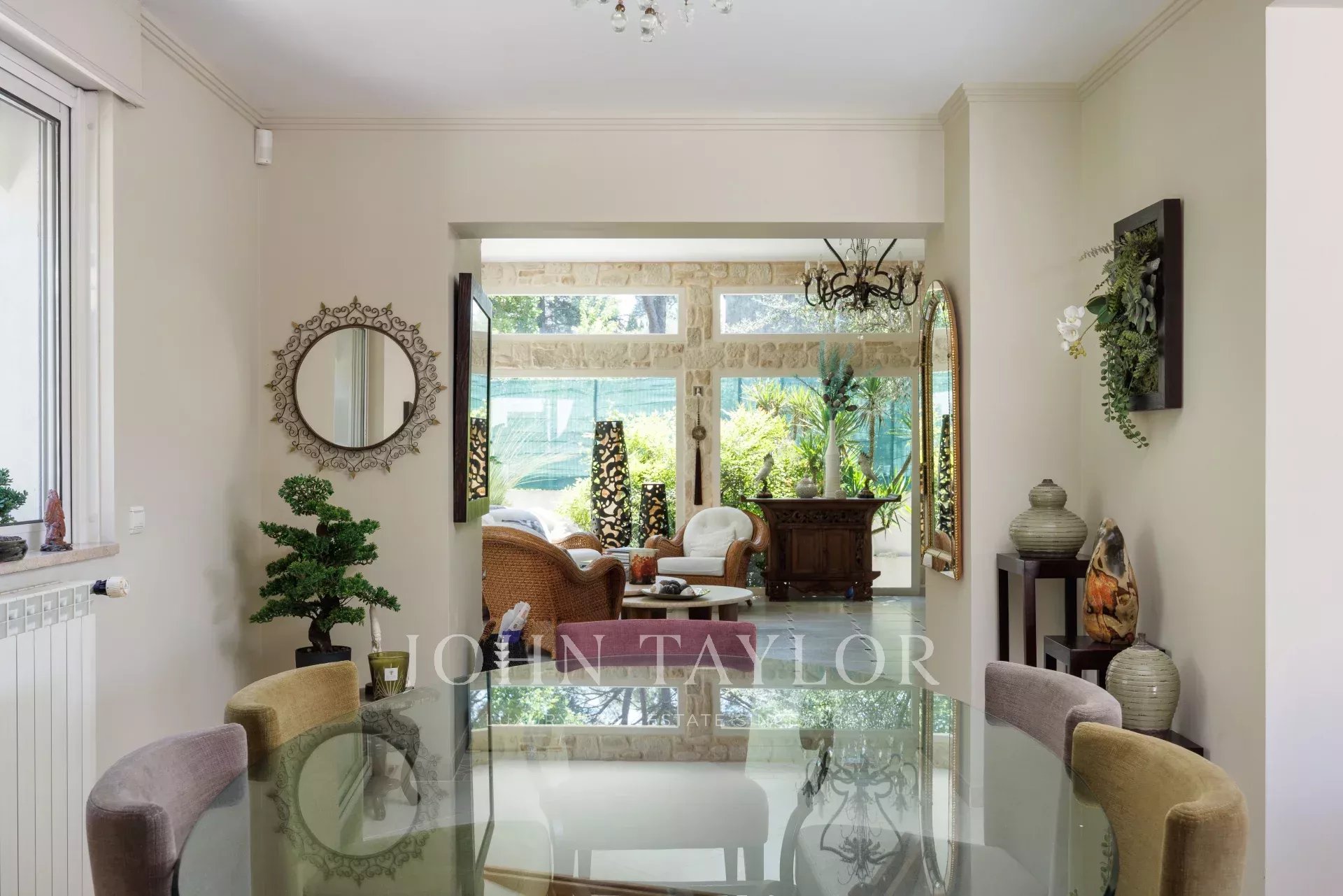 Elegant open-plan dining room seating 8-10 guests.