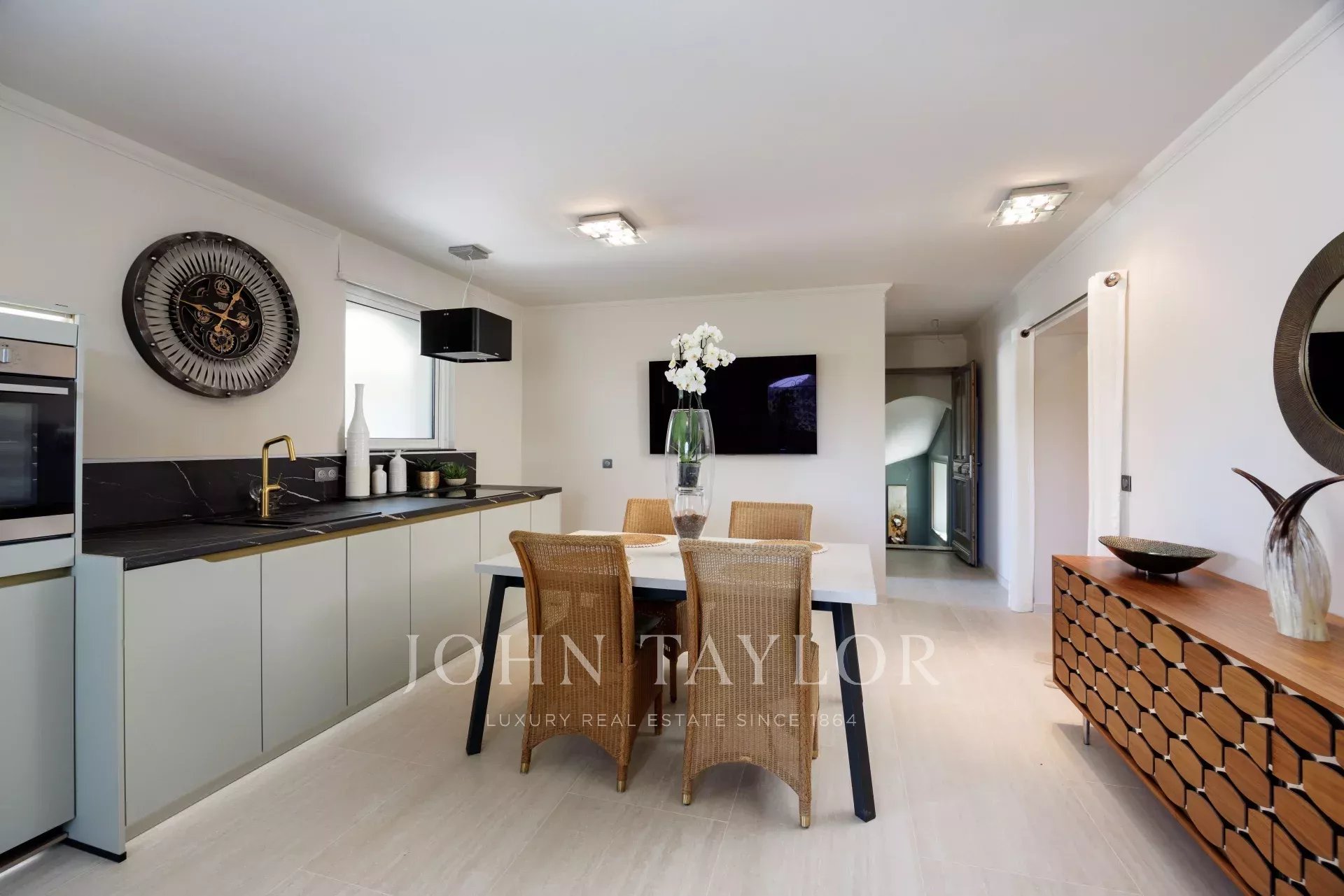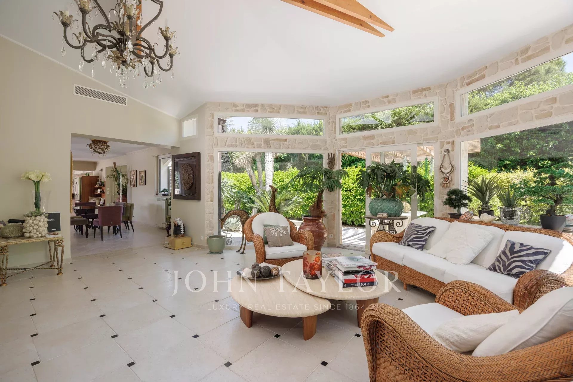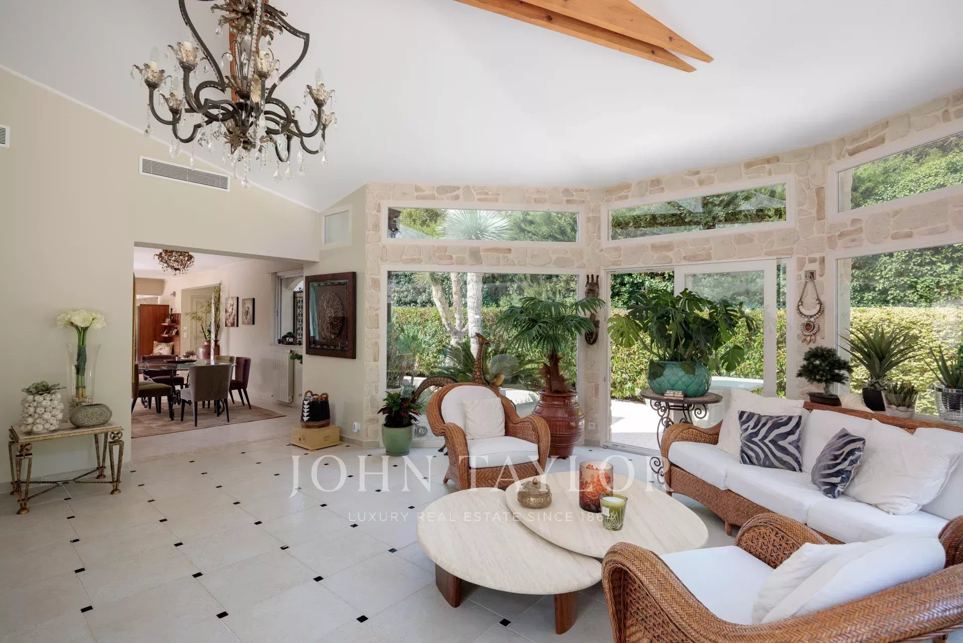 Elegant open-plan dining room seating 8-10 guests.