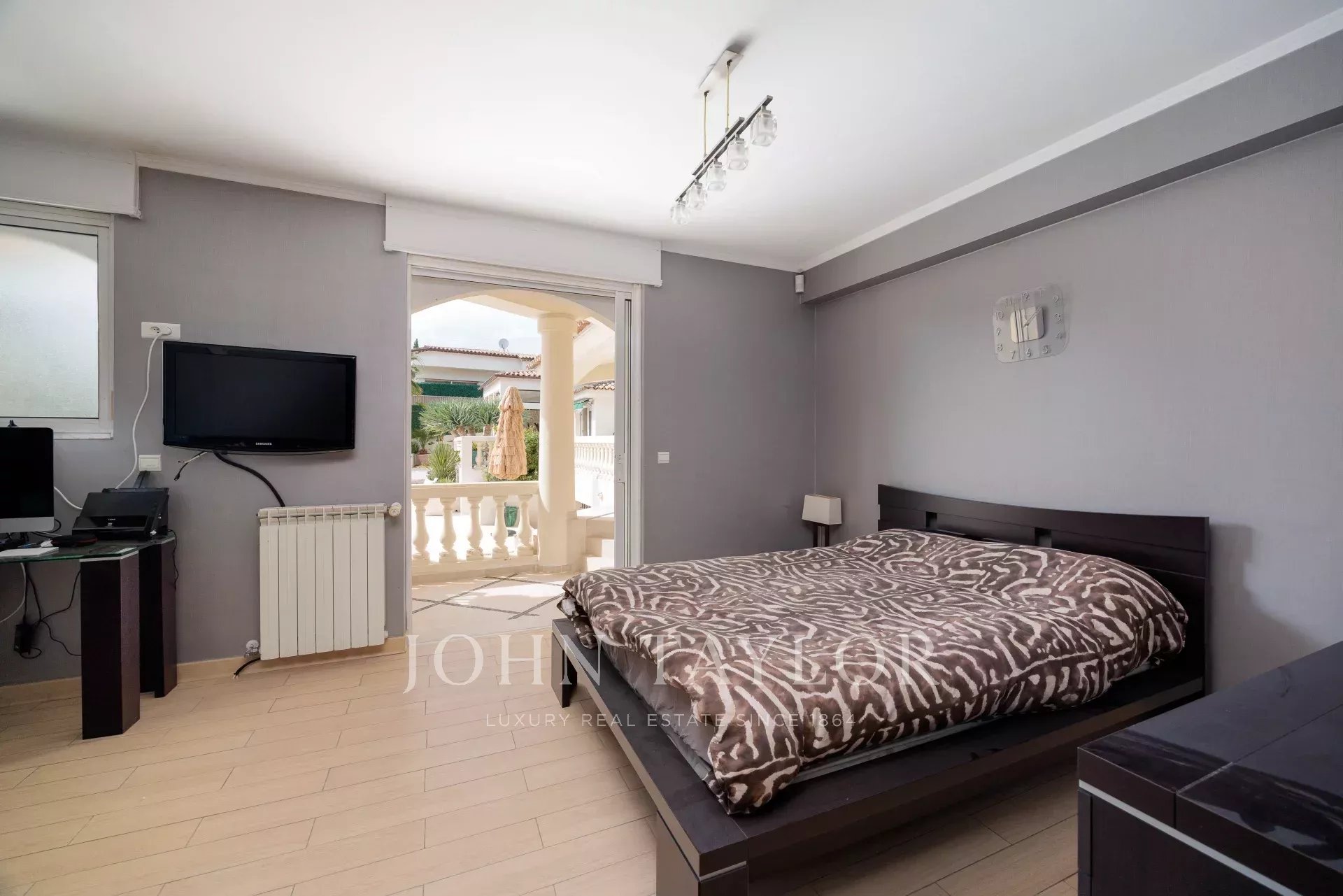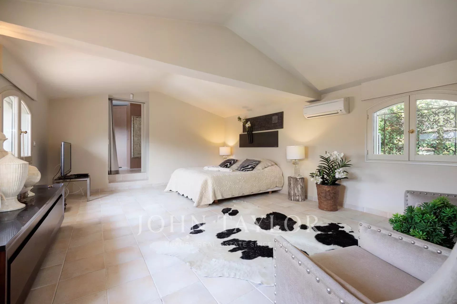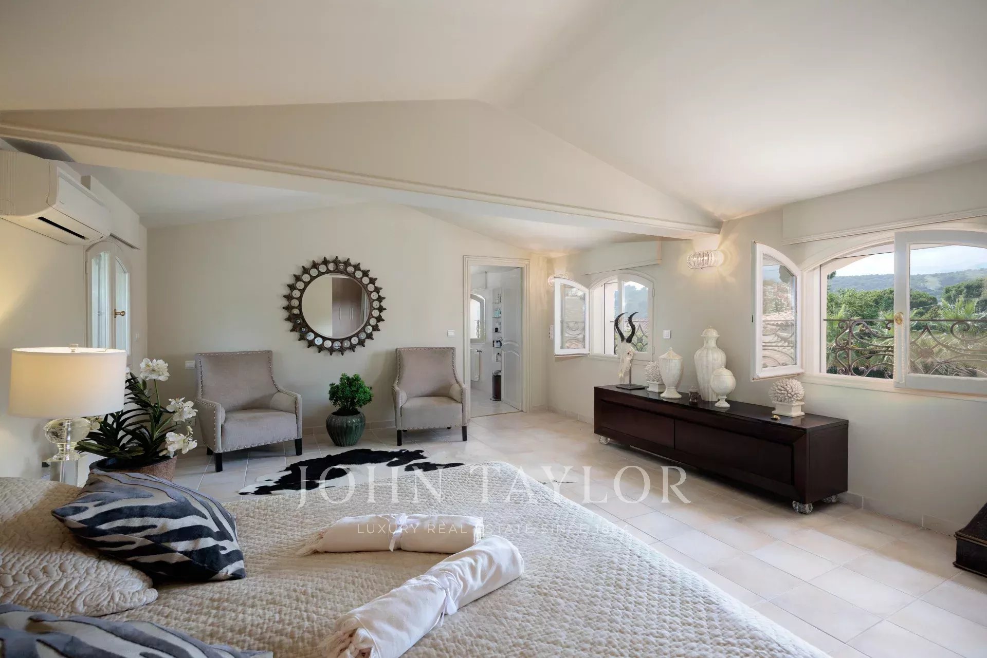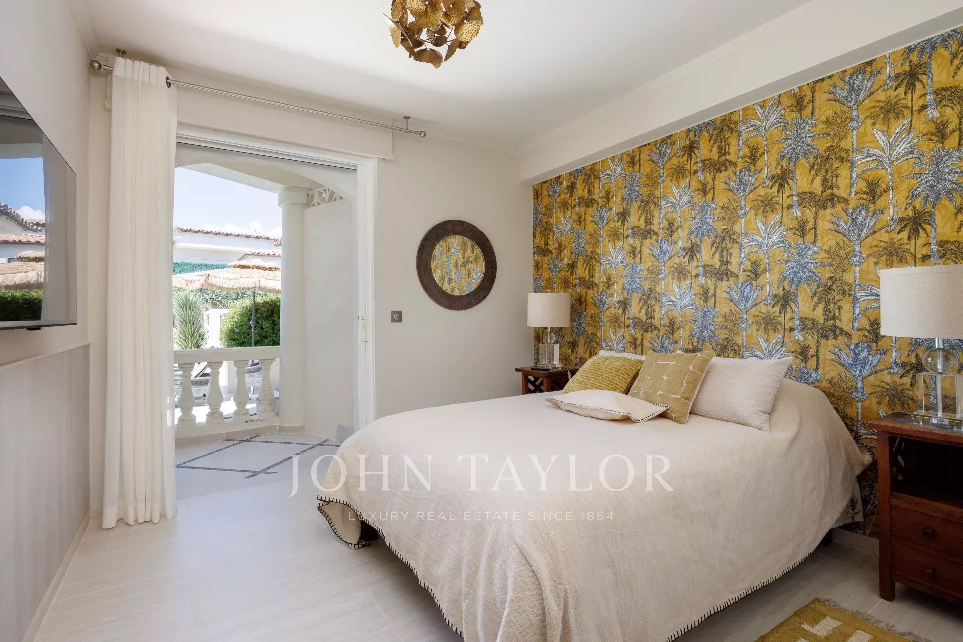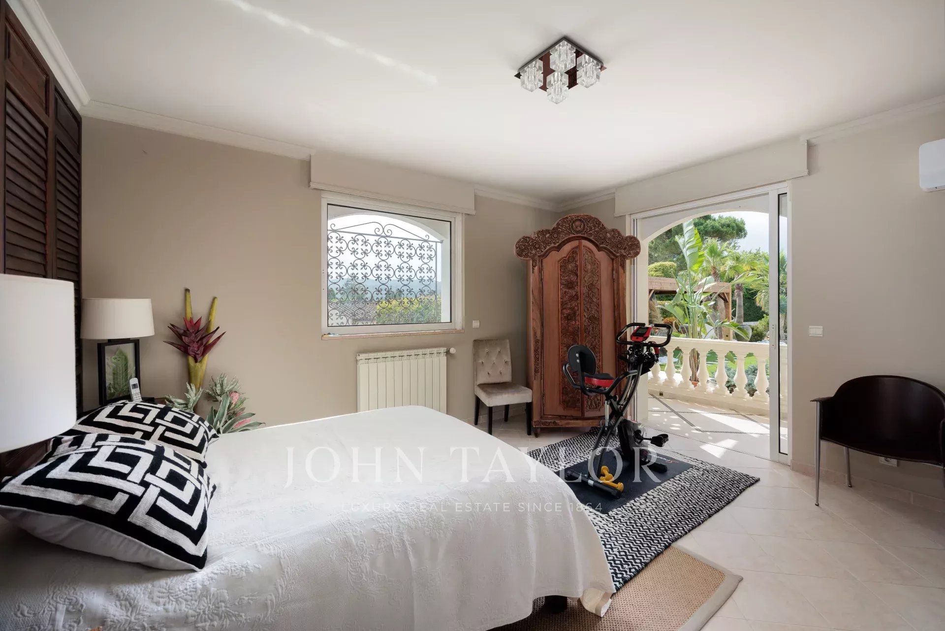 A bright bedroom with direct access to the terrace and pool, sharing a bathroom.